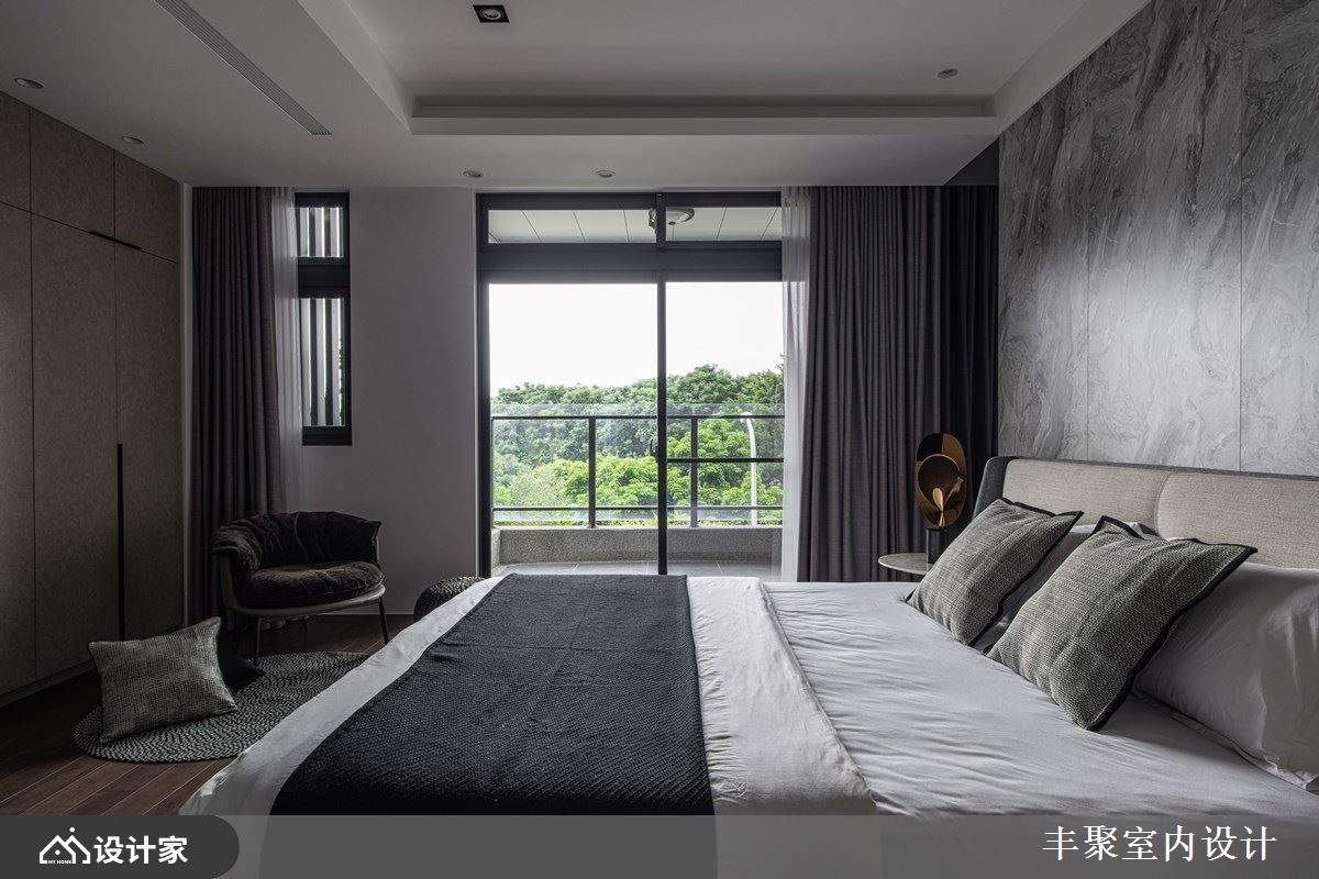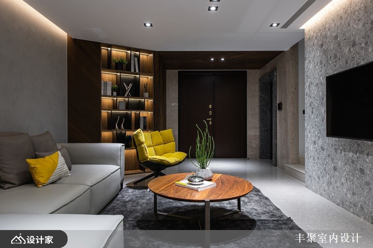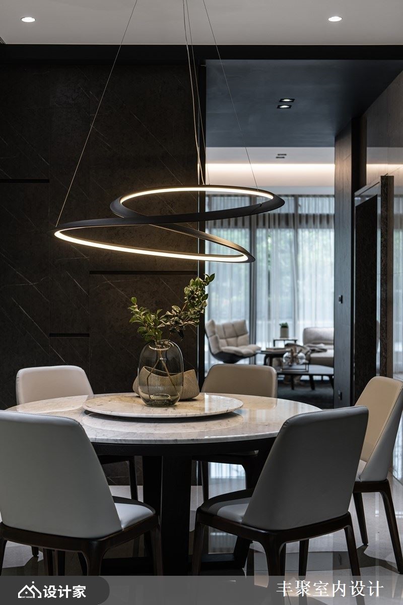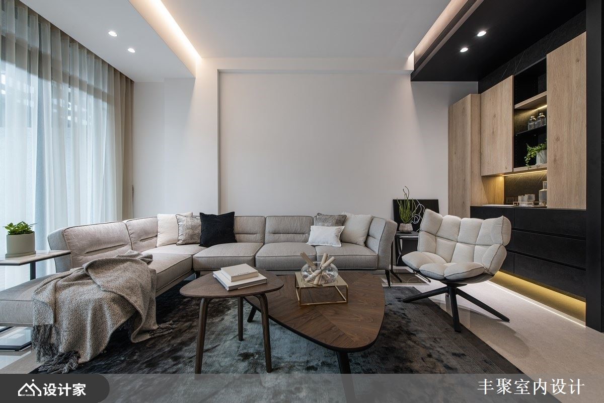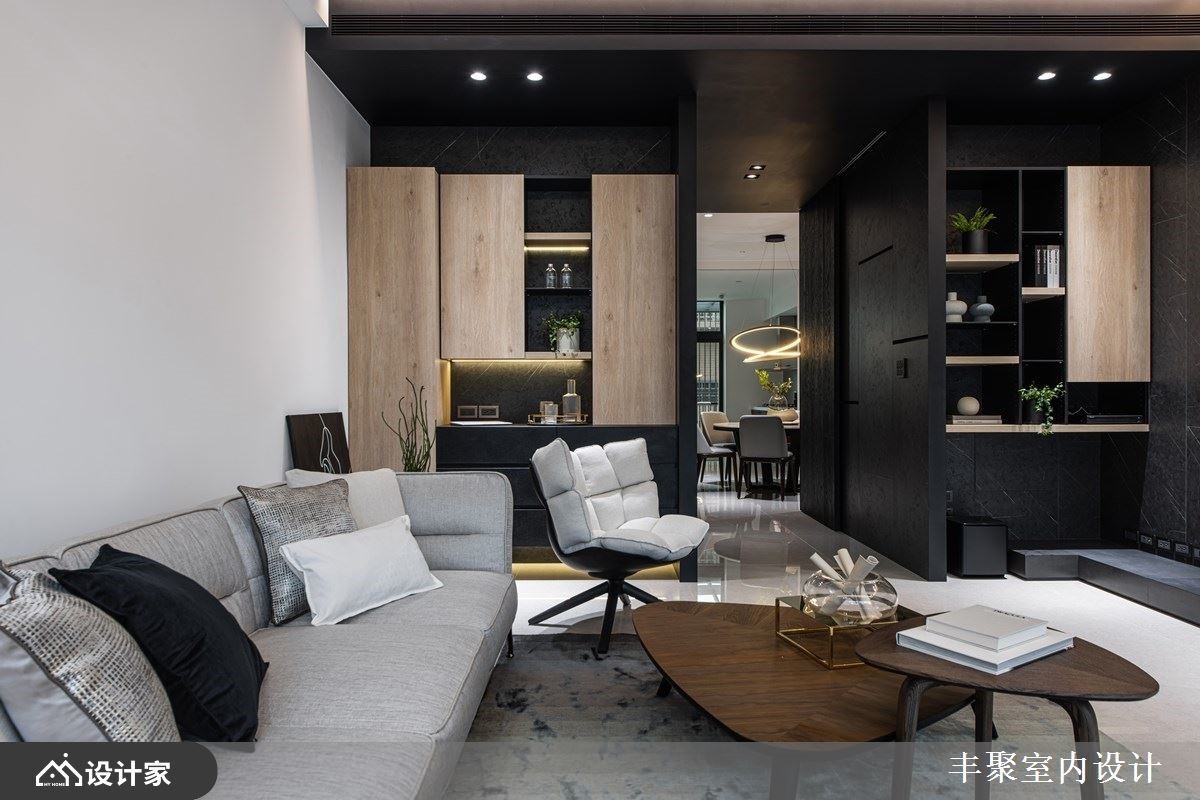 此间大户型作为年轻新婚夫妻的新生活起点,设计师维持了既定的格局,并透过设计和建材,让空间视野更为年轻化,透过低调奢华但不失活泼感的美学思维,打造出让屋主惊艳的现代风居家,快跟着小编一起来看看吧!一楼作为视听室使用,不只做为回家后转换心情的场域,也配置轻松的中岛吧台,成为接待亲友时的欢聚空间,并透过沉稳素朴的黑灰色为背景,搭配些许木质家具、柜体以及明亮的软件,让视觉瞬间跳出亮点;二楼则是客厅空间,赋予明亮宽广的格局视野,并串联餐厅、厨房的动线,创造充满互动感的情境,且在餐厅天花板悬挂进口餐吊灯,提升餐区的质感氛围;主卧室内,保留宽阔格局,在床头旁侧装饰镜面,再利用窗面纳入好采光与美景,让卧室空间感双倍延伸放大!小编的最爱 一楼视听室与二楼客厅皆着重美形收纳,藉由木工、系统板、灯光等复合混搭,让柜体突破制式模样,吸睛且深具层次,实用感与美感兼具!