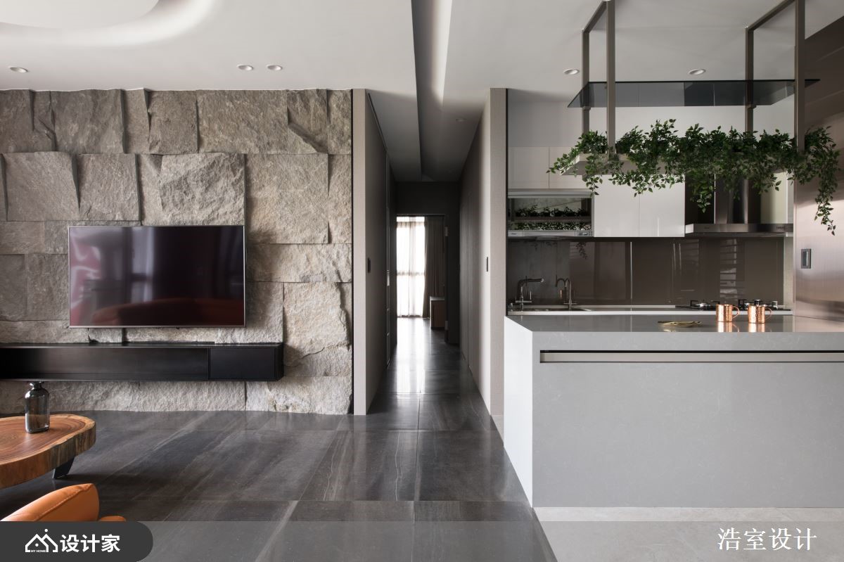 设计师承袭大户型得天独厚的地理位置,替空间打造 270 度无价美景,并采用铁件、观音石、镀钛、黑镜等建材,搭配现代风作为风格底蕴,创造一家四口的天伦之乐宅,快跟着小编一起来看看吧!门口处,因应着玄关的斜角格局,于地坪做出异材质差异,划出不同场域的范围,也梳理入门后的动线;客厅电视墙则铺叙大面积的深色石材,保留自然立体的造型,与户外的绿景形成呼应,替空间带入大自然的想象;天花造型加入了「土星」联想,在圆弧线条下引申浩瀚辽阔的天际场面;延伸至餐厅,则可见壁面的大面镀钛金属妆点,替空间增添时髦气氛,同时规划伸缩吧台,增加使用上的弹性,无论是用餐、小酌、迎宾都适用;主卧室在天花板缀点深色镜面,营造出精品饭店质感,适时地反射采光,让室内呈现高雅气质的氛围,使寝卧晋升成为家的艺术殿堂!小编的最爱 设计师藉由灰阶打底,以天然材质呼应窗外景致,冷调中不乏自然风韵,并结合家具、景观的融合,成功满足屋主愿望,完成一间顶级景观宅!