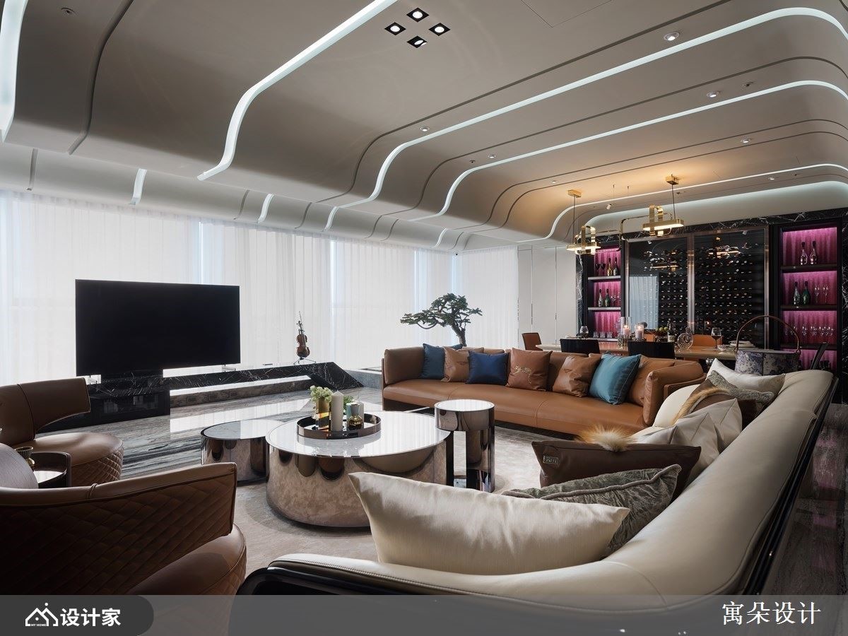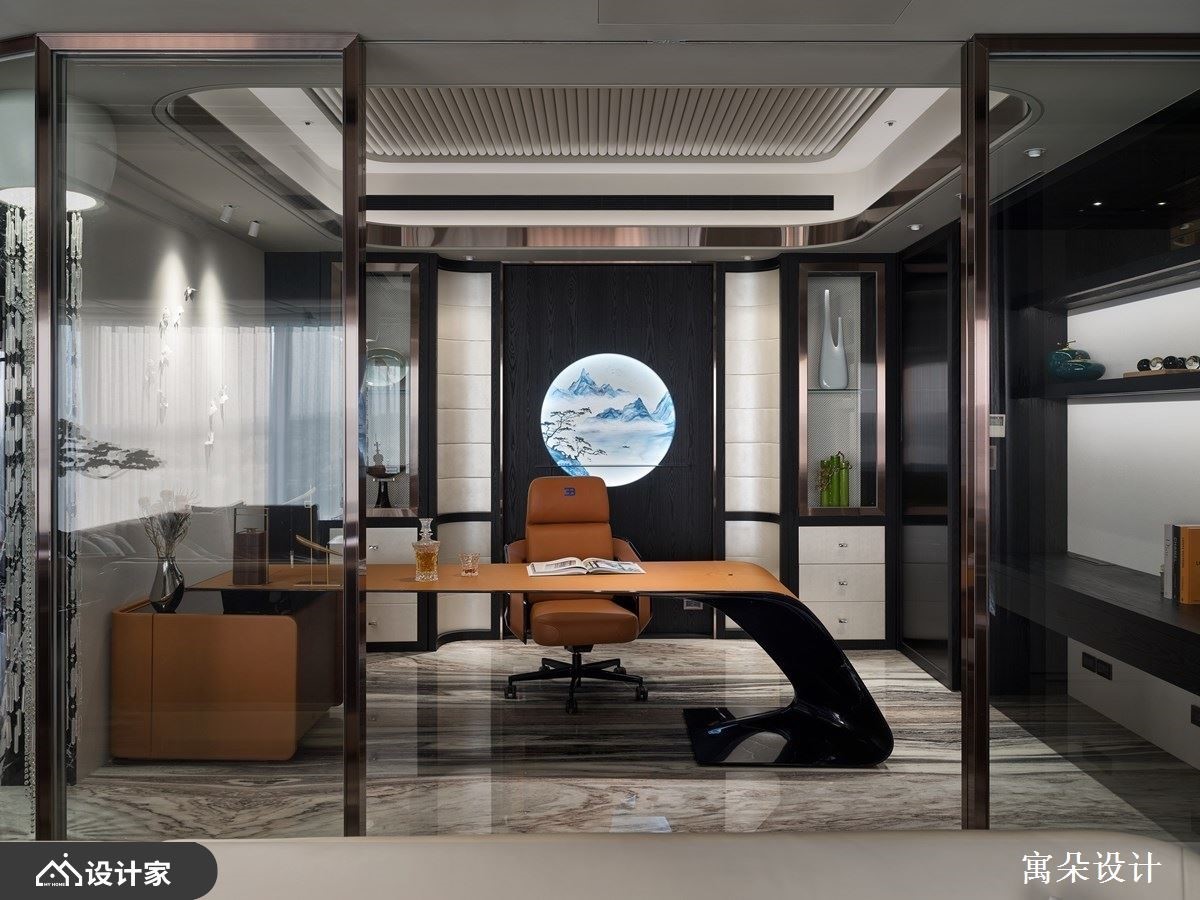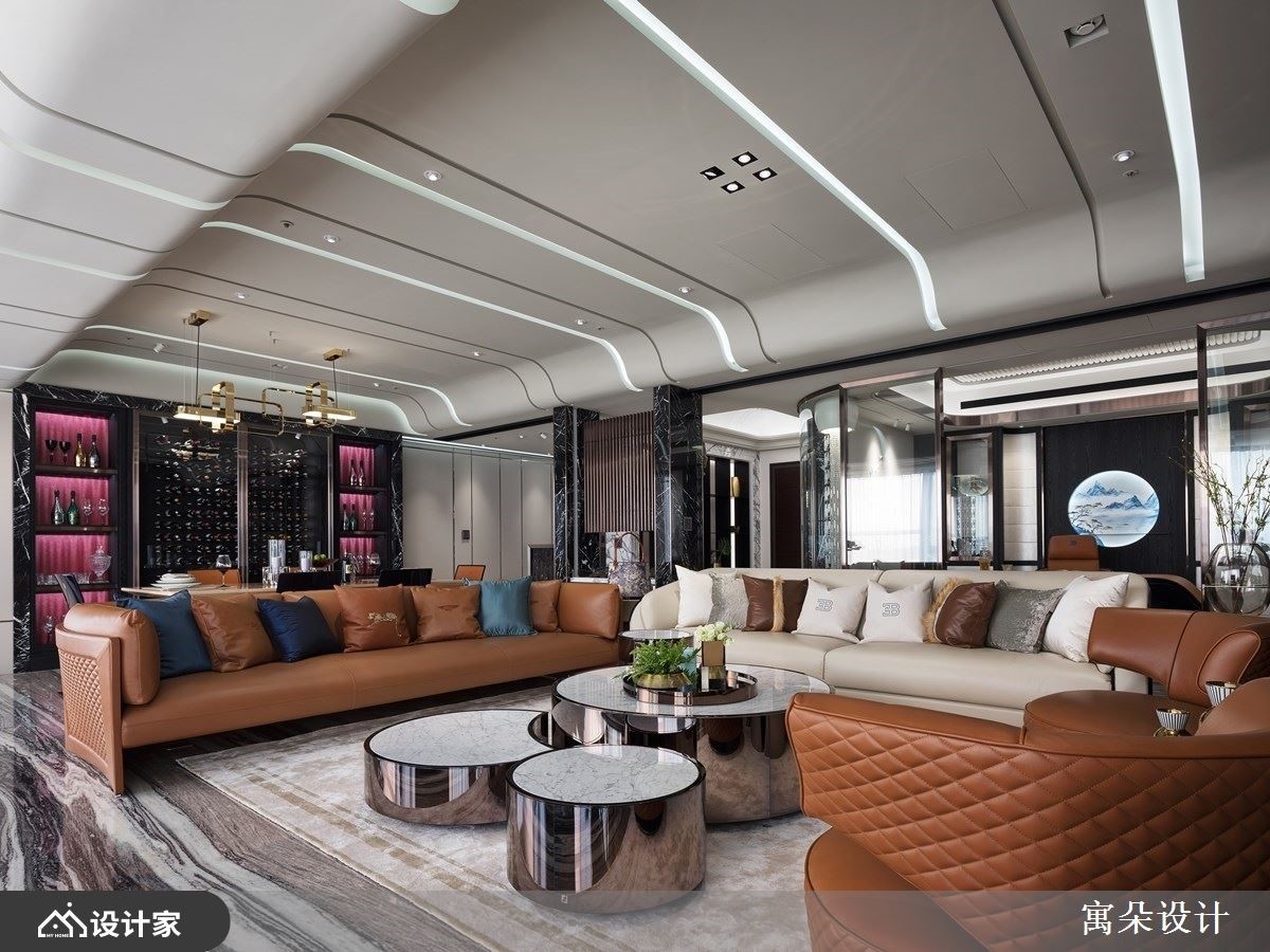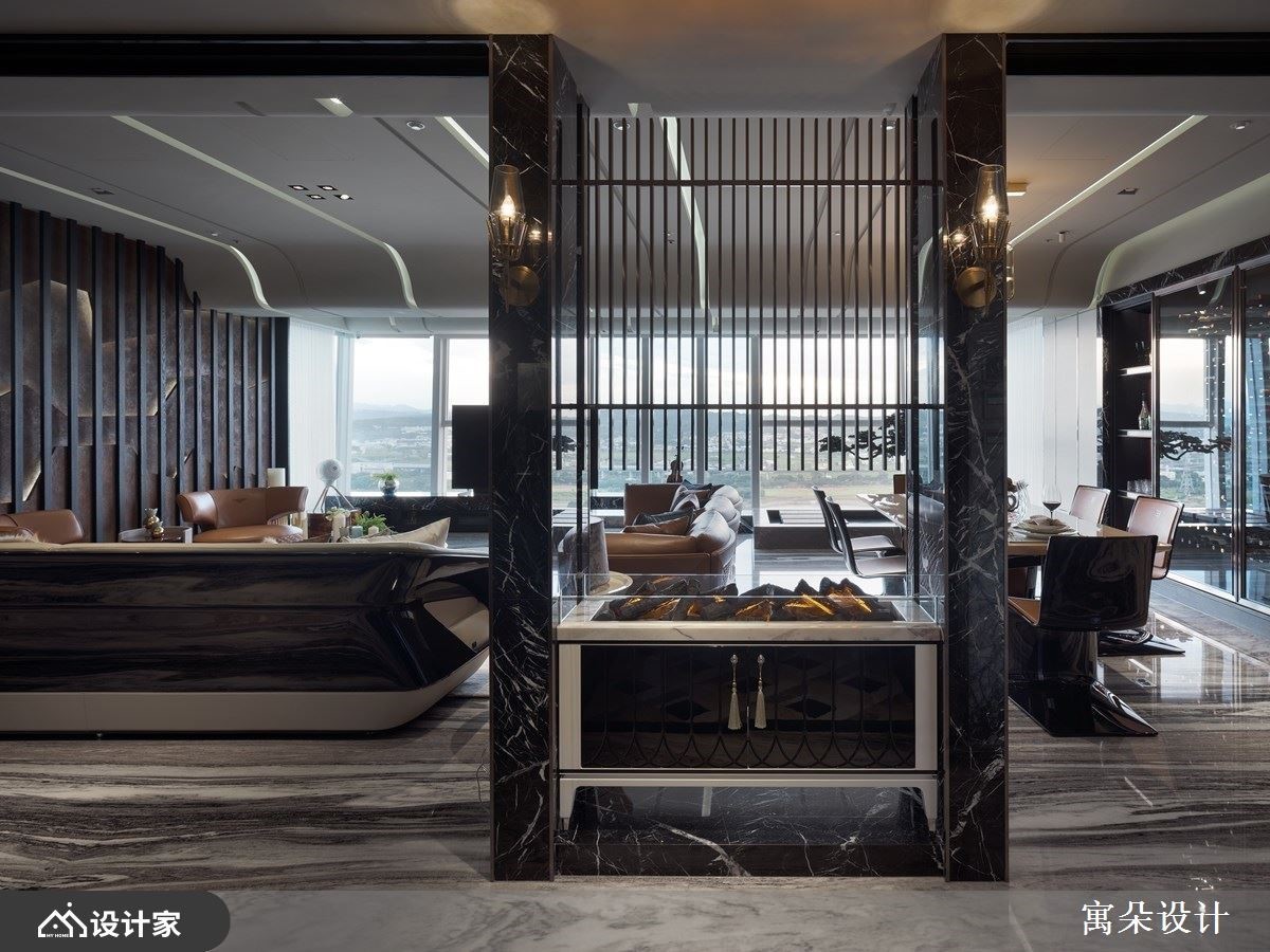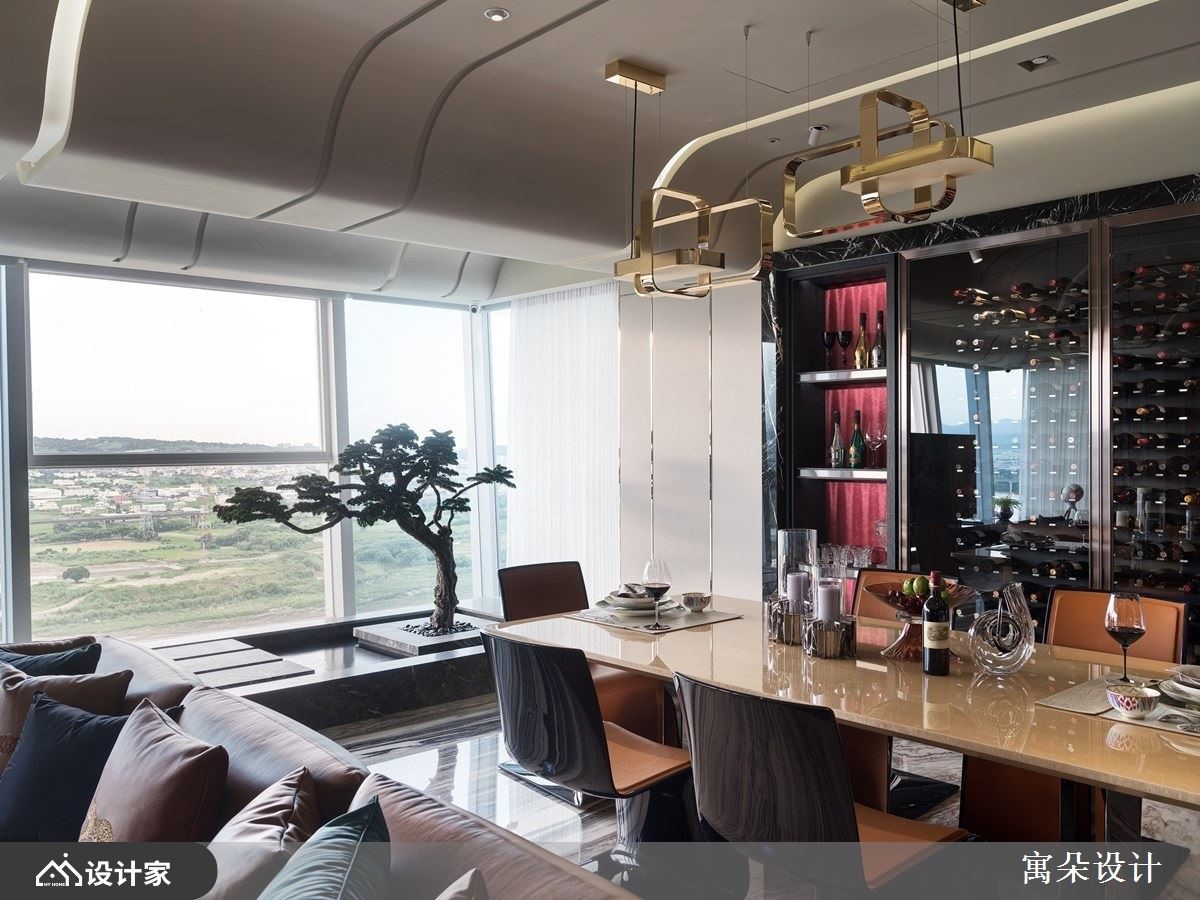 拥有独特美学品味的屋主,钟情于中式诗意的美学,也非常喜欢户外的一片自然风光。设计师藉由非凡的工艺技法,以中国风为核心,透过利落的线条串连起精彩的设计细节,且呼应户外的风景雅致,让室内外皆景。入室后的玄关,以弧形线板拉出挑高的天际线,交织出的菱格纹状线条与地板上大理石材相互辉映;一侧以铁件勾勒出收纳造型柜,摆设屋主的中式艺术品,另一侧则以典雅线板描绘出古典味道的鞋柜。接着利用虚实相兼、具有屏隔功能的设计,界定出内外领域,上方以格栅线调,让视觉穿透且延伸至窗外绿意,下方则结合壁炉与精致矮柜,创造奢华意象。客厅里,流线型天花板展现一抹韵律感,无刻意打造电视墙,让电视自然摆设在临窗处,一旁辅以流水、树木的造景,呼应户外风光,坐在沙发上刚好可尽情欣赏,心旷神怡;书房空间,利用皮革材质创造出轻薄、流线型的书桌,背墙的中央嵌入山水意象,调和出古典又不失时尚味道,且具人文的温润质感。小编的最爱餐桌的主体墙上打造整面红酒柜,透过玻璃隔间,背景衬上抢眼的红色调,宛若精品般的陈列,满足屋主对美酒佳酿的珍藏。