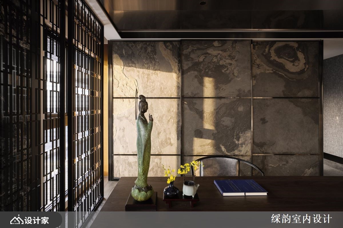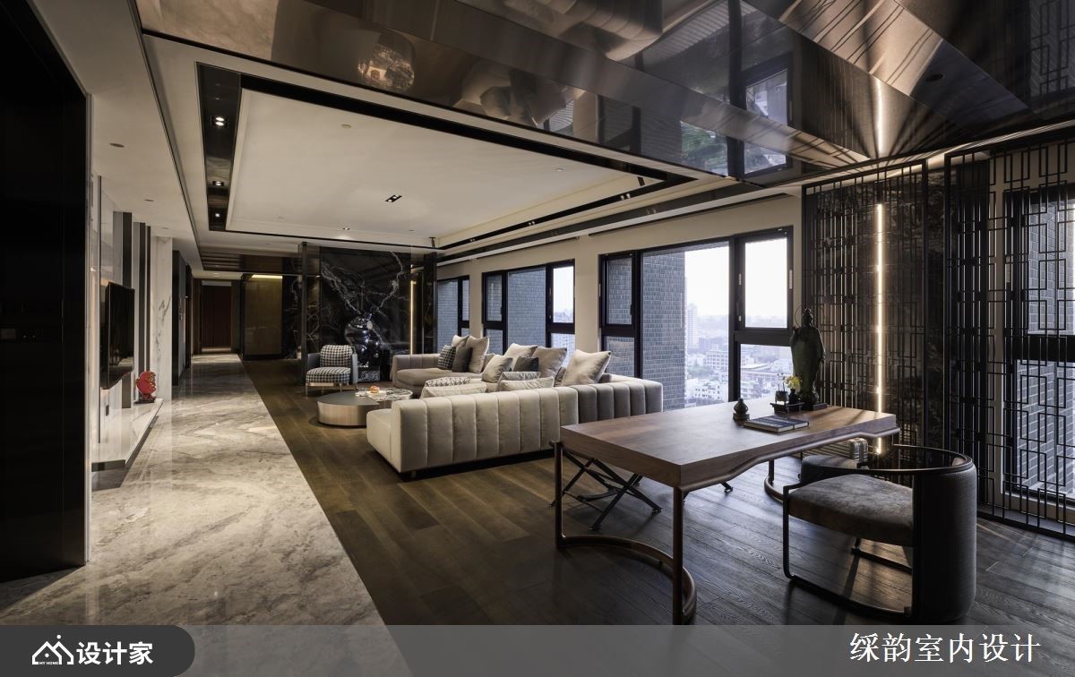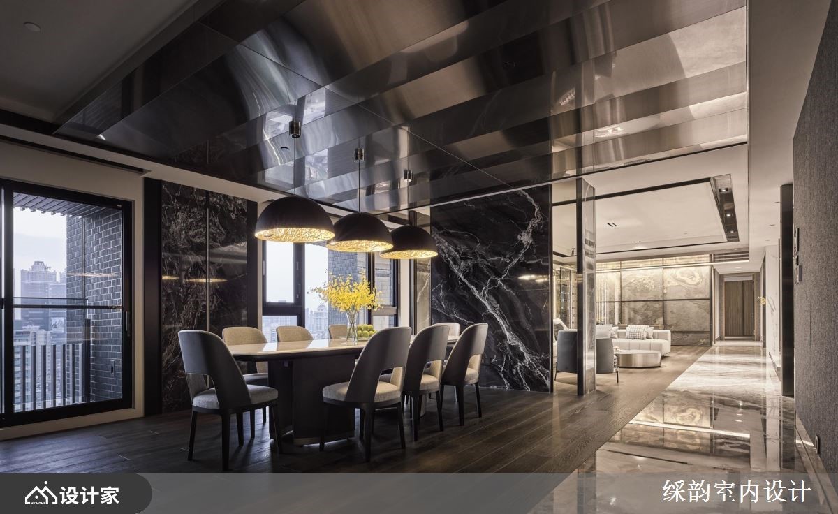 敞朗日光随着落地窗走进室内,照亮开放格局里的毎个迷人细节,像是烘托石材鲜明肌理、金属光泽的线性思维,以及局部以镜面妆点,映照出轩昂大器的豪邸气势,品味奢华时尚!此案为长型屋,开放的隔局规划下,以深色木纹铺设核心地坪,让客厅、书房与餐厅相融一室,客厅与餐厅之间则藉由造型屏隔巧妙界定。客厅电视墙以白色大理石为基底,镀钛勾勒出不规则的线条,替大面积的墙体营造出渐层视感;一旁的开放书房区,天花板以曲折镜面的方式呈现,彷佛波光粼漓的意象,临窗以中式窗棂的安排,桌上摆设观音雕塑,营造出清幽禅意的书香领域。餐厅空间里,两侧以深色大理石意象搭佐夸张线条的屏风包围,天花板局部贴覆长条镜面,反射与延伸出日光天影的效果,伴随三展弧型吊灯,别有一番风情。公领域的侧边则安排大理石地坪,描绘出空间的廊道,反射出洁白光感,且与电视墙相互辉映,同时铺设一条通往私领域的走道。小编的最爱餐桌的主体墙上打造整面红酒柜,透过玻璃隔断,背景衬上抢眼的红色调,宛若精品般的陈列,满足屋主对美酒佳酿的珍藏。