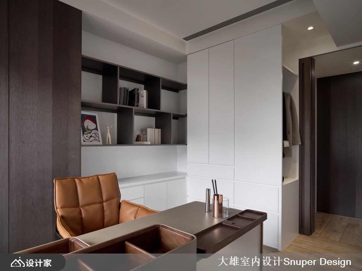 大面采光,让户外的绿意与光线走进家的空间里,伴随镜面、玻璃等透亮材质的营造,让室内更显开阔、舒心;天花板与墙面藉由分割线的描绘,整合室内的一景一偊,创造出渐层的视觉美感。 入室后的玄关,利用磨石子铺设地坪,鞋柜贴附镜面材质,反射出室内的情境,让空间更显放大,且柜体以腾空为安排,流露出轻盈无压的气息。电视墙以大理石打造,右侧保留通道,可通往书房区,墙体左侧则局部以玻璃隔断,穿透的视线些微消弭领域隔阂,更展现流动的空间感;梁柱结构的窘况,透过沟缝、线条比例的切割、整合,串连领域且消弭量体结构;公领域的一侧利用木作层板打造风格展示区,可陈列屋主收藏的书籍与风格对象;沙发后方为开放式餐厅,壁面悬挂一张结合黑白灰黄四种颜色的几何画作,伴随简约线调感的吊灯安排,赋予人文艺术之美。小编的最爱厨房则藉由玻璃拉门与公领域弹性界定,门扇全然敞开后,展现全然开放的气度,若烹调时可关上门扇,杜绝油烟困扰。