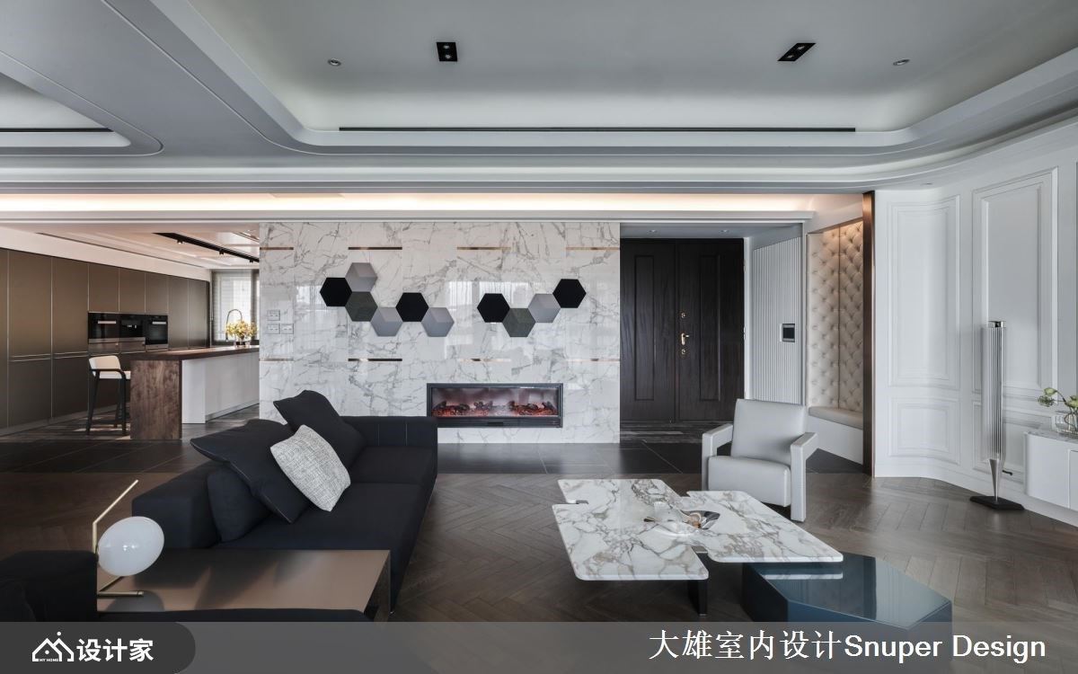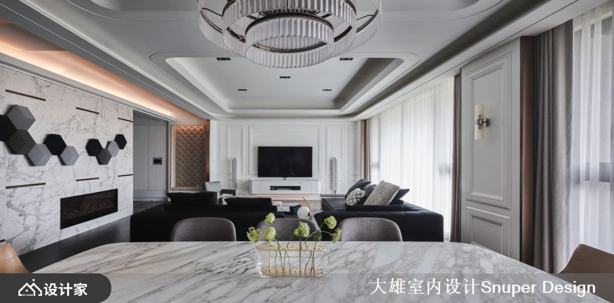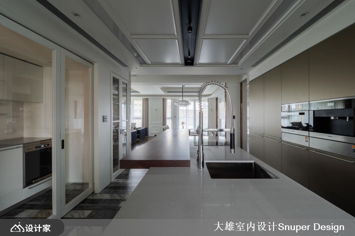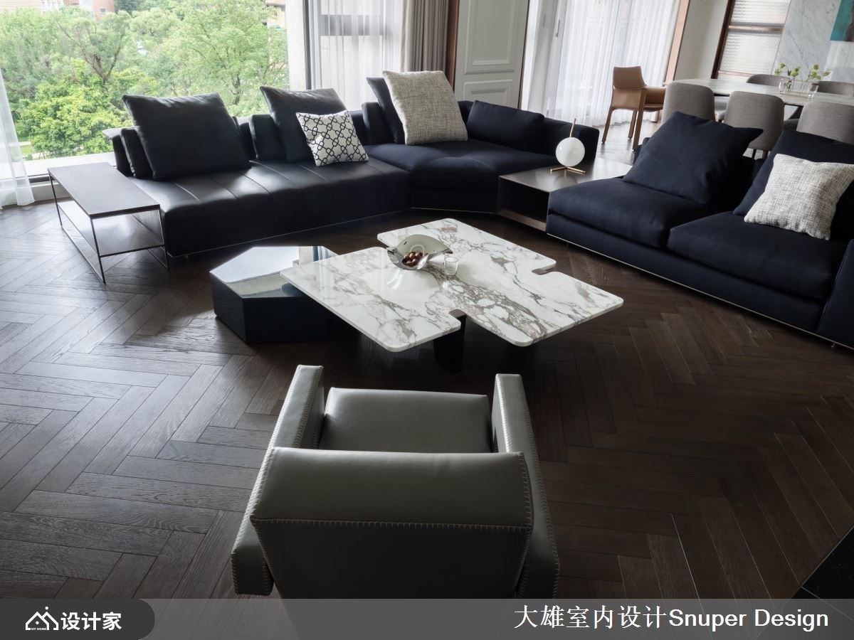 年轻的屋主夫妻需时常出差,经常在不同的国度里,因此对时尚、艺术有独特的涵养,也期待将这份对设计美学的品味延伸到住宅空间里。设计师利用现代风的语汇,善用材质堆栈,藉由光的引入与映照下,烘托出细腻的肌理与色彩,创造视觉上具层次的精彩转折。 入室后的玄关,安排鞋室以及可悬挂外出服的收纳空间,转入公共空间里,壁面内凹处打造穿鞋椅,层次感壁面搭配天花板的间接照明,营造一面视觉端景,以此为开头,藉由一条廊道做为客、餐厅与厨房领域的串连;廊道上的石纹墙面以几何元素拼接、妆点,搭佐镀钛金的线条,植入奢华时尚感。白色线板创造出古典意象的电视墙,与双弧型曲线勾勒的天花板相互呼应,宛如画框般的元素导引出视觉动线,且赋予空间流动感;客厅选订一组订制西装布料般质感的L型沙发,低背与深色的视觉安排,围塑出沉稳、宽敞的空间气度。以餐桌为轴线连结到开放餐厨领域,利用一道玻璃拉门围塑内厨房区,平时完全开放,让整体空间更显开阔。 小编的最爱 起居室跟书房间做了双向大拉门,让领域间的动线更有弹性;书房空间特别打造一面均光的展示收纳机能,将金属的结构材质与色泽烘托出来,营造出绝佳的艺术质感氛围。