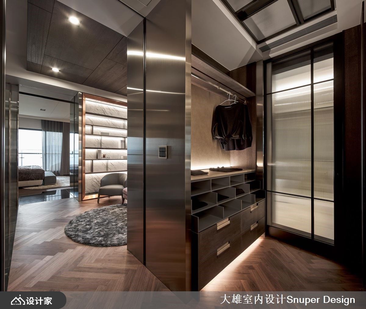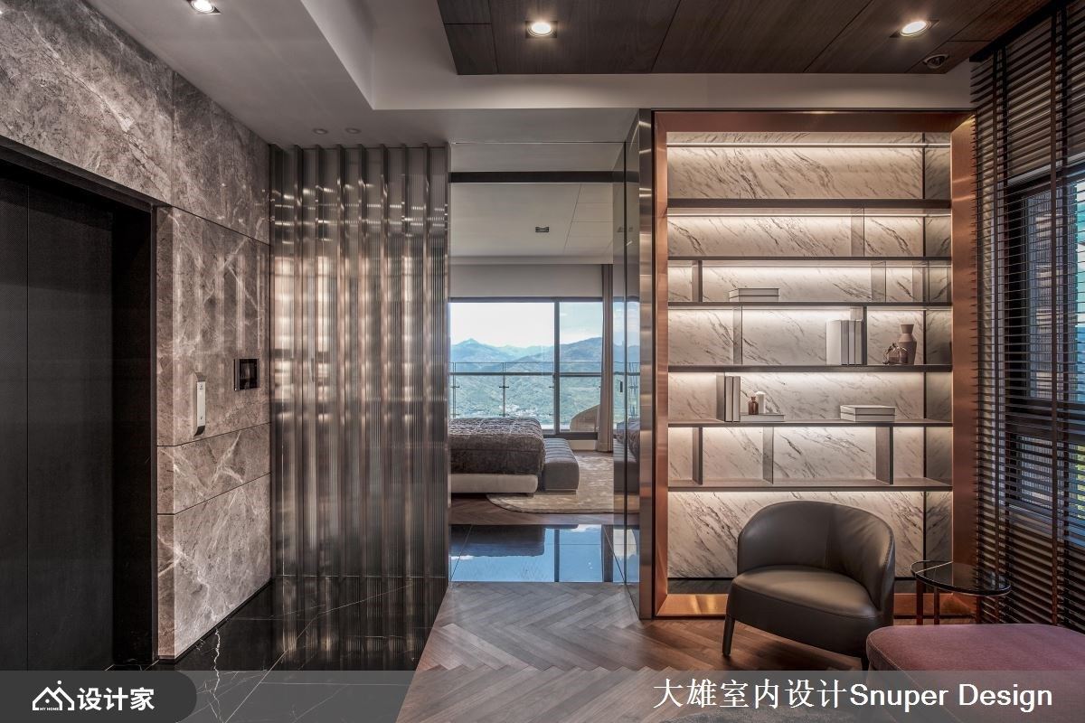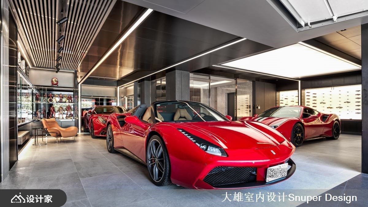 屋主对美学有独特的思维,加上钟情于超跑的艺术之作,因此希望藉由设计师的精湛功力,将对生活的品味与超跑灵魂的迷恋,融入透天别墅里。 地下室车库以超跑博物馆为主题,陈列着绝美的跑车收藏,光膜天花的安排让光均匀洒落在每一处车身,还透过光带导引出动线与韵动感,巧妙呼应超跑身形,沉浸精彩光氛层次里;另外,透过一整面墙展示屋主收藏的车子模型,定制的压克力车座营造轻盈视感,且背景搭佐均匀衬光,可清楚展演每台车的款式与细节。一楼是客餐厅场域,大面窗景引入户外的山峦,透过空间里的木纹色泽呼应自然绿意,烘托温润自然之美;沙发背墙以展示收纳柜展现异材质活用术,纤细的镀钛管、铁件分割与格栅造型,与背景石材的纹理相互辉映,交织出细腻且精工质感的视觉美学。餐厅里,天地壁上透过线条让视觉延伸,搭配沉稳的基调更添安定,透过跳色绿高脚椅擦亮视觉新意;一道云山水大理石擘划出餐厅领域的非凡品味,藉由独特的拼花呈现,大面块体堆栈与构图美感的讲究,隐喻聚与合的东方意象,烘托大宅器度。 小编的最爱 居室里,窗户引入最美丽山景,且以意大利精致人文做为氛围定调。灰紫绷皮打造床背板,线条堆栈宛如超跑内装皮革,展现奢华高贵;更衣室里伴随踢脚板导引光源,调和柔美精致的气息,而衣服以单品陈列的方式工整摆放,流露时尚究极之美。