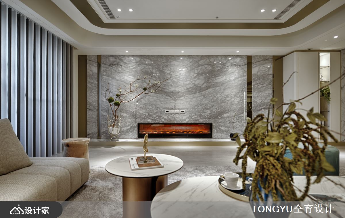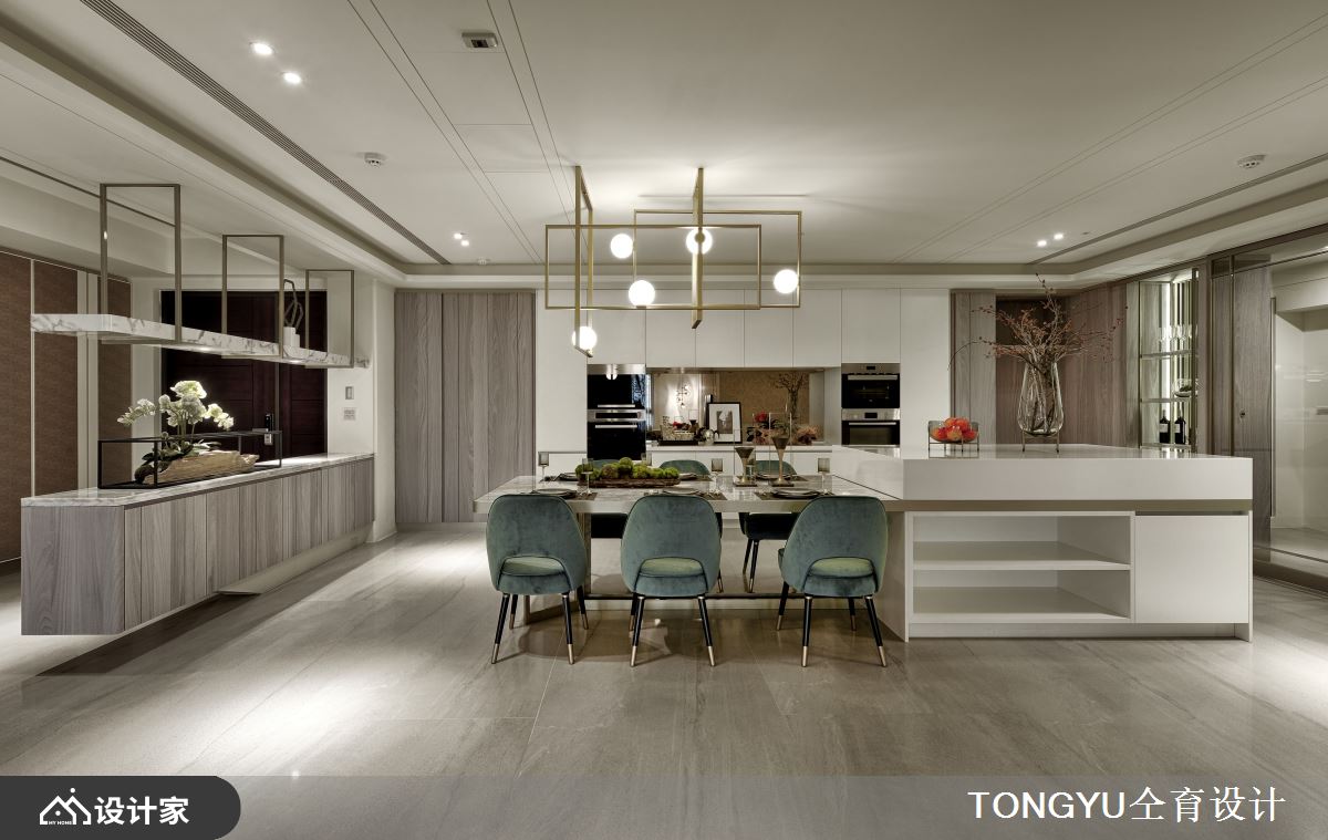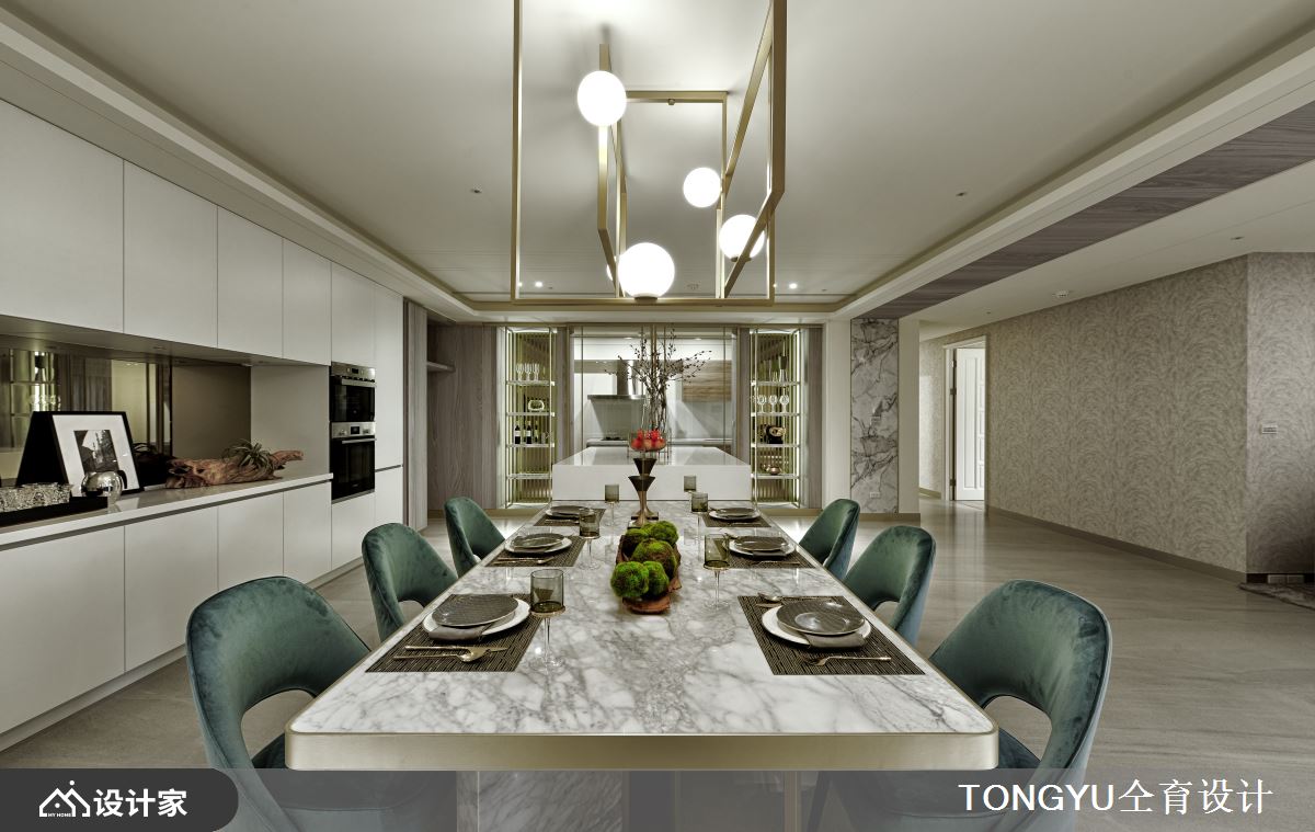 小编带你看好宅 设计师从空间感、异材质、色调为规划出发点建构大户型空间,并挹注疗愈的设计元素,且预先计划餐厨区尺度,完美容纳演奏乐团的空间,让大户型不仅只是无谓铺张,而是充满优雅层次,织就出人为本的品味视野,快跟着小编一起来看看吧! 步入空间内,即见窗面的大好采光,并在沙发墙铺贴花纹壁纸,传递自然休闲的氛围,采以卡拉拉白大理石规划电视墙、下方安置壁炉,营造美好的空间温度,整体运用香槟金、灰色石材织就大器的基底,结合简约线板勾勒、点缀精致度,且藉由多元的异材质交错,形塑层次有序的精湛视觉比例;主卧睡眠区加入亮橘色作为主题色彩,跳出新颖亮点,并选用皮革作为床头材质,成就屋主夫妻的时尚品味;偌大的更衣间则充满奢华感,以金属层架满足机能,不只缔造精品质感,更呈现穿透视觉效果,让鞋包衣物均可被妥善陈列;小孩房内,配置了一体成形的书桌平台,并在角落设置飘窗,围塑专属的安心休憩角落! 小编的最爱 设计师以独特美学建构大户型风貌,在简约、轻奢的层次之中,让家化身上流绅士、淑女的聚会场景,替屋主一家打造出梦想中的极品豪宅!
