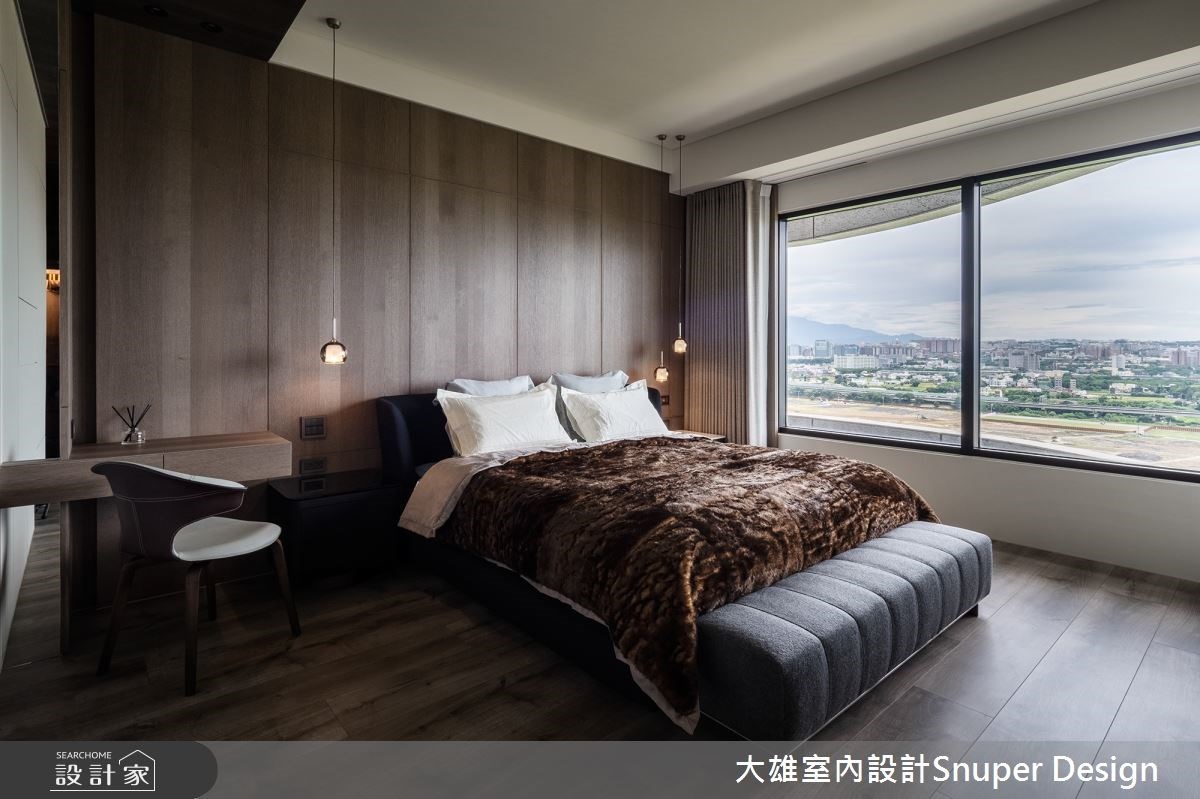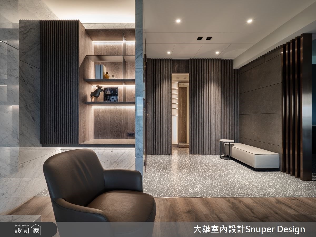 依循地理位置的河岸景致,231平米的现代风大宅拉低水平窗带,将明亮采光与自然视野引进低调内敛的室内,衬托出大地色空间的质朴韵味,且透过木皮、石材、金属和磨石子等异建材混搭,提炼家的舒适纯粹。 【磨石子地面,迸发出传统新美学】 入门后正对着石材墙面与金属隔屏,视线直接穿透到后方的吧台区,光泽感的吊灯与隔屏建材相互辉映,而磨石子地面从玄关、吧台铺叙至通往私领域的廊道,并在与木地板的衔接处以镀钛金属修饰,迸发出传统跟时尚交融的独特美学。另外,玄关左侧则利用隐藏门手法,规划机能充足的衣帽间,能整齐收纳各式鞋款。 灰白大理石电视墙烘托家居高雅气质,并适时加入下方的壁炉,替空间增添温暖的大气质感;长桌上方的大型吊灯及东京表参道的街景摄影作品,则在沉稳基调中跳脱出鲜明的空间性格。绿带地平线延伸至主卧,卧室藉由沉稳温暖的木质调,为居住者带来无比的平静,且搭配化妆台和更衣间,以完整的机能配置满足所需。 小编的最爱 设计师善用住宅的河岸景观,不过度雕饰室内设计,反而利用建材本身的自然质地,以及对色调风格的敏锐度,为长型空间挹注光影变化的生动意境。