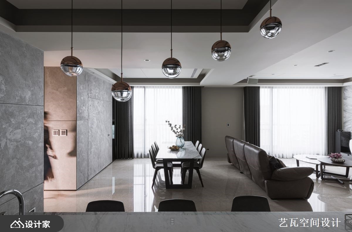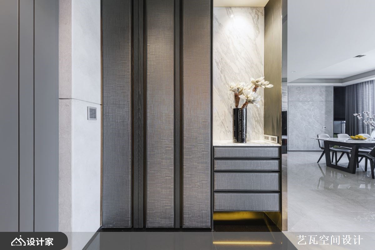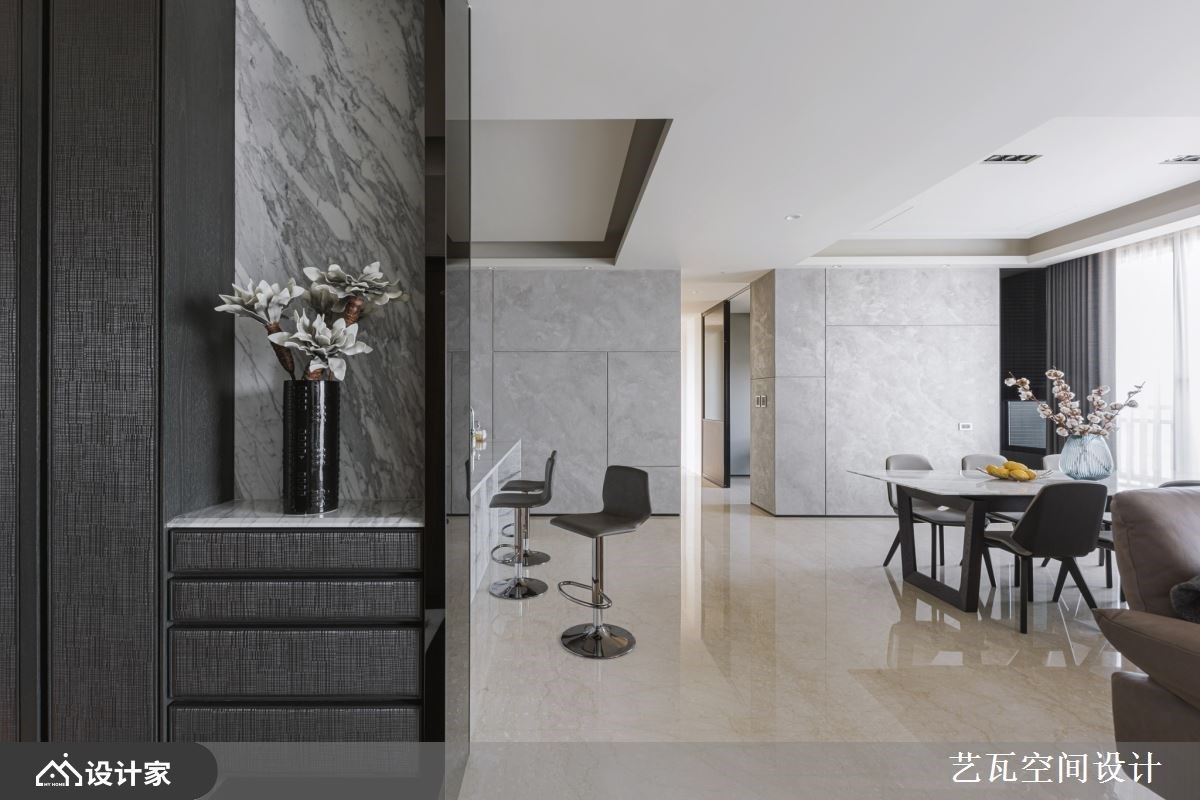 314平米精品大宅,因男主人喜爱温馨的米色调,女主人喜欢沉稳的深色调,于是设计师整合二人需求,打造出让两人都满意的现代风格,再搭配开放格局、长形吧台规划,使家居视野充分延展开来,让大宅空间感更加乘,快跟着小编一起来看看吧! 【大理石电视墙,呼应地面与壁材】 玄关于地面铺叙拼花图腾大理石,并巧妙融合质感灯光及自然元素,透过花艺端景、间接光源,精致皮革柜面等妆点,使入口区域展现艺术性,展现个性化专属格调;客厅则打造灰白相间的大理石电视墙,以浅灰石材呼应地面与壁材,天花板舍弃了常见的白色天花,改选用驼色带灰的米色调,使居家更显轻盈温馨。 厨房规划开放吧台,搭配流畅的格局擘划,成为客厅与餐厅之间的衔接空间,搭配钢琴烤漆厨具门板闪耀着高雅光泽,替用餐区域带来绝佳品味;卧室,选用软身建材打造绷皮床头,彰显主题墙面的尊贵感,且挹注空间安定感,再简化柜体把手,维持墙面视觉的简单利落! 小编的最爱 ”艺文以会友,瓦厝为聚贤”,是艺瓦设计的成立核心,”艺”代表艺术,”瓦”代表设计的空间,藉由专业美学与细腻手法,一砖一瓦为客户堆砌出温度及巧思的居所空间!