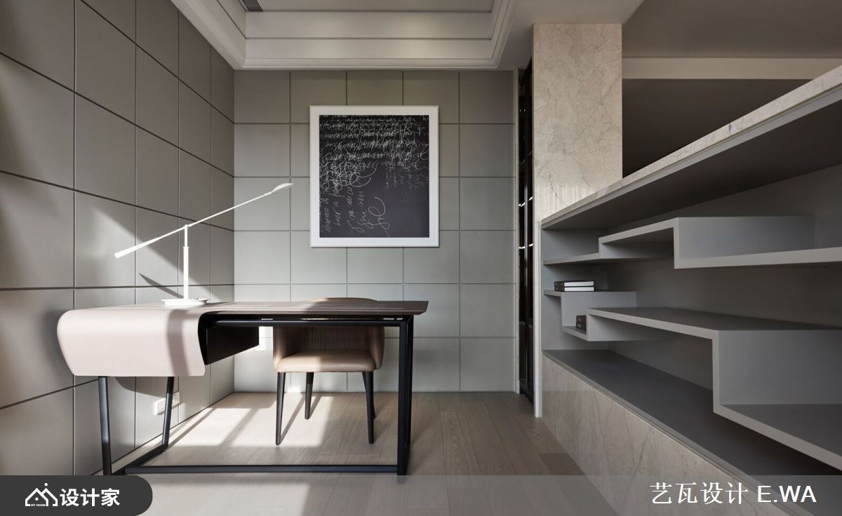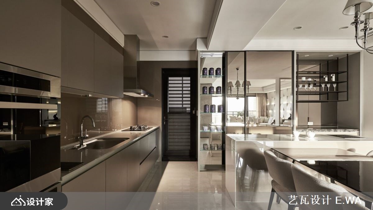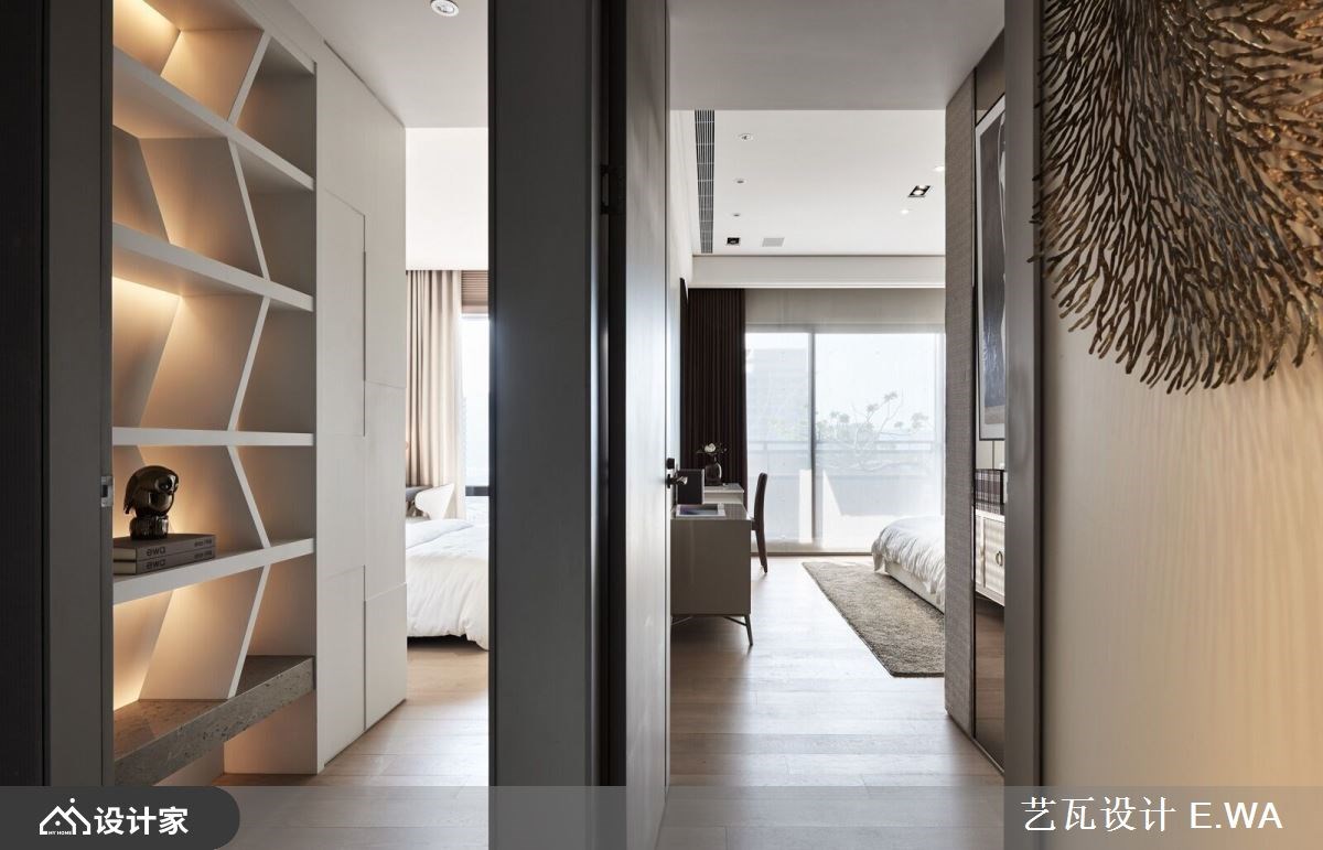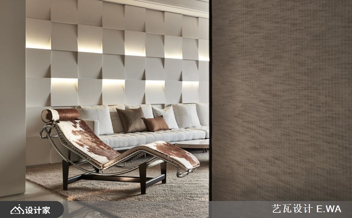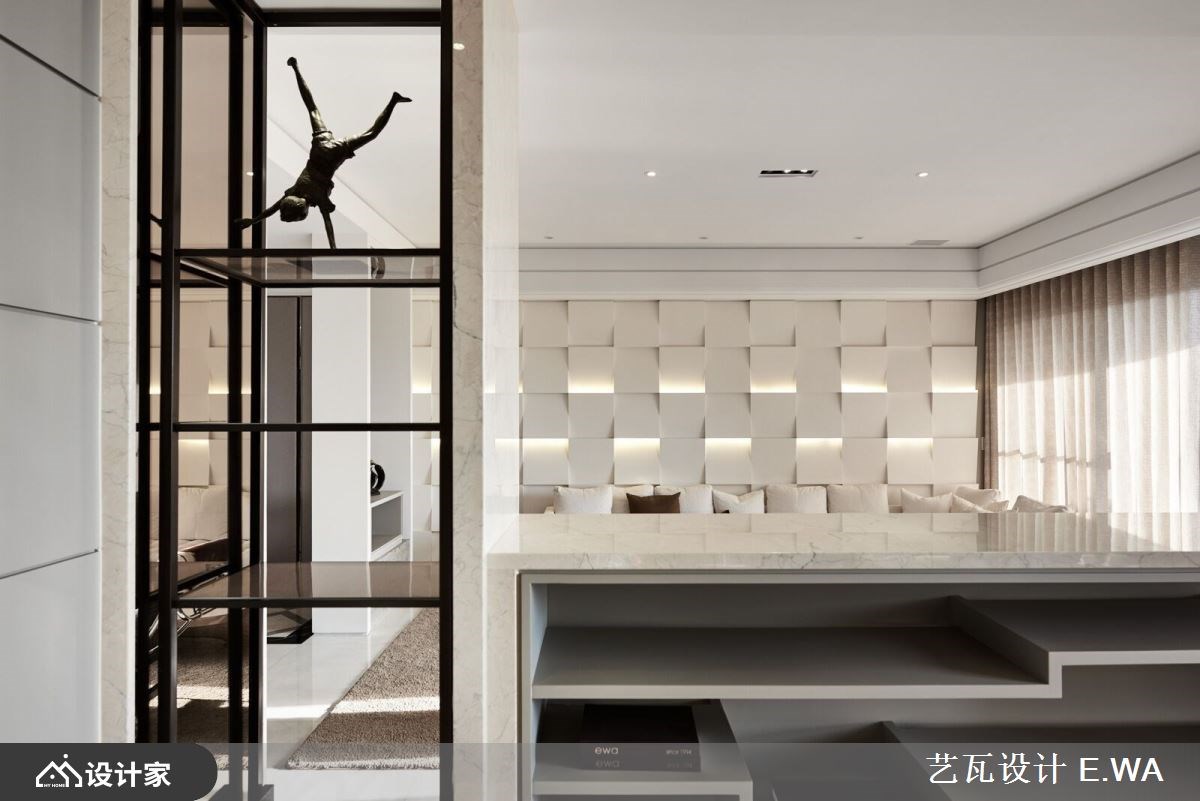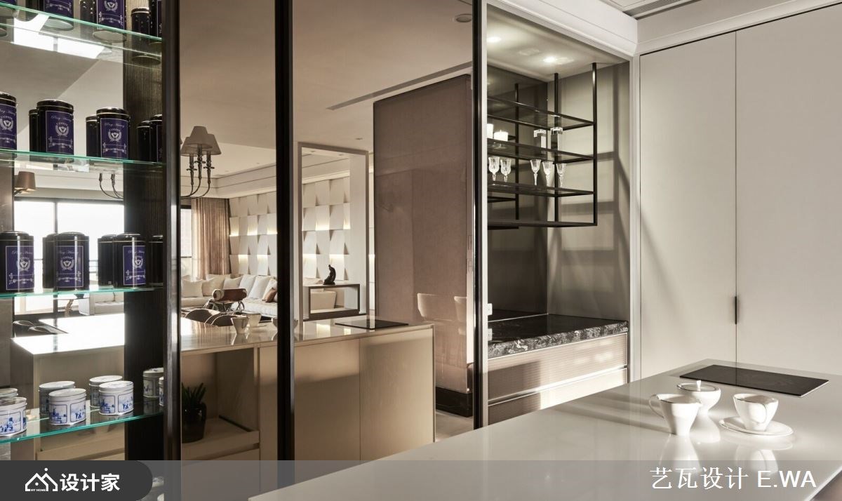 一走进 317 平米混搭风大宅,便迎来完美採光与宽敞通透的视野,设计手法屏除繁複的色彩,以隽永经典的杏色衬托精緻光影,打造精品屋般唯美气质,更反映出屋主好品味。 玄关方框隔屏收拢窗外美景,框出最自然的入室端景画面;延续光线引导,视觉不自觉被客厅背牆吸引,远观有如编织造型的牆面,在规律的错层铺排下,形成有次序的阴影,经过设计师多次调整后,光线精准衬托加乘视觉层次,且柔和的杏色与黄光晕染了整室气质;留空的电视牆后方紧接书房,打造独立与紧密兼容的格局,为豪邸带来更多情感连结,而书桌面朝落地窗的座向,让阅览、办公时光能时刻沐浴在阳光中。 小编的最爱 餐厨区餐桌与中岛的结合,增加了使用范围及便利性,侧牆厨柜门片以镜面拉门设计放大空间、更带来精緻氛围,紧邻的镂空悬吊铁件,巧妙让高脚杯成为佈置一隅,而炒菜区与冰箱等大型电器一字型规划,赋予良好动线。