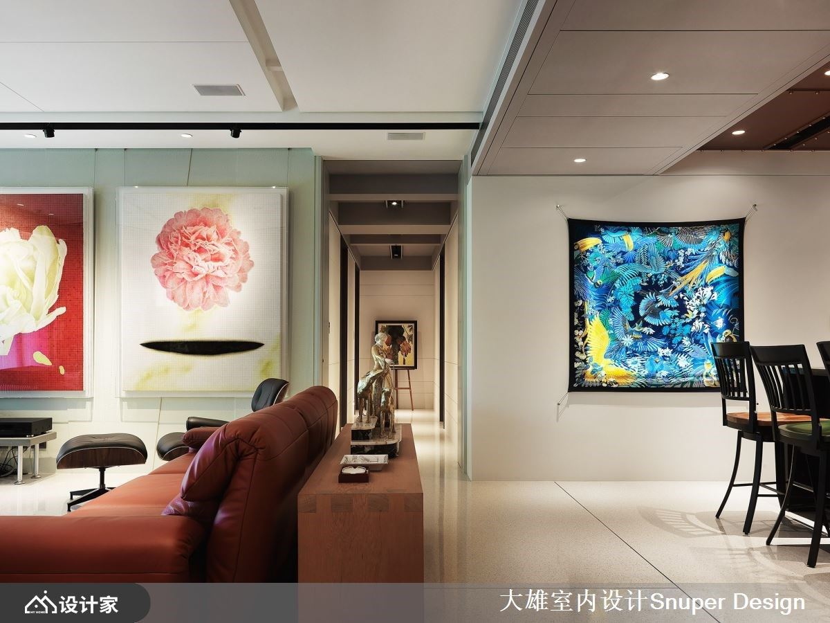 保留建筑体最极简的线条与气度,让室内的材质特性、艺术画作、风格家具与软装恣意展演,且利用开放的公领域作为视听区,将屋主收藏的经典胶片、唱盘转化为空间的美学灵魂,彷佛回到最纯真、恣意摇摆的爵士乐年代。 玄关以粗旷的石材马赛克铺设,转弯延伸至室内,入口右侧以镜面安排,映照出对面的深色木纹鞋柜,衔接清水模的壁面,搭配花卉艺术画作,在一片朴实为基底的空间里,渲染一抹缤纷艺术光采,成为绝佳迎宾。相较玄关,公领域以精致的水磨石安排,并搭佐铜条的细致收边,而清水模墙面转以浅绿珪藻土墙,利用不同的材质交错出渐层风景;客厅里挑选红色皮革沙发、安装高级影音设备,主体墙则以两幅花卉艺术画作妆点,烘托屋主对生活品味的讲究与享受。另一侧以深色石材中岛作为餐厅区,古铜色意大利工艺造型咖啡机、银色线条感的灯饰摆设,营造出复古又现代的空间氛围。 小编的最爱 居室里以深色木纹描绘天花板、收纳柜,床尾摆设一张皮革结合铆钉的单椅、云彩石材框构出壁炉为灵感的主视觉墙,搭配嵌灯的间接照明,调和出柔和的休憩氛围;更衣室里摇身一变,融入线板的古典风尚创作,展现华丽的精品质感。