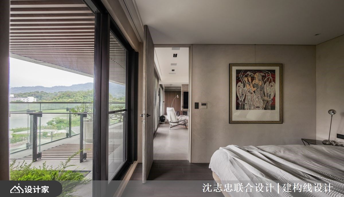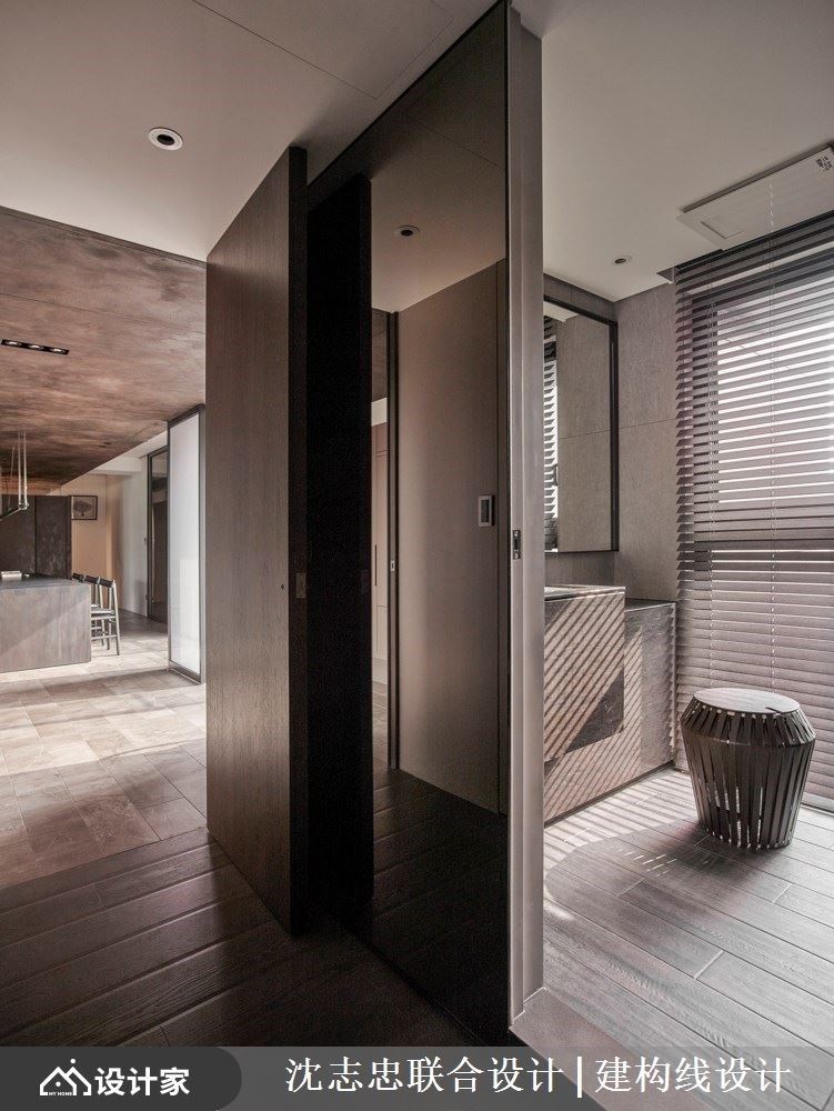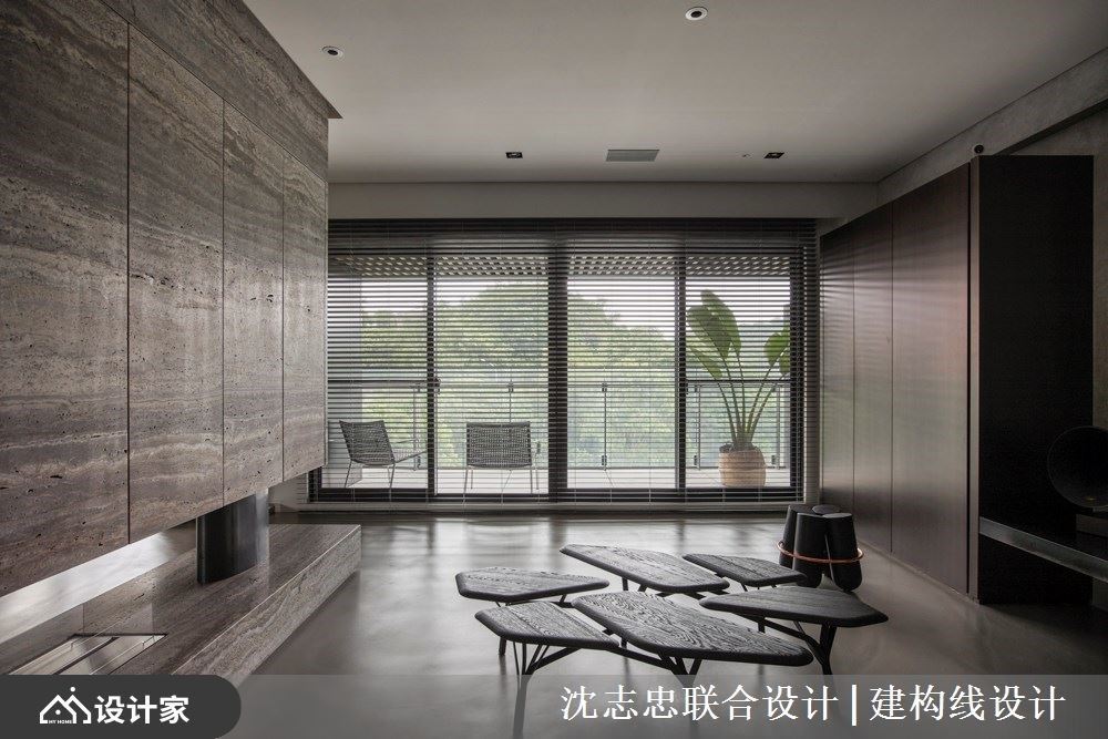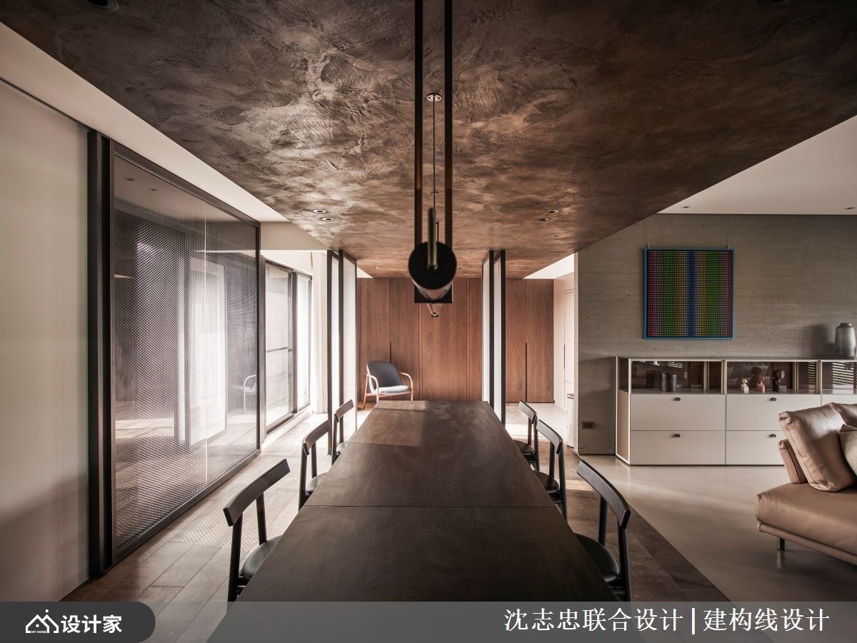 建筑体拥有依山傍水的地理优势,辅以大面窗户设计,引山林绿意入室,加上室内以开放格局,藉由回字型动线串连且界定出玄关、客厅、起居、餐厅等关系,以现代风手法营造出生活在自然的惬意态度,让光影、量体与材质特性延伸各个领域脉络,交织出一场大自然、空间与人的绝佳对话。 开放的公领域里,在配置上模糊既定的界线,实木、盘多磨、铁件的材质延续、重迭且穿透其中,淬炼出朴实、简约的清幽现代风特质。高低天花的落差,伴随深浅对比色系以及异材质的安排,彰显铁件壁柜的粗犷风貌,同时划分出客厅与餐厅空间;电视墙以悬浮感的量体轻化设计,将公领域划出前后两个空间,皆可与亲人或三五好友卧躺在沙发或扶手椅上,一同惬意的眺望窗外风光,领受心旷神怡之感。餐厅的天花板以特殊漆诠释出铁锈感,且一路延伸视觉动线,营造出延续且渐层的景深。 小编的最爱 让户外阳台的自然风光延揽入室,开放的空间里透过天地壁的材质与对比色安排,创造出保有领域的弹性与界定,锈铁薄砖、特殊漆与板模墙等自然纹理的铺陈,激荡出朴质与独特的家居品味。