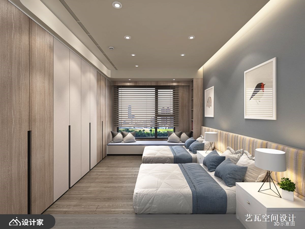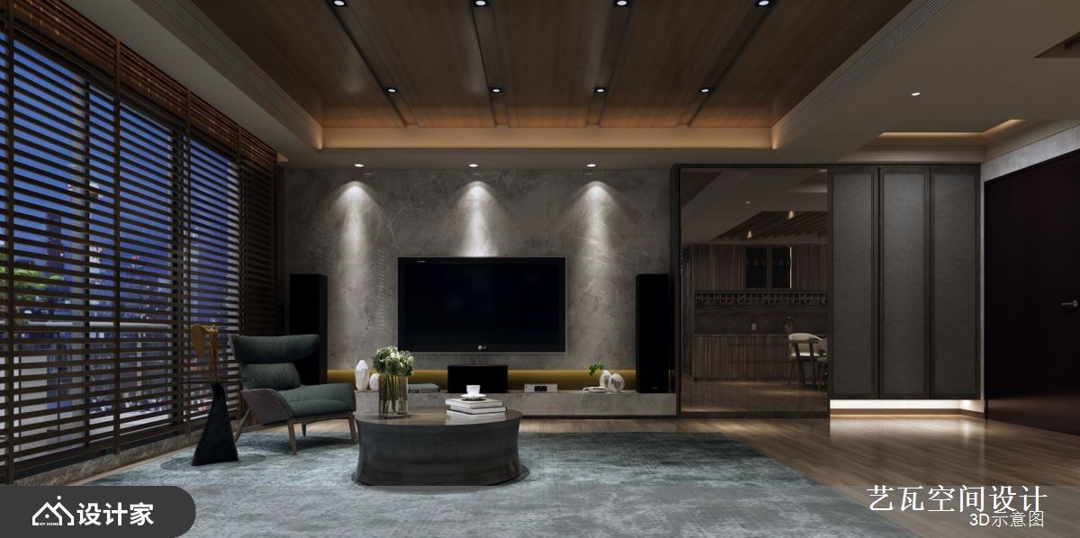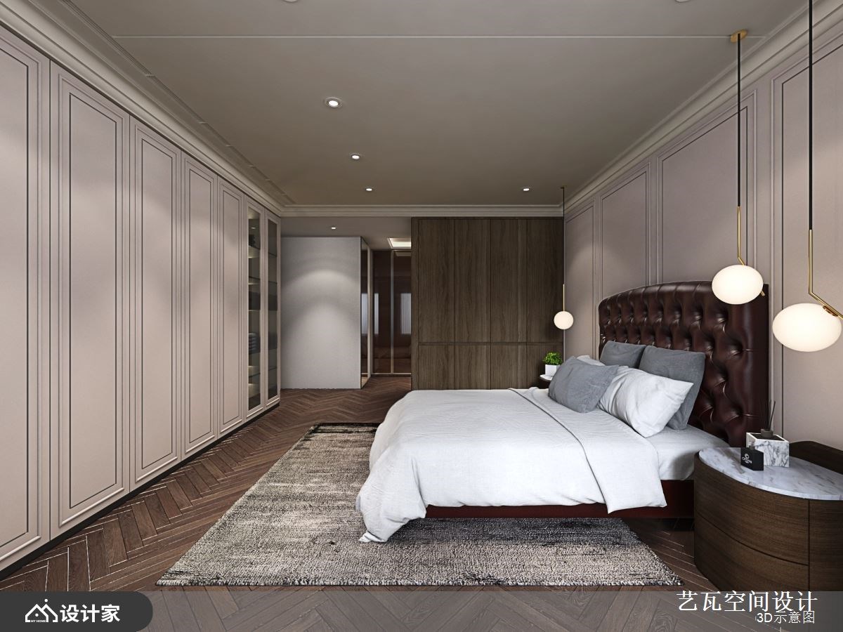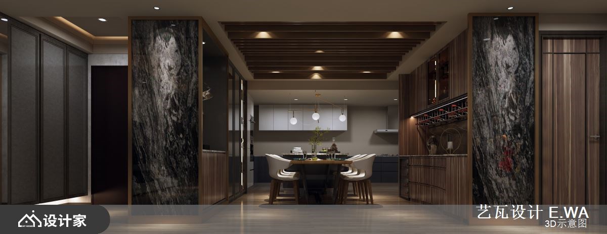 304平米的现代风豪宅精选木皮、石材、铁件、裱布、系统柜等建材,整合现代时尚、简约古典的风格取向,细腻地衬托出大宅的气度与质感,让一家人能在此生活得自在悠闲,写下一篇篇充满欢笑的日常故事。 【镜面反射走道,延伸室内深度】 一走进室内,深色玄关柜以线板装饰,给人古典高雅的第一印象,而一旁柱体透过镜面反射走道空间,巧妙延伸了室内深度,塑造明亮开阔的视觉效果。客厅选择木质天花板作为空间的明确界线,而点点嵌灯照射于石材电视墙、深绿色单椅与地毯上,更加凸显家居气氛的沉稳及隽永。 沙发后方透过玻璃隔断划分出书房区域,使客厅百叶窗的光线能够穿透到阅读空间,也能降低格局的破碎感,而充足的收纳柜则可以摆放大型公仔、各类书籍,增添视野的丰富度。 开放式的餐厨空间则在天花板采取格栅元素,营造温暖又不失大气的格局氛围;中岛和餐桌比邻设置,赋予空间更多的使用情境,不管是亲友团聚用餐,或是小酌怡情,都能享有高质量的生活体验。 小编的最爱 设计师在寝卧分别针对每位家庭成员的特质与使用习惯,做建材和风格上的不同选择,无论是线板与拉扣皮革床板的搭配、木质和特殊板材的契合、系统柜与飘窗的配置,都能呼应不同家庭成员对于睡眠环境的要求,打造自成一格的生活风景。