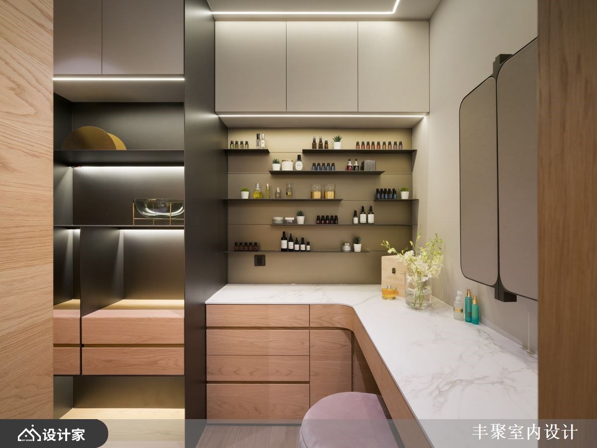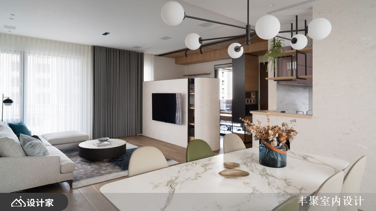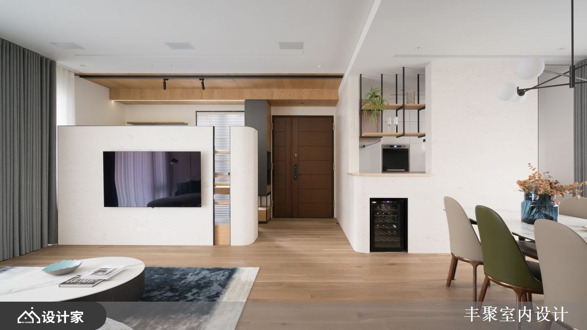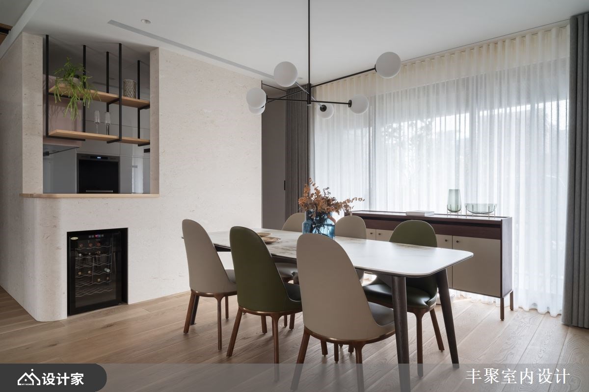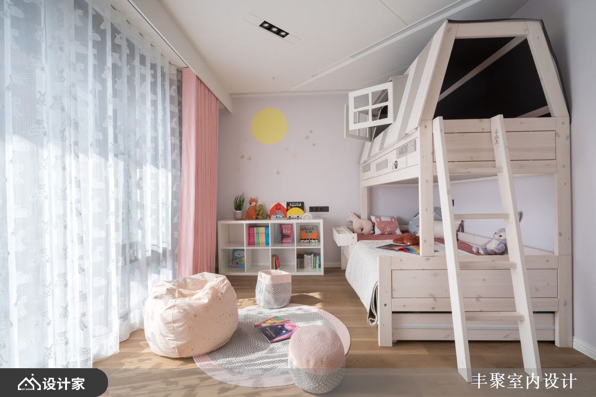 已经是第三间住宅交由丰聚室内设计操刀,一层一户的条件下,设计师将外玄关纳入规划,让一家四口的鞋履与杂物都收整于外部,释放室内收纳的压力,保留下完整41平方米的室内空间打造更舒适开阔的三房两厅。微调半毛胚屋格局,拆除卧房原始隔间并更改门口位置,同时优化客厅动线与采光,让采光落地窗有空间规划成阳光书房。重整后公领域更加完整,客餐厅与卧房区设计一道自动门,完美区分公私领域,也化解进门即见卧房的穿堂煞。 【设计与机能并行 赋予优质居住体验】 醉心于五星饭店的完备机能,又在日旅游的经验中对于日本居家都有地暖系统设备觉得贴心,因此设计师在海岛型木地板下全室铺设地暖,从客厅、卧房到卫生间,赤脚感受实木地板的暖传从脚底传到心里;两间卫生间也配有全自动马桶、电热毛巾架以及暖风机,打造最贴近人心的设计。 北欧风设计与柔和杏色包裹的空间形塑家人最向往的温馨氛围,精选德国精品开关面板、进口灯具以及定制家具堆砌出住宅的质感;儿童房也挑选比利时进口儿童床组,让孩子们能在最适合的空间里成长学习。除此之外,设计师替女屋主打造绝美的独立更衣间,订制的化妆台能让屋主大方展示收藏的香熏与彩妆用品,用室内设计宠爱辛苦的女性。 小编的最爱 为方便要准备料理又要照顾儿童的需求,设计师将厨房开口与操作台面位置重新配置,并将中岛吧台概念置入餐厨空间,透过局部篓空的设计手法玩转封闭式厨房的表情。视觉上女屋主在做菜时抬头就能看见用餐区,让料理者不会有被隔离的感觉,也方便照顾小孩招待亲友,传递菜肴也更加方便!