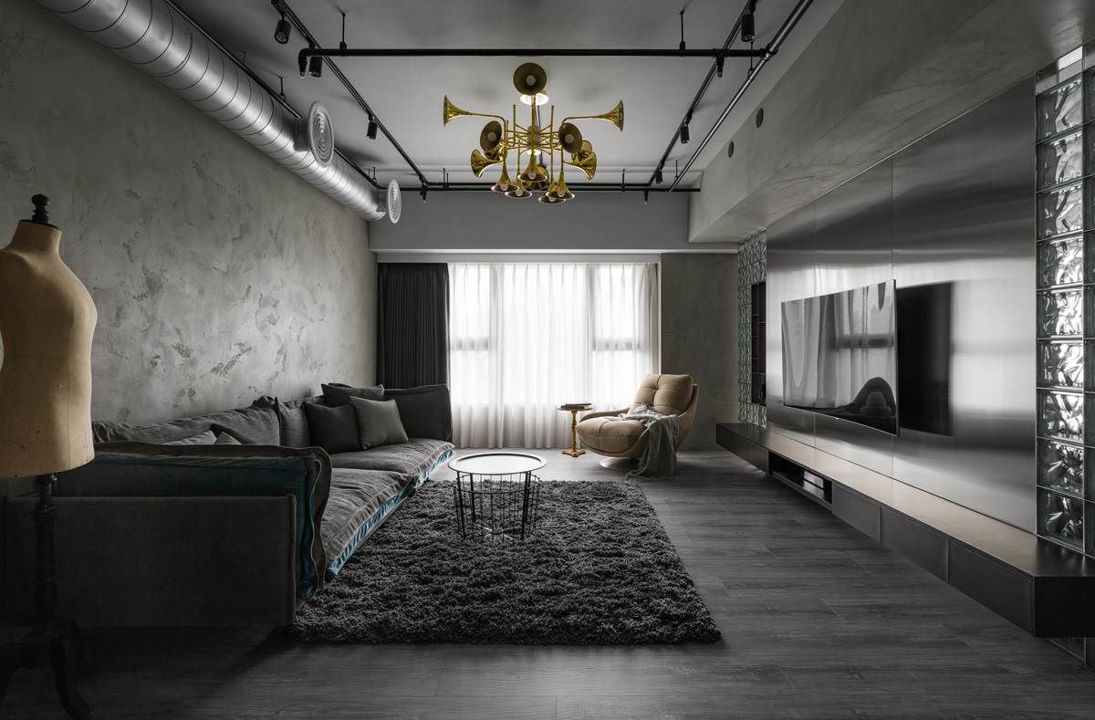 走进室内,客厅的天花板与墙面饰以手作涂料,带来人文朴质感受;铁件轨道灯穿越天花,中央安排铜管乐器造型的灯饰,替粗犷的基底创造一抹吸睛焦点,更满足主人偶尔做起音乐梦。