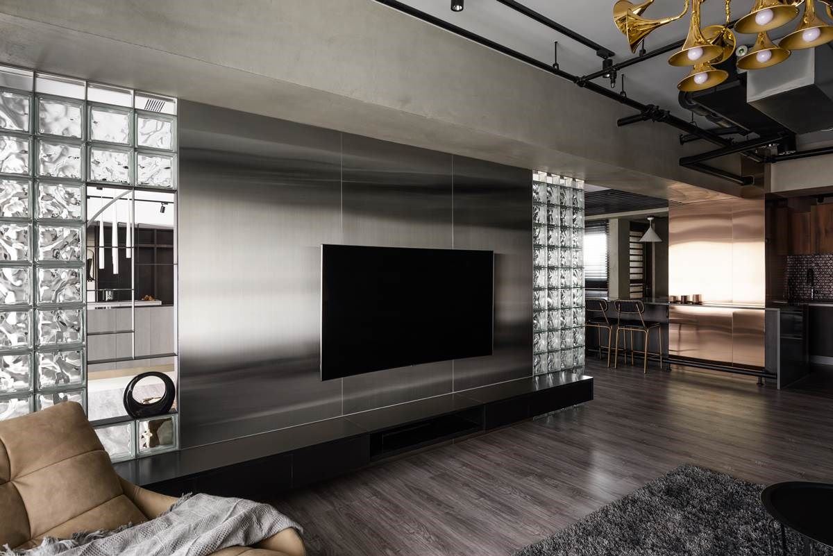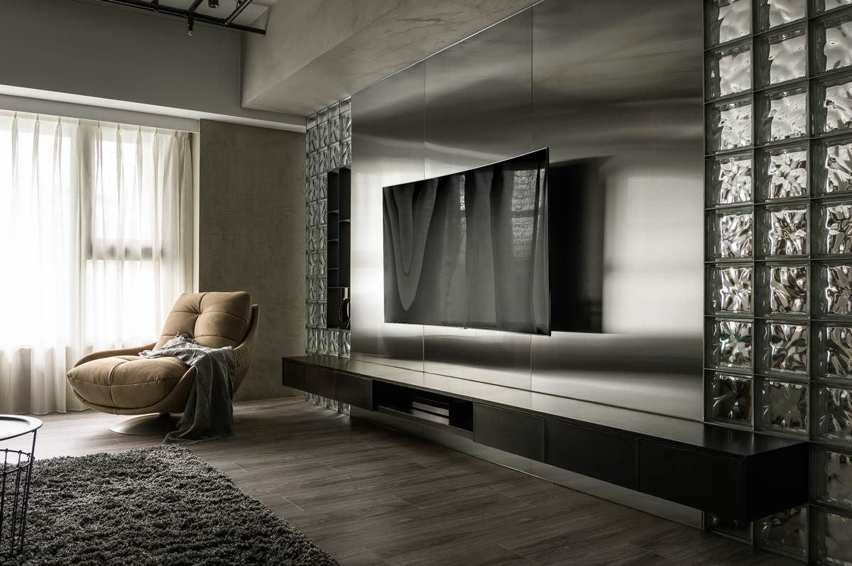 电视墙以银色调的不锈钢铺陈,随着光线映照下,烘托冷调时尚美感,墙面两侧则以玻璃砖打造,室内光线随着穿透的材质特性,提升视觉明亮度;左侧玻璃砖的中间嵌入开放层板,增添人文艺术的展示,更让视觉更为通透、开放,创造通透、宽敞的感受。