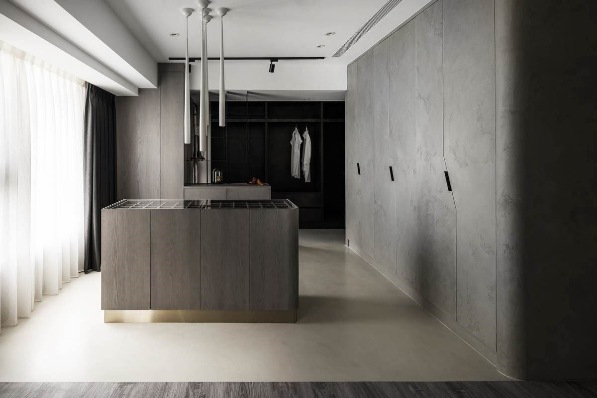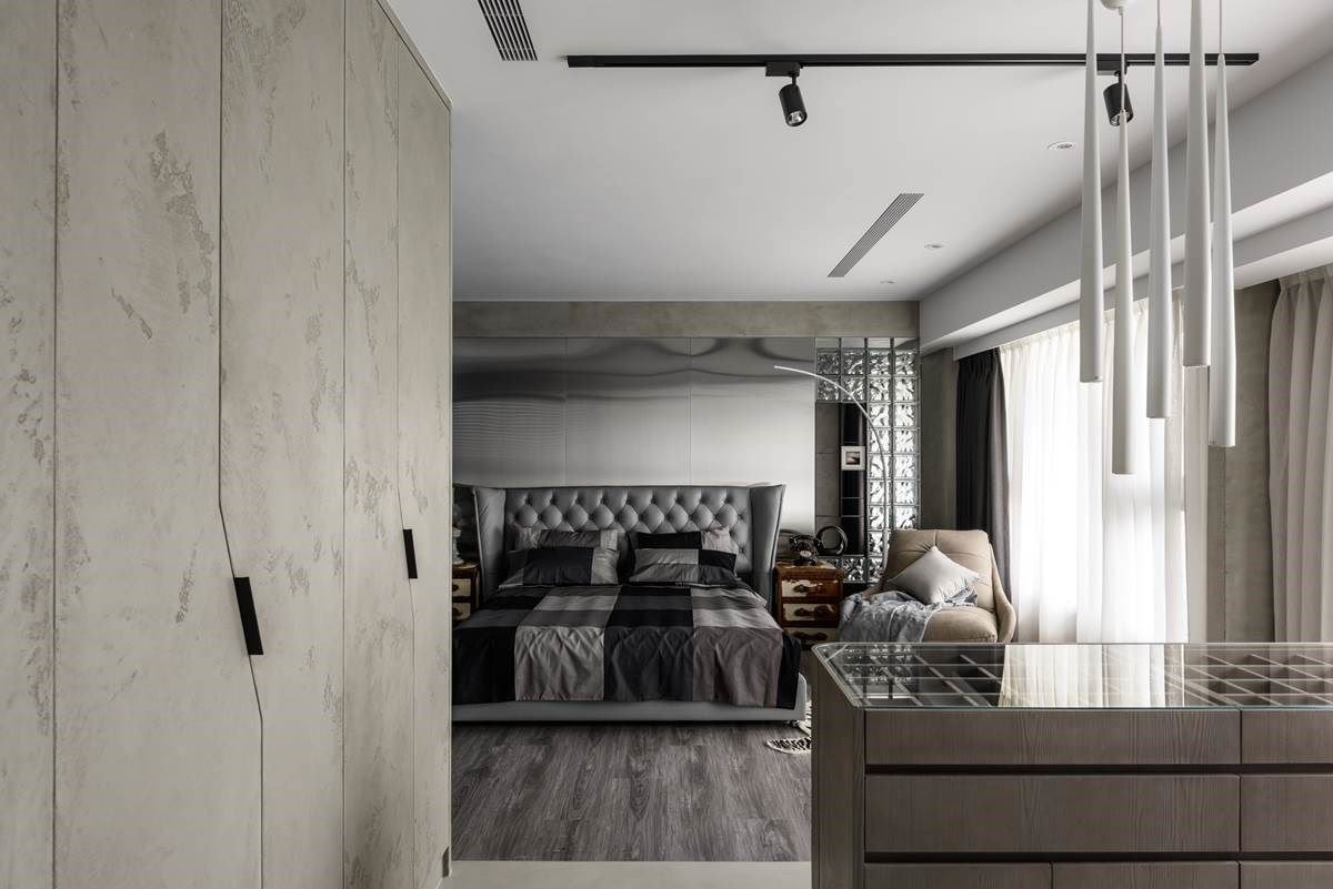 电视墙的后方做为居室,延伸镀钛材质转化为床头背板,搭配温润的木纹地坪,以及中性灰阶、温柔包覆线条的床组,形塑安定、典雅的质感风范;后方还打造出独立的更衣室,以大量木纹肌理的安排,流露出动人的雅致品味。