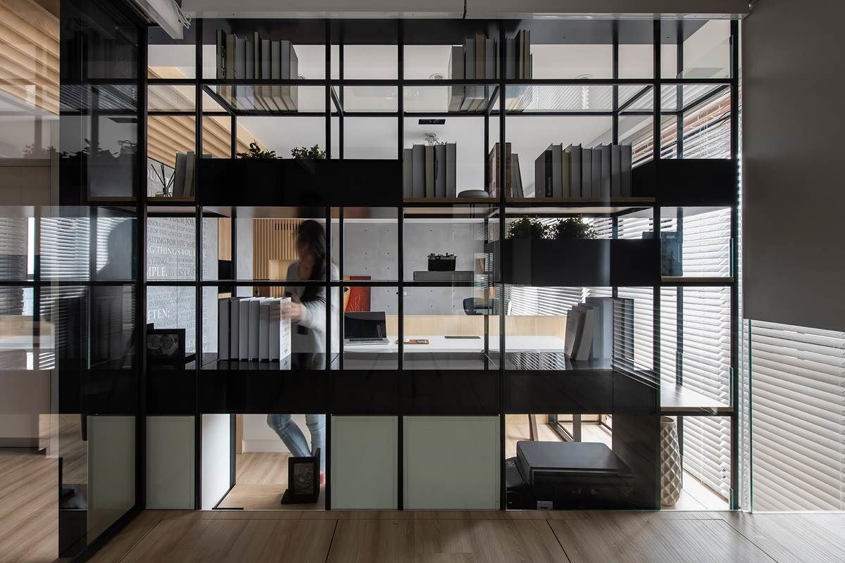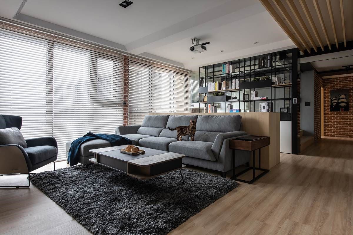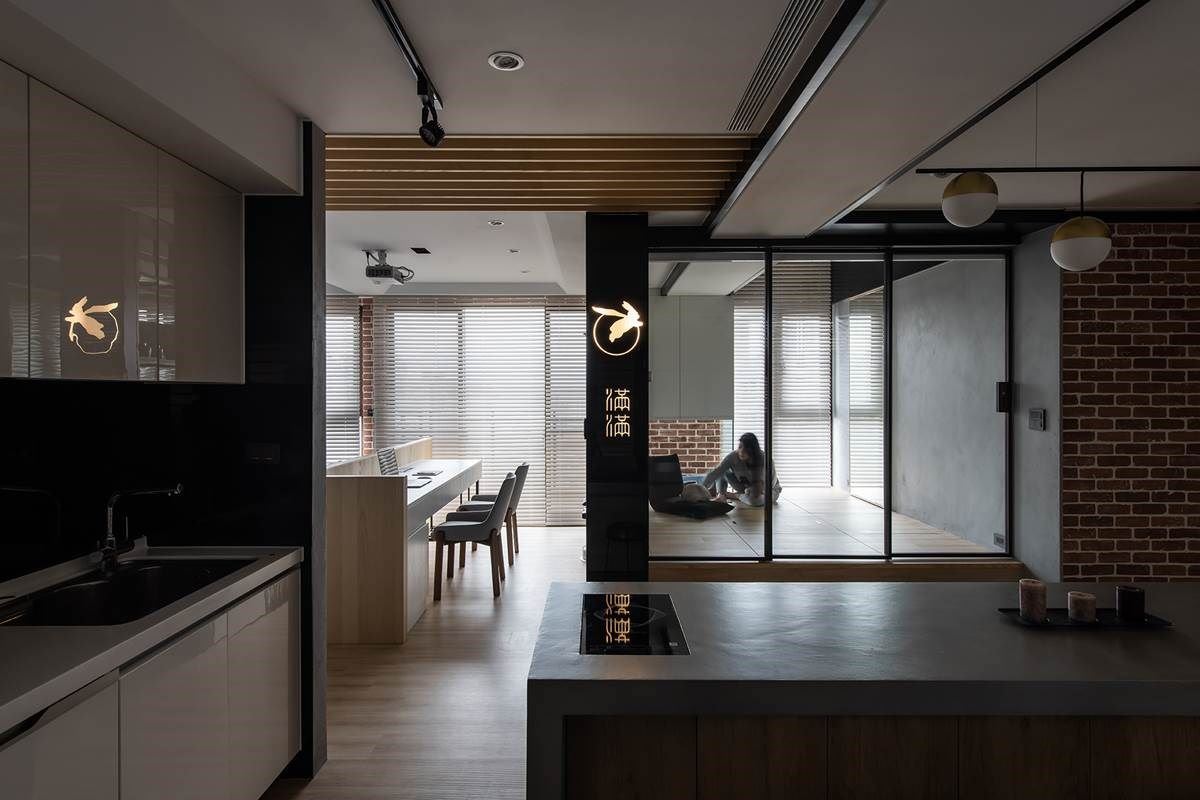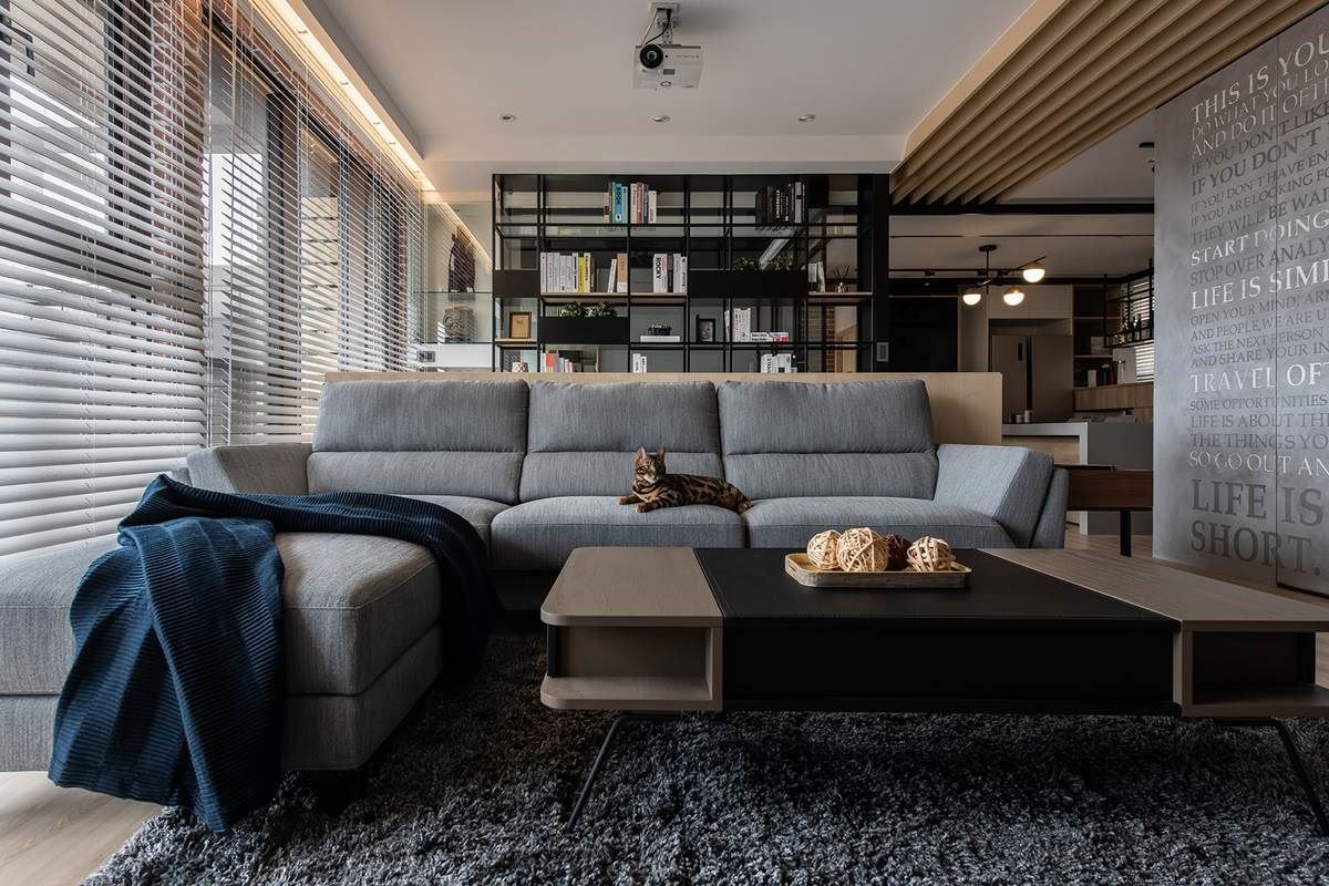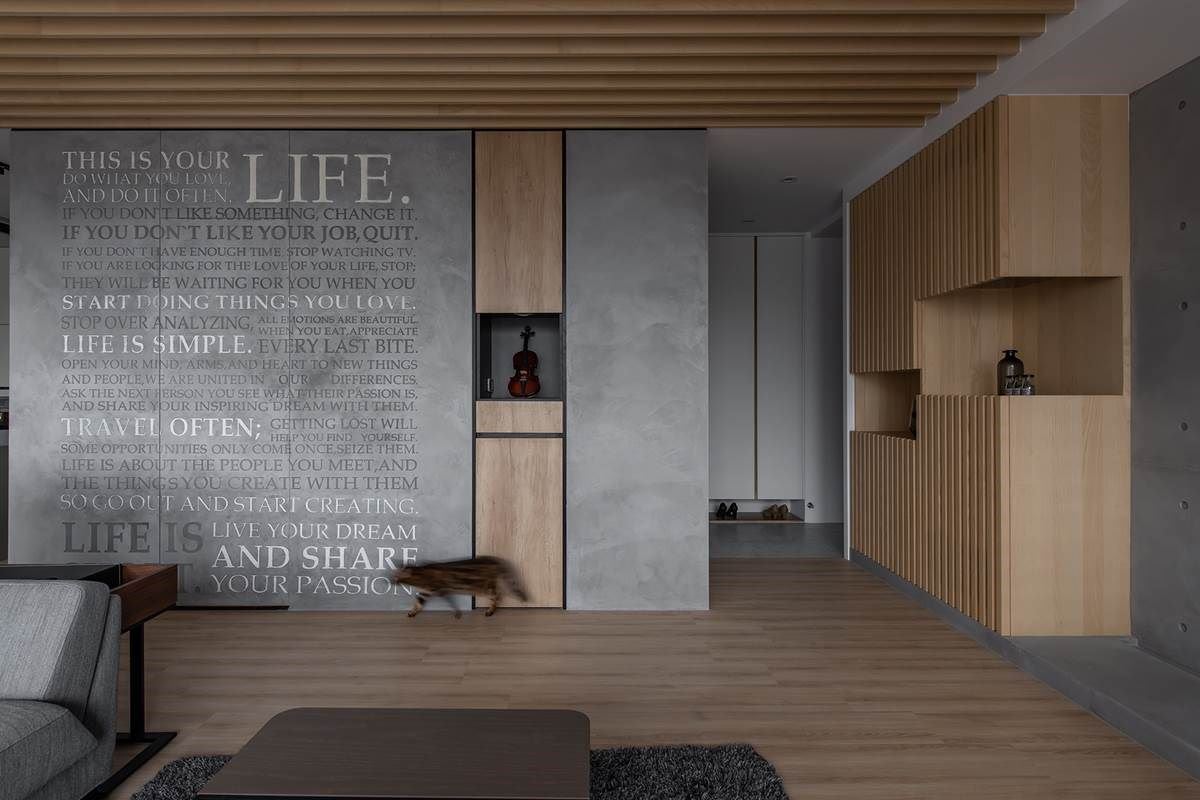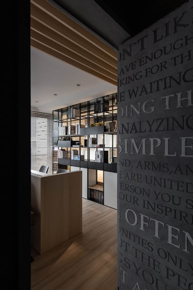 靠近玄关入口处的过道上,透过女屋主对生命的思维,转化仿清水模壁面上的英文格言,诠释一种视觉焦点,也赋予室内设计的生命力,也隐藏了客用卫浴空间。而沙发后方以矮墙界定客厅与书房区。一面以黑铁勾勒出利落感书柜风格,不仅满足收纳机能,过造型,更延伸出视觉张力、强化空间景深。
