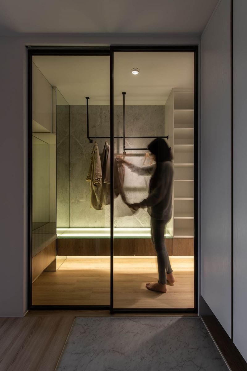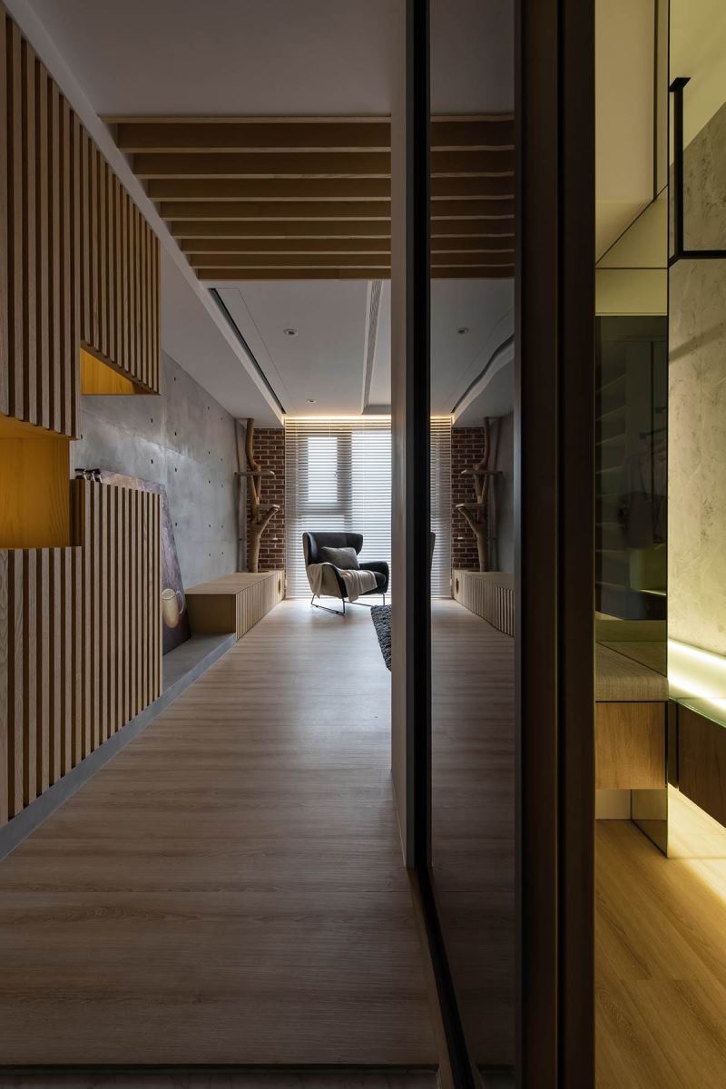 玄关处,透过架高的木地板与格栅造型天花板的安排,替室内铺陈出暖调、宜人的气息。左侧透过格栅造型的收纳柜,循序渐进的导引我们进入家的空间里;另一侧以玻璃拉门创造出衣帽间,在简约明快的格局设计下,同时满足收纳机能。