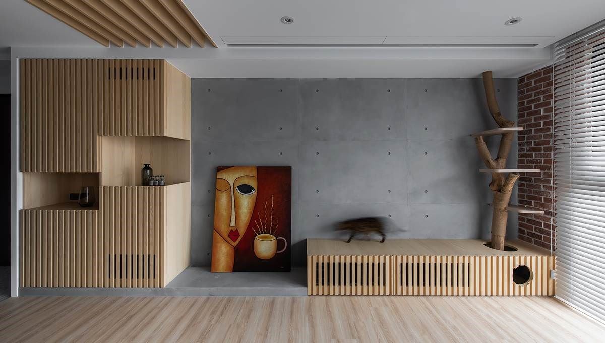 宽敞的公领域里,客厅以落地窗佐以红砖文化石点缀,搭配轻盈的百叶窗调节光源。仿清水模电视墙下方结合木格栅柜体,角落以树为意象搭建起跳猫台,猫咪游走、跳跃的画面,创造出生动、趣味的日常情境。