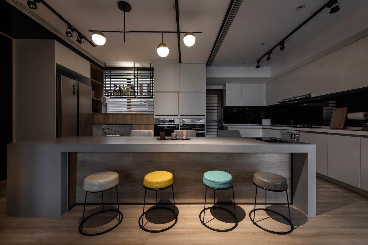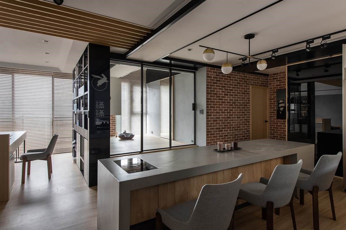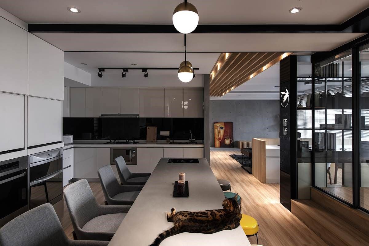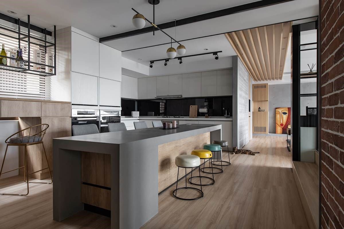 开放的动线规划下,将餐厨空间整并为一,扩充电器柜功能。餐桌同时兼具中岛功能,后方还有设置高脚椅座位,假日时可邀请亲友家中派对,共度悠闲的美好时光。铁件书墙的后方,围塑一处架高的多功能和室区,敞朗日光照亮空间视觉,也替屋主心爱的兔子打造专属生活空间;地板还结合上掀式设计,供日常的收纳使用,十分便利!