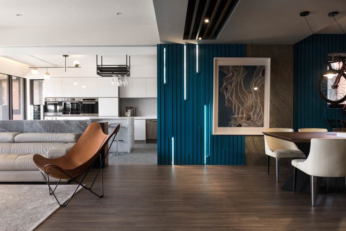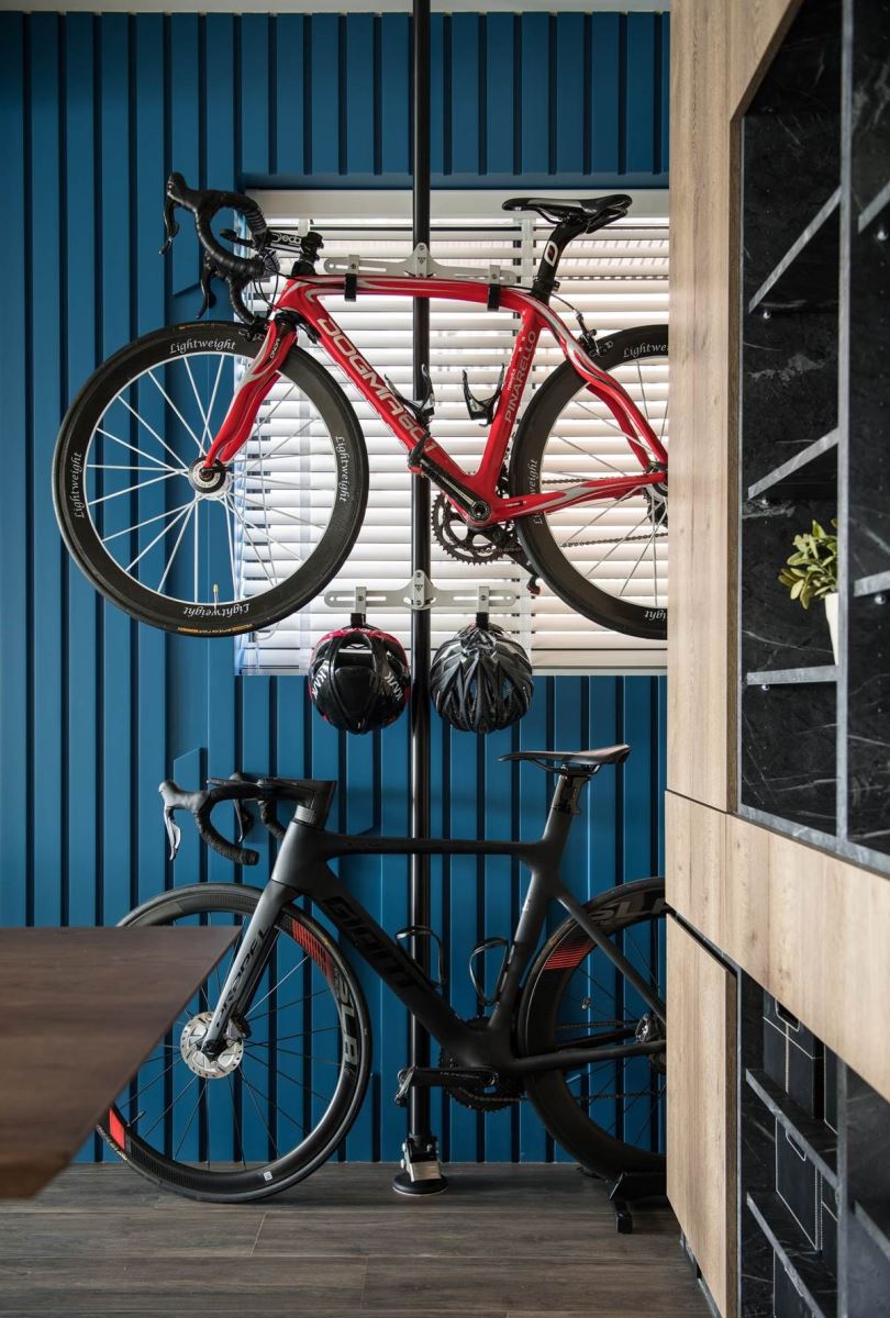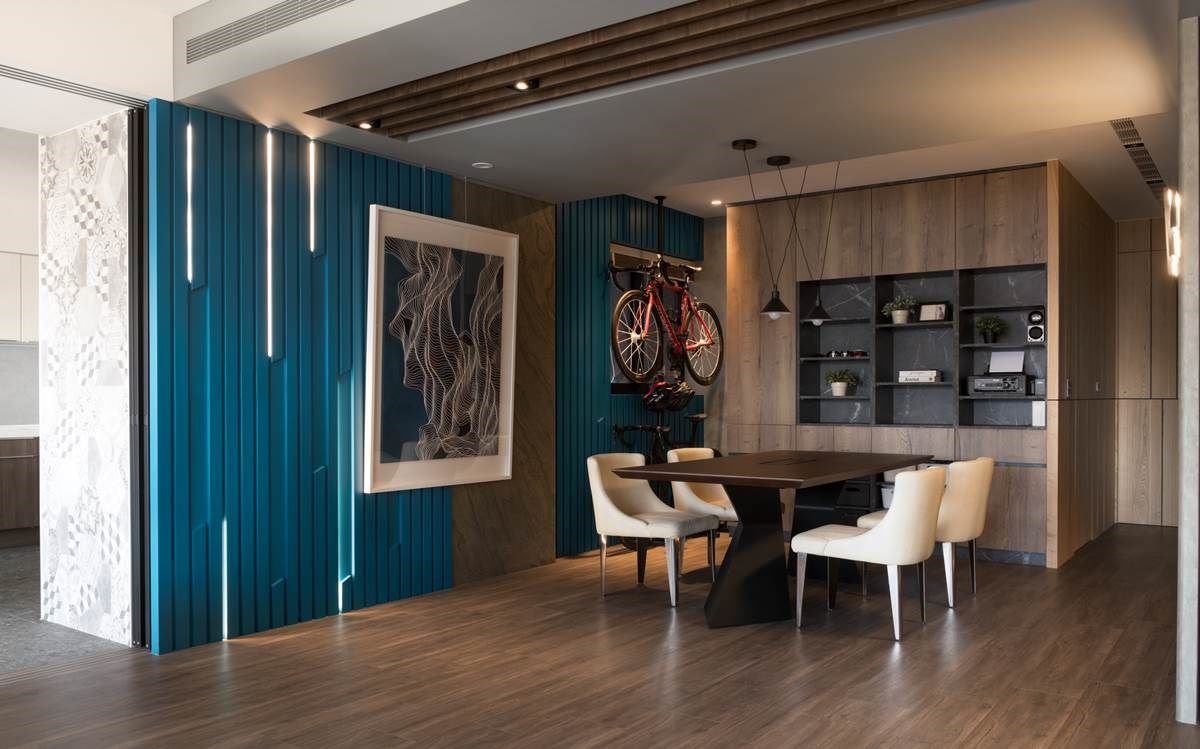 入口处的餐厅区可兼具开放书房,深色木纹的桌子搭配展示柜与间接照明,营造出柔和放松感。蓝色的长条木纹堆栈出立体墙,搭佐条状 LED 灯局部妆点,随着光影视觉与间接光线映照在线条感的艺术画作上,堆栈出渐层与神秘的艺术美感;此外,还设计出可陈列家人兴趣的单车架,与摆设风格对象的展示柜,纳入生活的点滴回忆,赋予人文温度与情感。