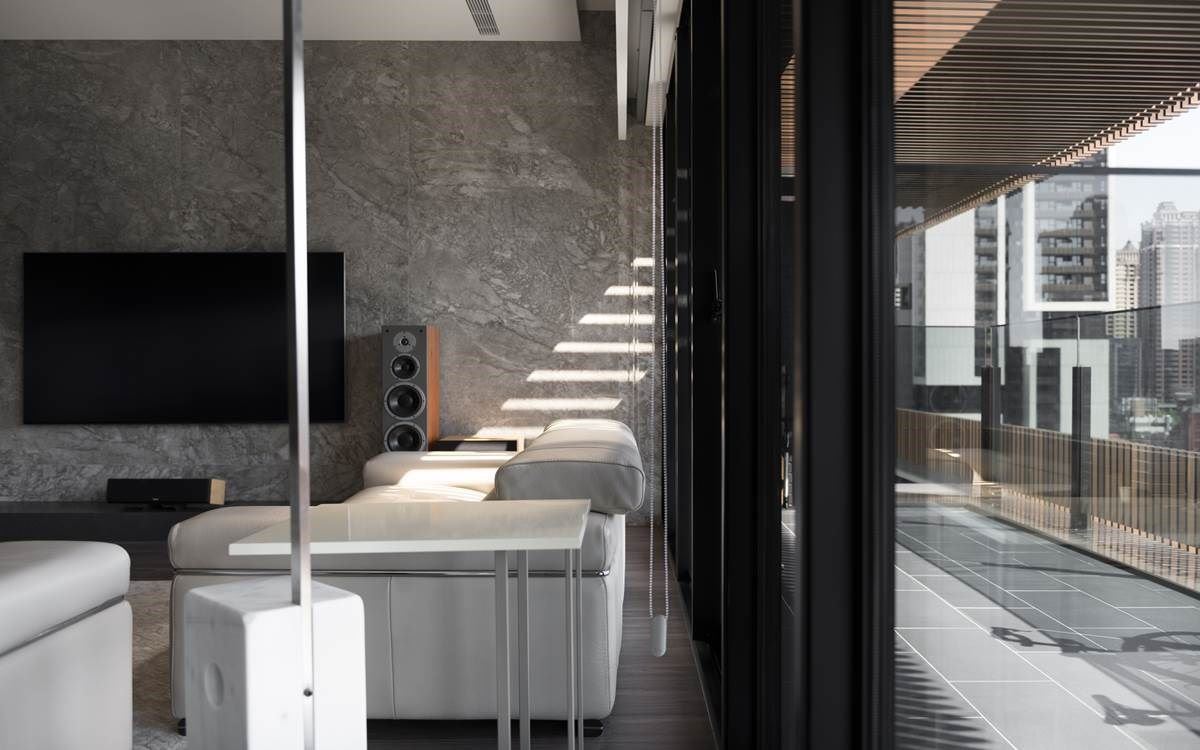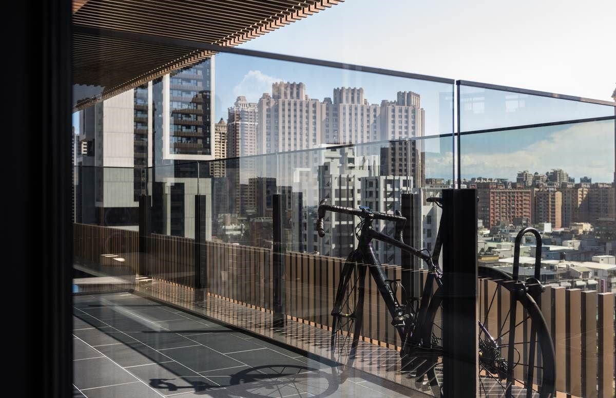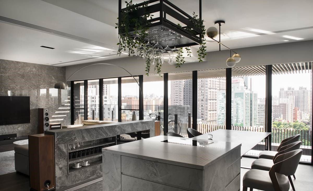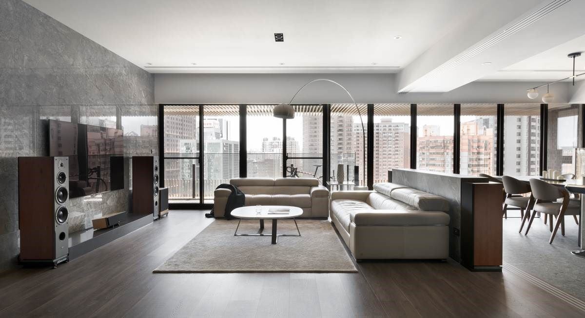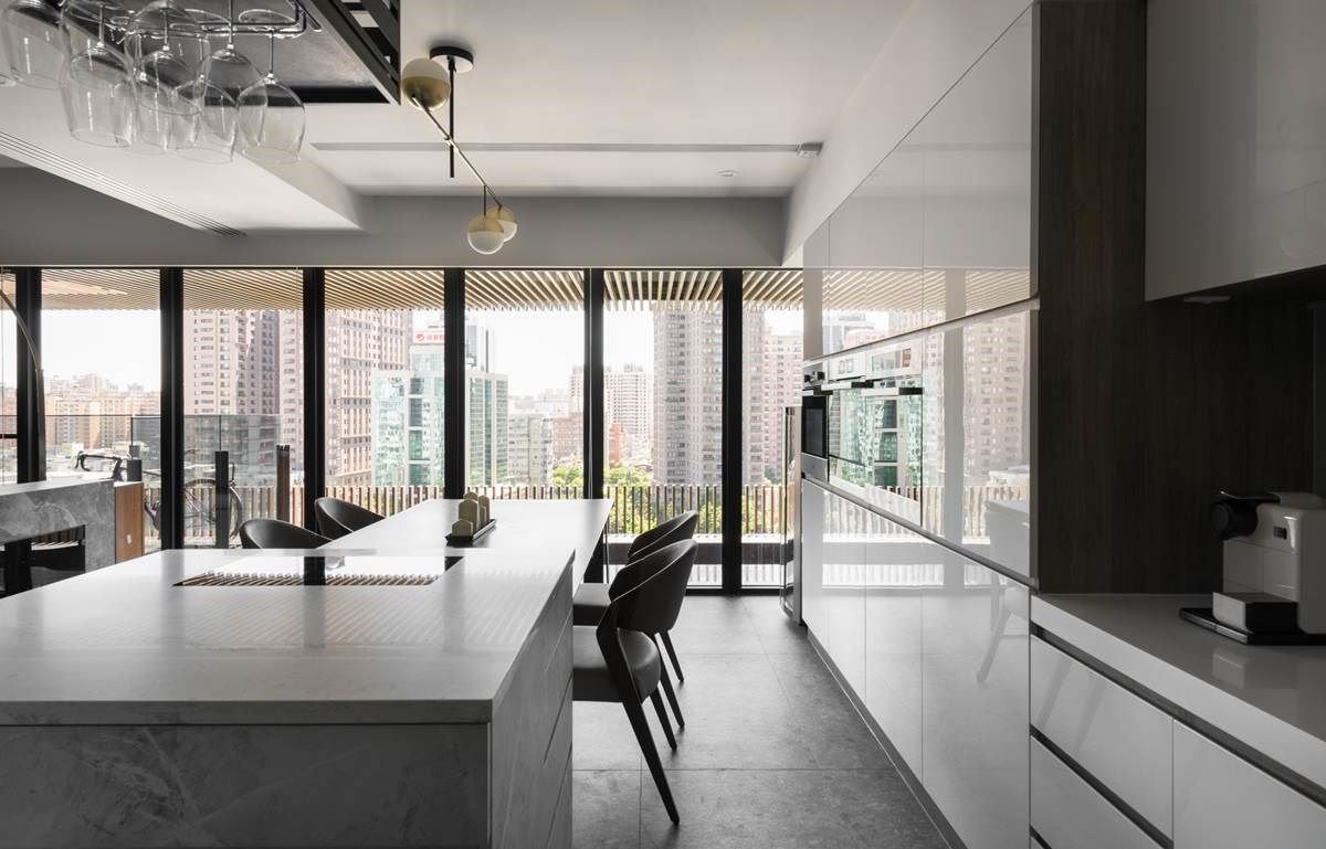 一整排窗景串连客厅、餐厅与厨房领域,通透的视觉引入户外城市建筑之美,引援充沛采光,整体空间更显开阔、舒心之感,外侧还打造一排阳台,可停放屋主收藏的单车,也能惬意浏览建筑风光;客厅搭配一面大理石电视墙,在简约色调的现代风里,更烘托一股轩昂气度。