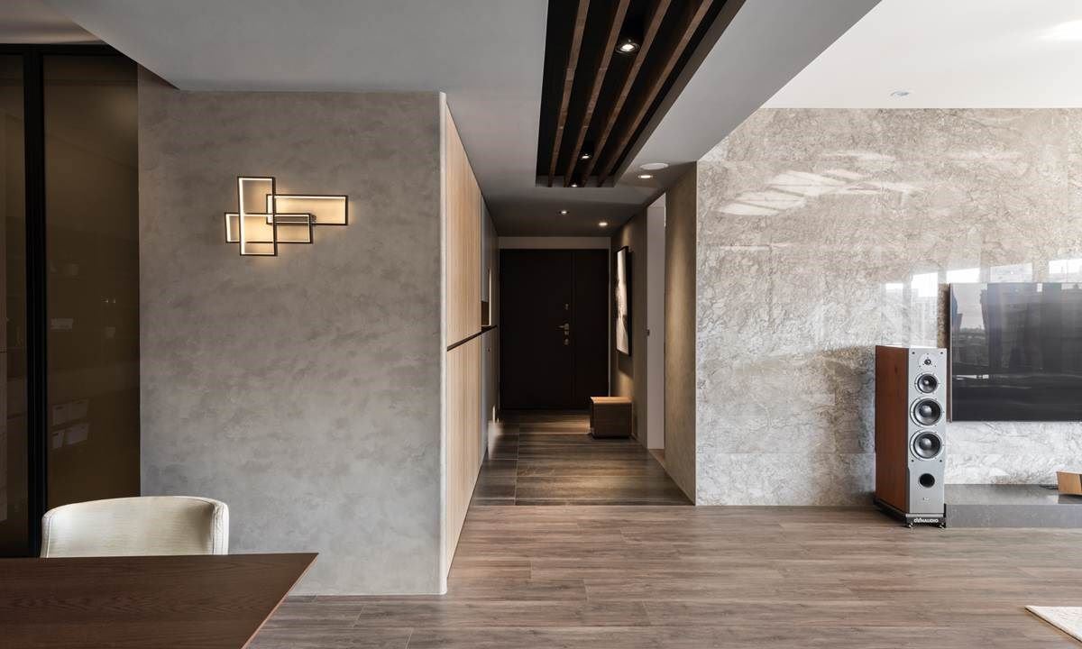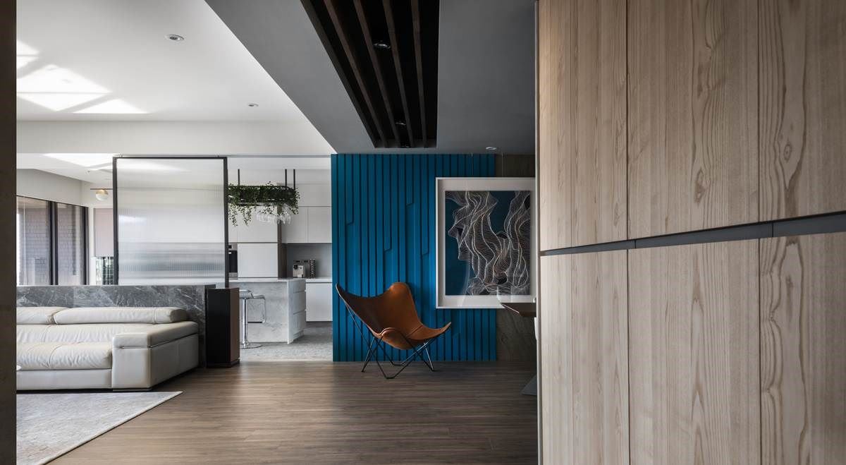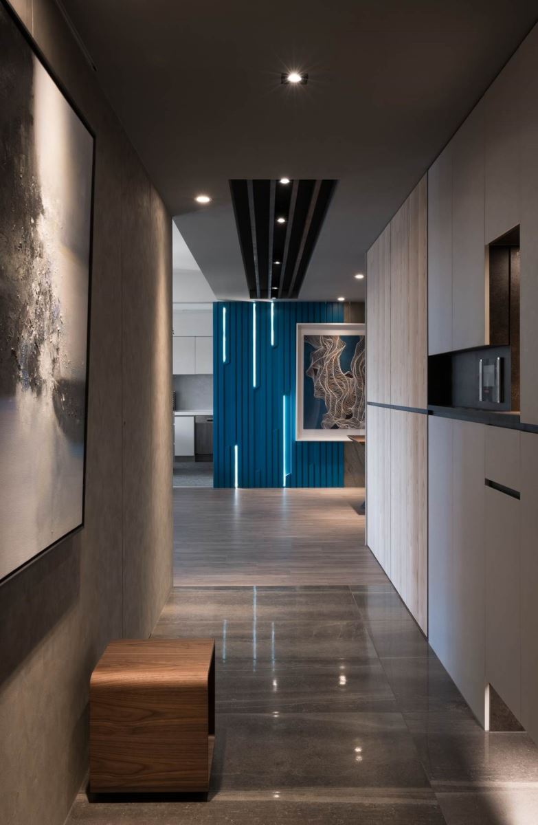 玄关上,透过天花板的嵌灯指引出动线,木纹收纳柜增添温润质感,大幅画作摆设加上木作穿鞋椅,营造出人文艺术端景视觉。前方一道蓝色渐层的墙体,随着不规则灯条的妆点,吸引眼球,让人想往前一探究竟。