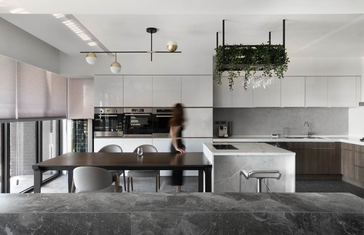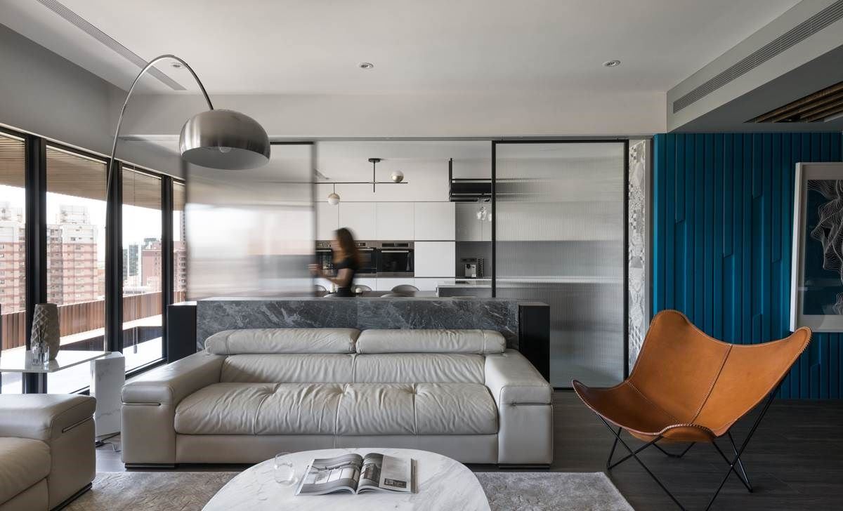 “延揽城市美景,且以简约利落的线条感与艺术灵感,描绘出利落的现代时尚,让私宅也成为城市艺廊。” 330 平米的空间里,擅用利落的线条感妆点室内,且串连领域。大面窗景引入户外建筑城市,让人期待每一天的动人日光;蓝色立面的视觉墙,搭佐 LED 灯与画作,强化私宅个性;大型中岛的营造满足一家五口共聚的美好时光。