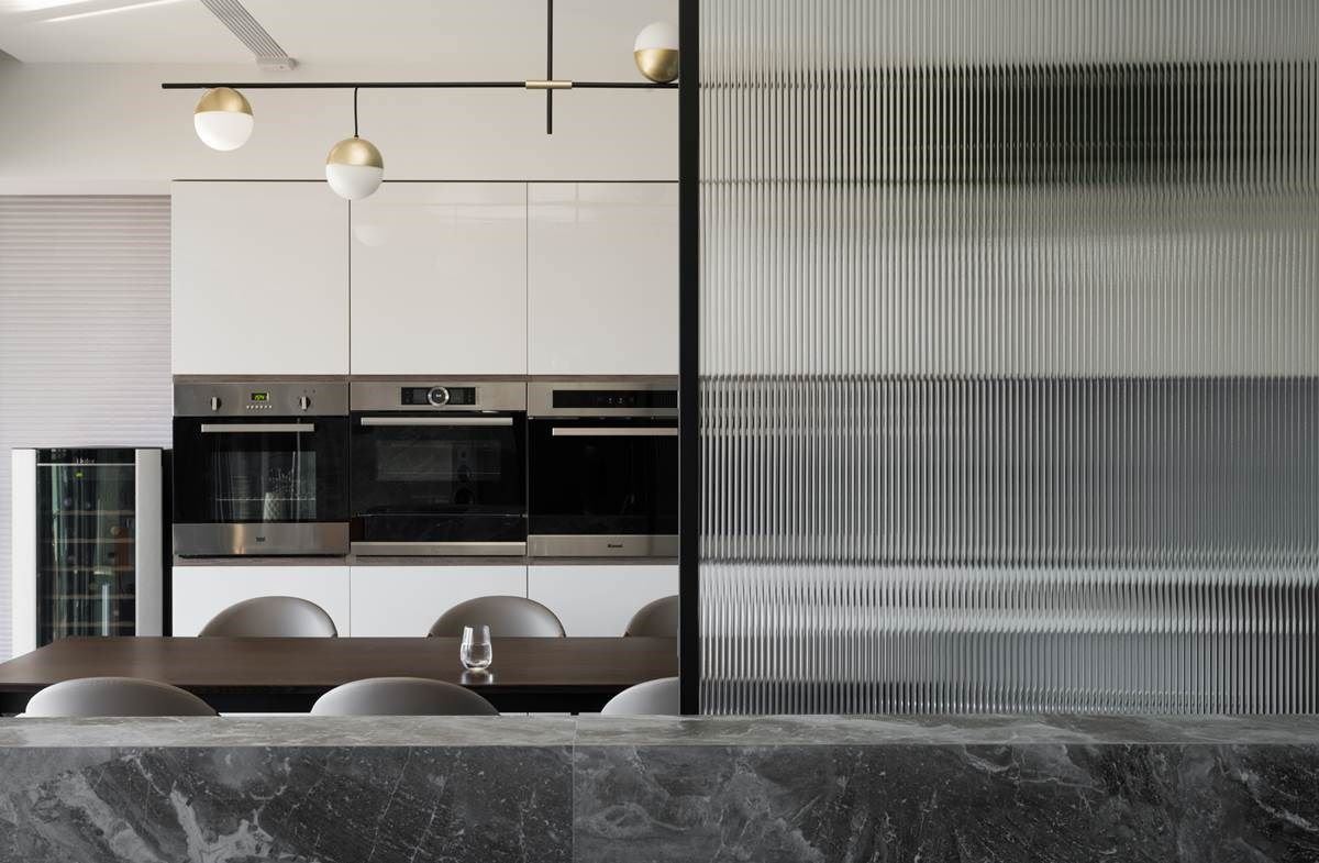 沙发后方是餐厨领域,沙发背墙的另一侧作为收藏杯盘器皿的柜体,木纹餐桌与中岛串连,打造出家人日常的互动情境,也营造出与亲友享受假日时的派对时光。设计师透过玻璃拉门的弹性隔断,让空间可保有全然开放,或是烹调时杜绝油烟飘至公领域的窘境。