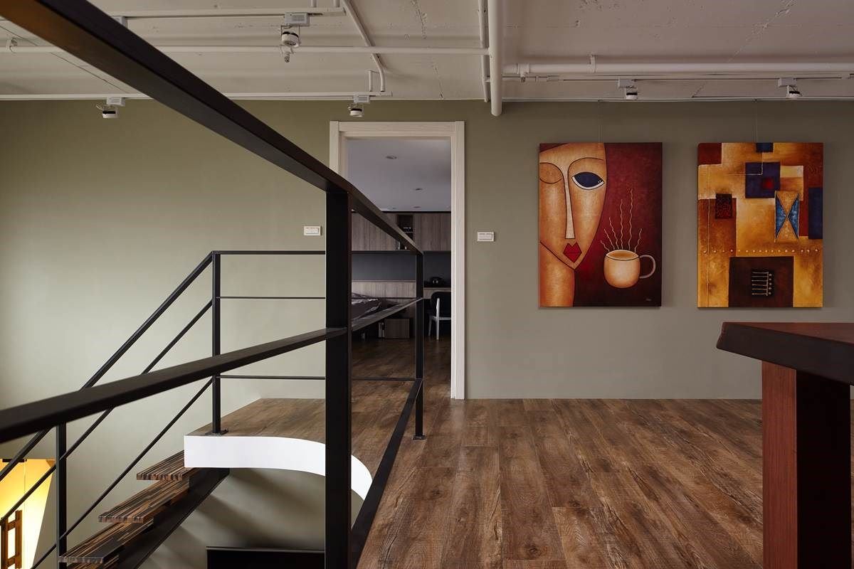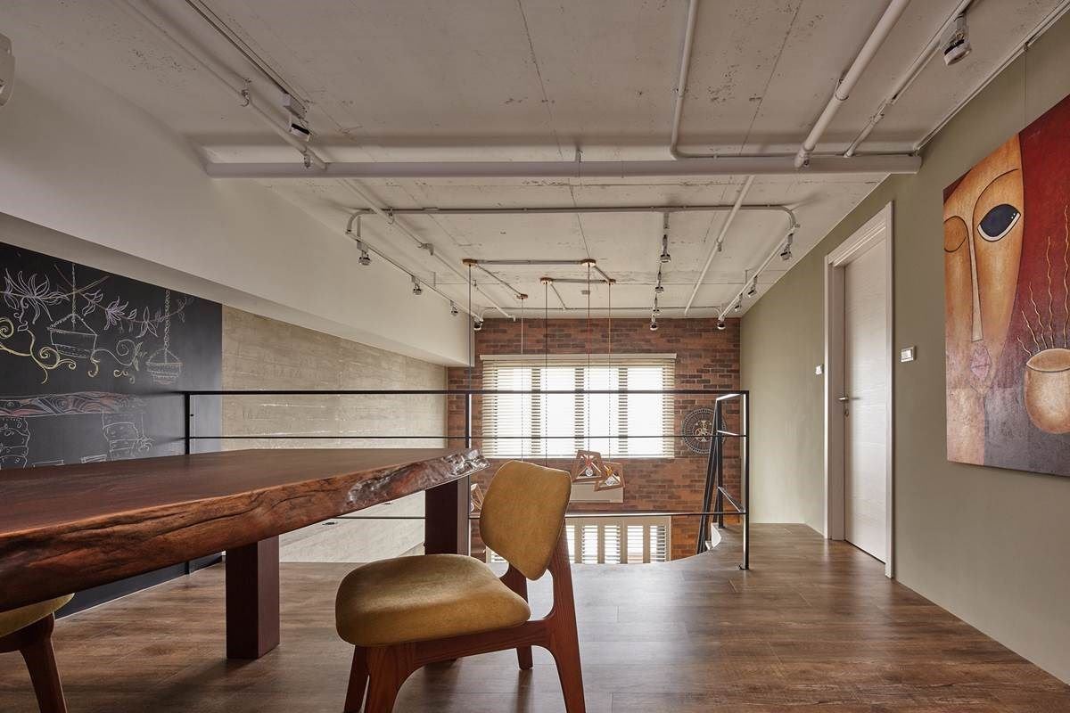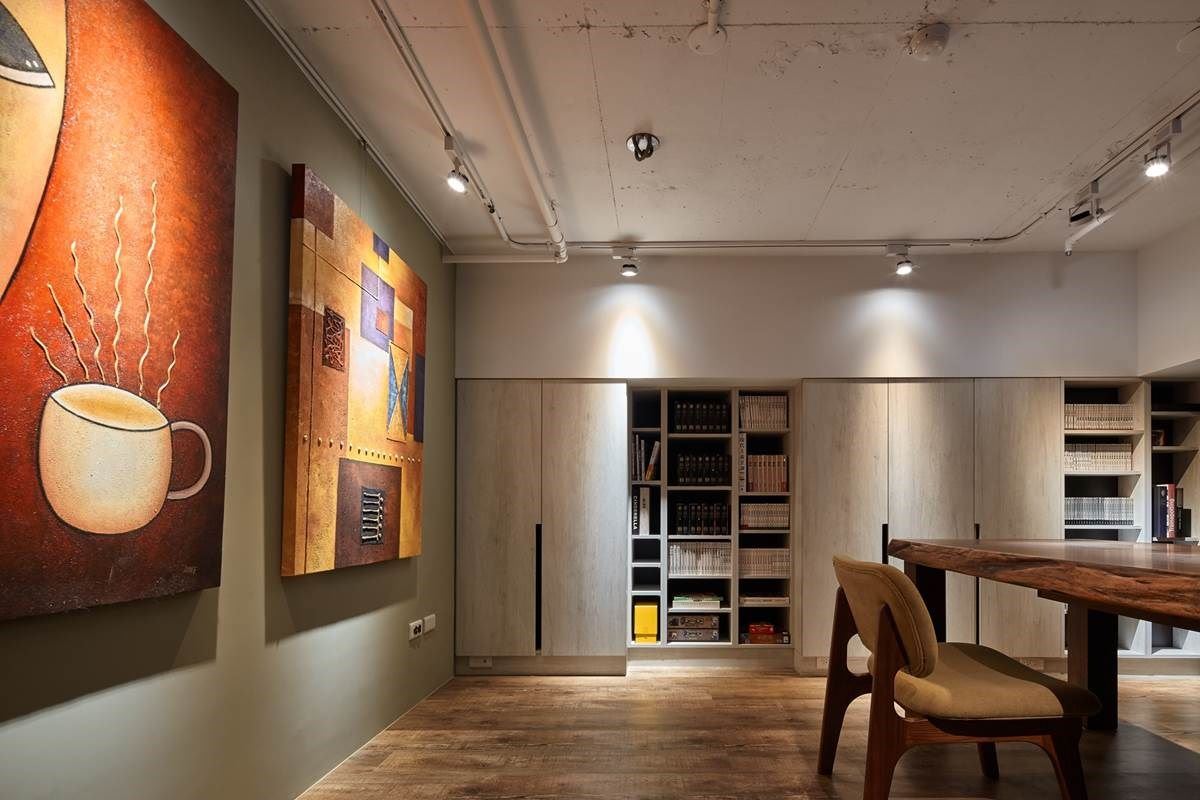 二楼空间里,磁性黑板墙与书柜围塑出开放书房区,伴随原木质感的书桌与低矮的椅子,靠近主卧的墙面更挂上线条简单、色彩饱合的现代感画作,营造出活泼感又不失书香气息。