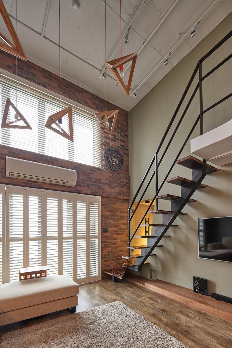 将最好的视野留给客厅,并以红砖墙铺设墙壁,结合白色的百叶窗门引入采光,沙发背墙则以水泥质感做为呈现,面向阶梯的墙面漆上芥末绿,对比的视觉增添层次,整体空间酝酿出自然、安定且舒心的视觉氛围;天花板悬挂几个高低错落的木作立体三角形吊灯,增添些许趣味。