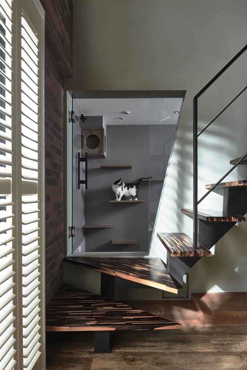 楼梯下方特别打造一处猫房,阶梯下方则创造秘密通道,让毛孩儿可随时回到猫房;而客厅的角落则安排猫踏板,高低交错的安排让毛孩儿能尽情走动、跳跃,让家中处处成为游戏天堂。