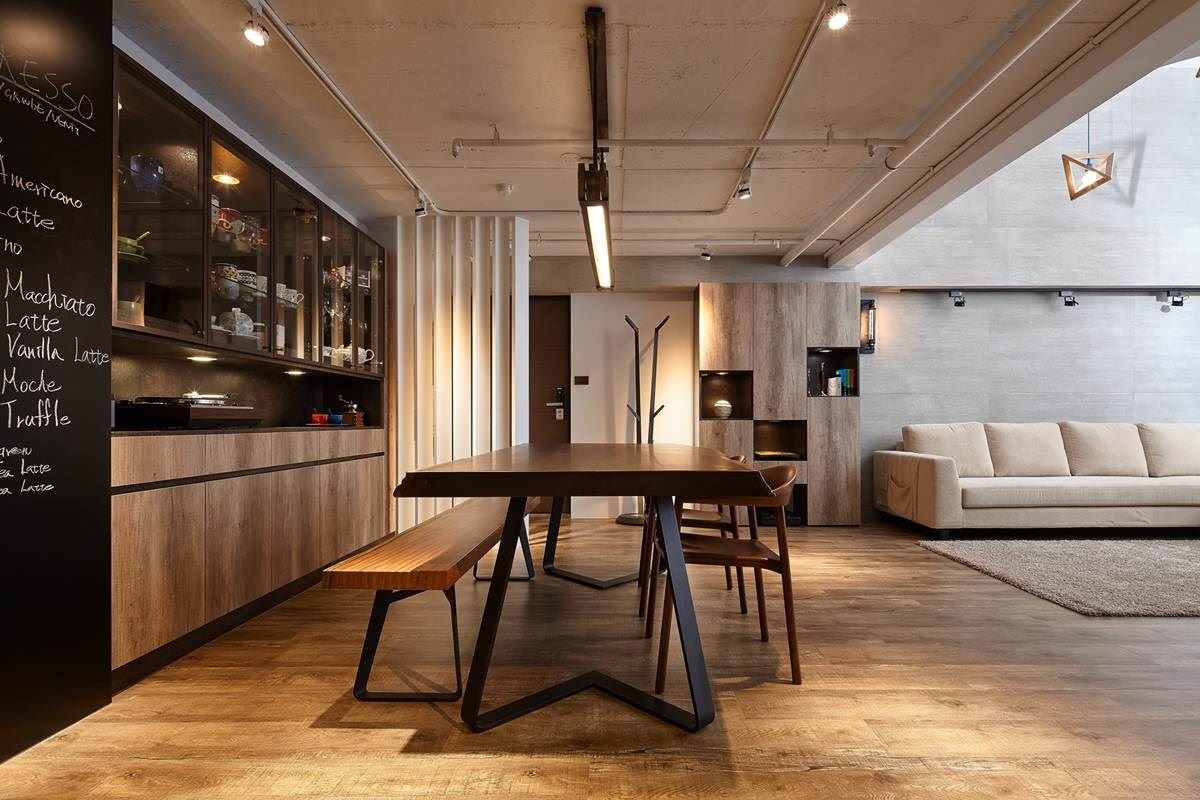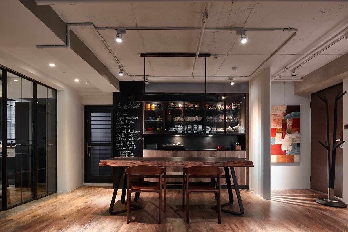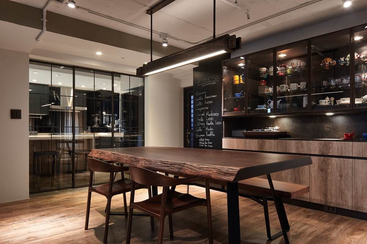 由于餐厅正对大门口,利用一道屏风巧妙界定,形塑一面具隐密性的视觉;空间里摆设原木餐桌椅,铁件与玻璃拉门打造后方具穿透性的餐柜,让屋主收藏的杯盘器皿转化为空间的艺术美学,一旁再串连长形的黑板墙,塑造出风格别具的主视觉;餐厅与厨房之间则以玻璃与铁件元素的拉门界定,平时可将拉门收整进壁面,让厨房也纳入公领域,整体空间更显开放宽敞。