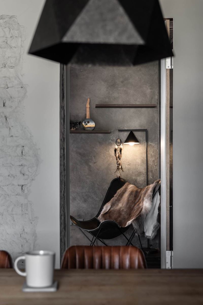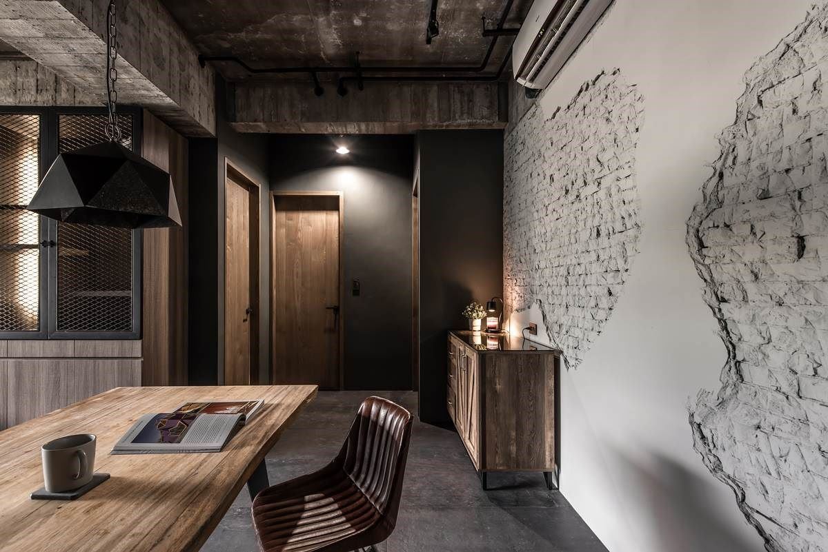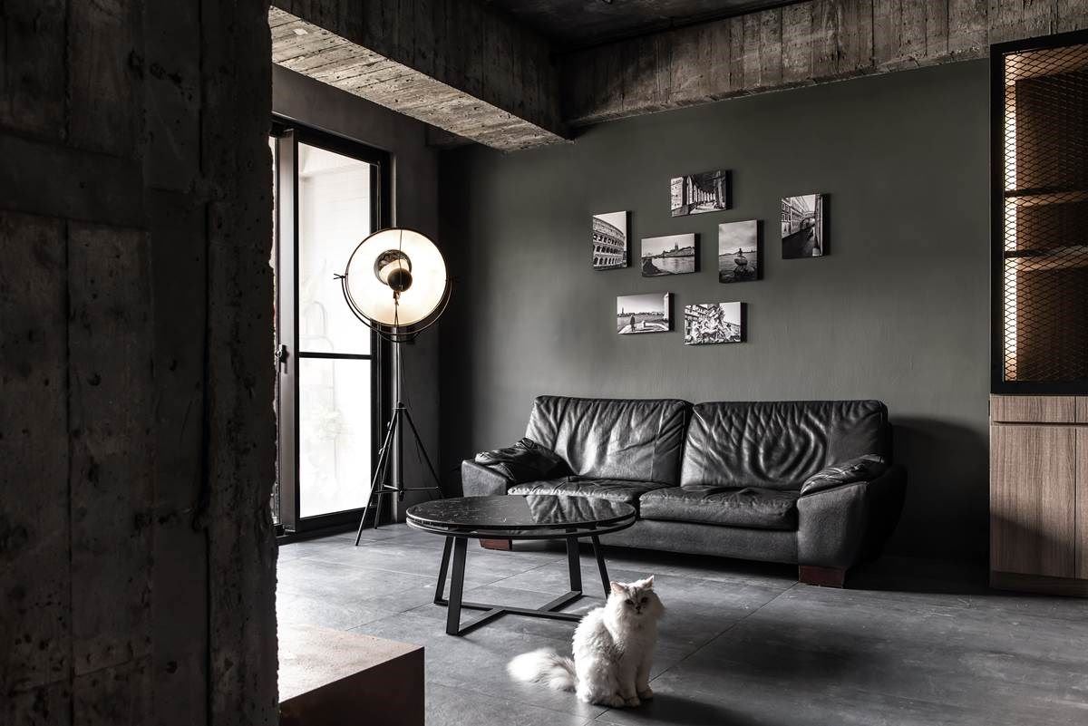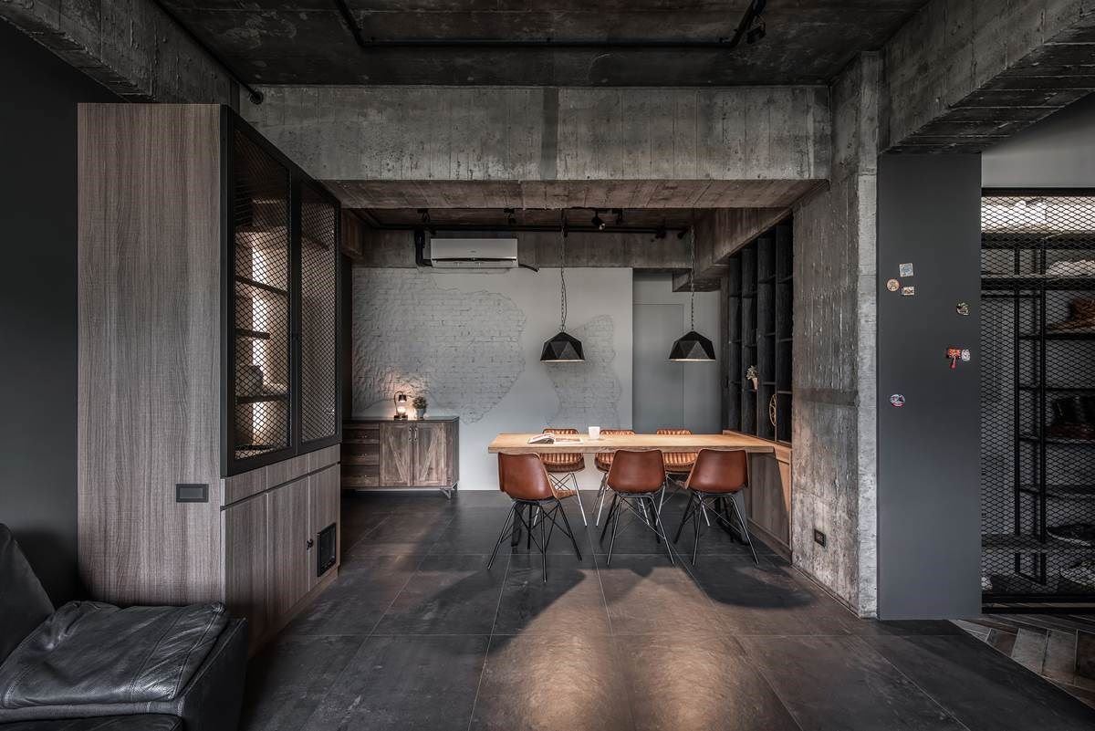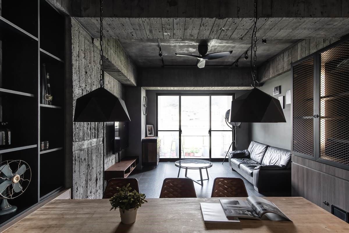 “裸妆般的灰泥板纹理,还原空间的自然风貌,融入原木质调的材料,让冷冽的基底增添柔软温度,伴随四季递嬗所产生的浓淡光线,调和出空间生命力!" 116 平米的开放家屋里,以屋主喜爱的粗犷工业风定调,大面采光映照出室内的色彩与肌理,展现沉稳、深邃的独特韵味;再透过皮革、铁件的安排,更感染一抹狂放不羁的动人魅力,而木纹质材的点缀,挹注自然的温度,释放出家的原始纯粹。