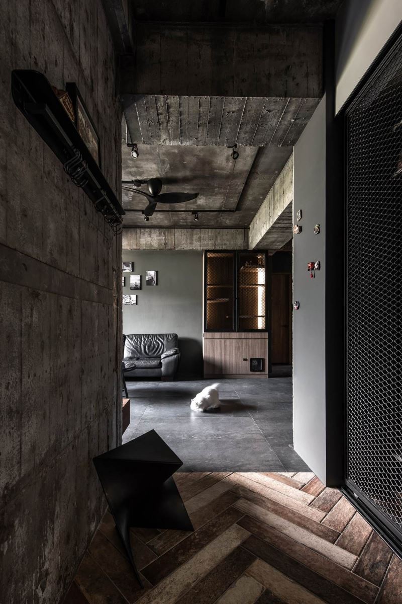玄关地坪铺设深浅木纹的人字拼设计,天花板与壁面饰以灰泥板模纹理,做为整体室内风格的开场;一旁的鞋柜则结合扩张网门片,消弭柜体的厚重感,且呼应粗犷的视觉风格。