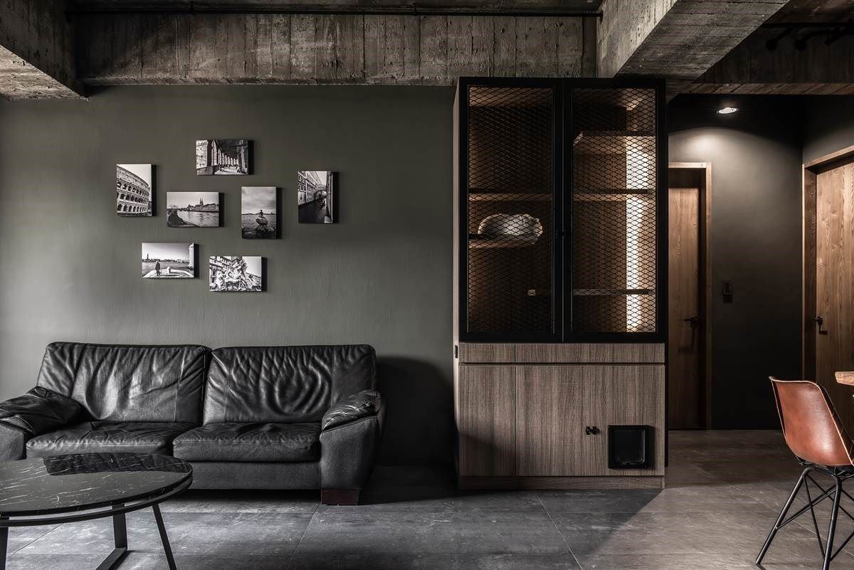 公领域以开放式手法呈现,引入充沛的自然光,让灰质调的空间更显开阔、明亮。沙发背墙以墨绿色打底,几幅小的黑白风景画点缀,搭配黑皮革沙发、黑色调石材茶几,以及仿旧木质柜体,诠释男屋主的专属韵味。沙发背墙的一旁以木纹质感为基底打造猫屋,上方覆以铁网,隐约的视觉让屋主能留意猫咪动向与状态。