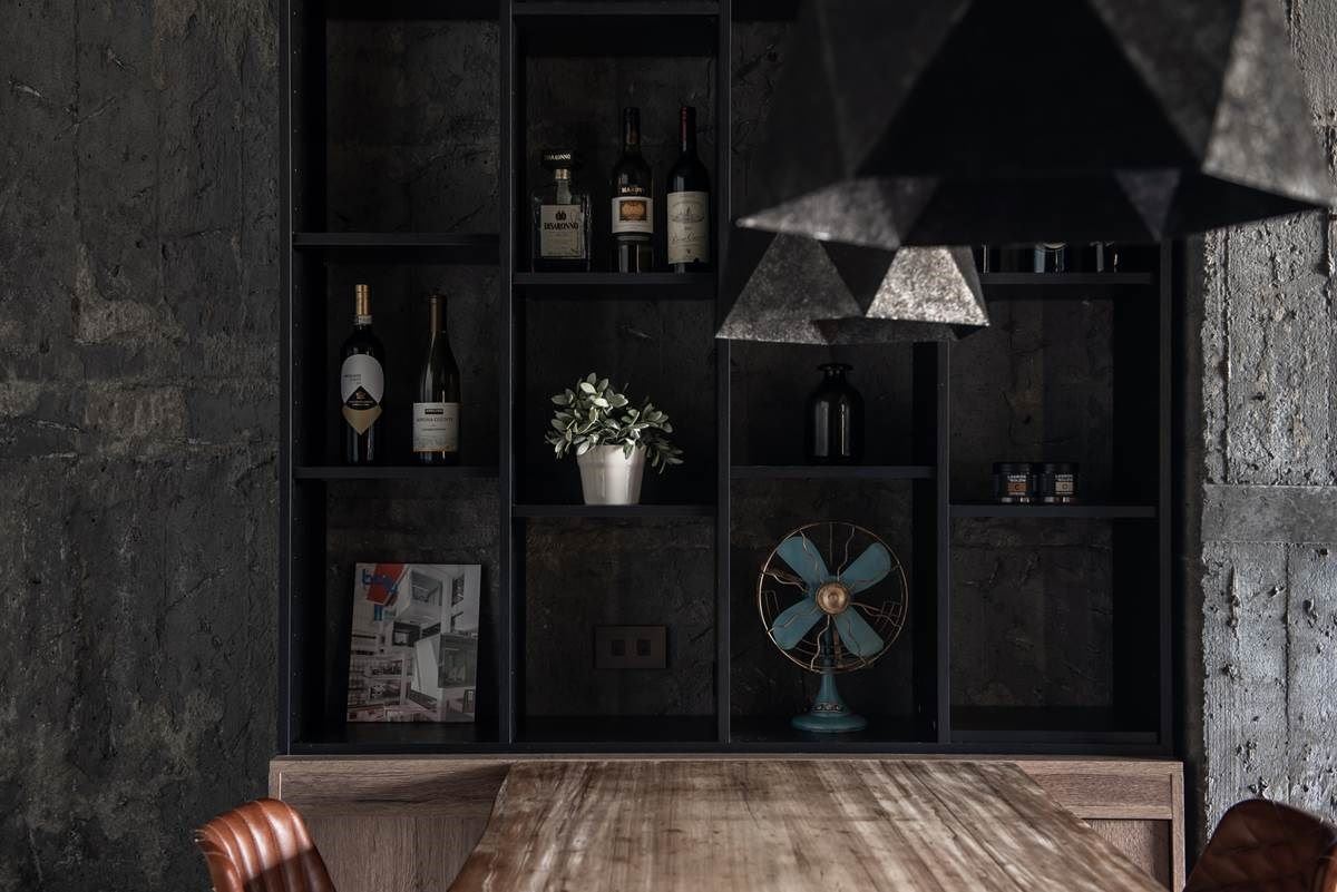 在一片沉稳、灰黑质感世界里,另一侧特别裸露出局部纯白砖墙,营造出景深且创造出丰富的空间表情。一张 Mountain Living 原木长餐桌搭配焦糖色餐椅,墙面以铁件嵌入开放收纳,陈列着植栽、收藏的复古对象,两盏几何线条勾勒的铁件吊灯,映照出温润的日常光景。