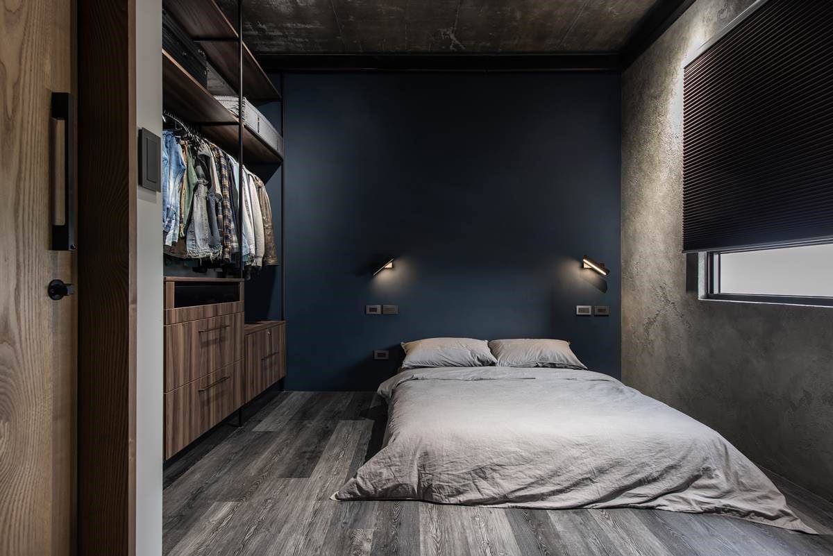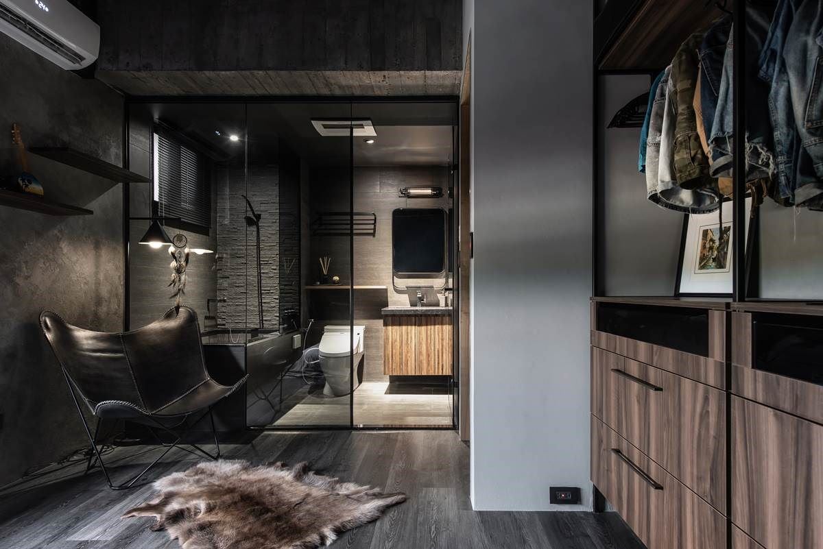居室里以深蓝色调为床头墙,长形的空间里还兼具展示、收纳机能,角落更安排一张复古黑色单椅以及收纳家具,流露屋主个人化的独特性格;透过玻璃拉门围塑出卫浴空间。