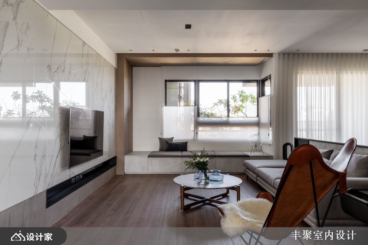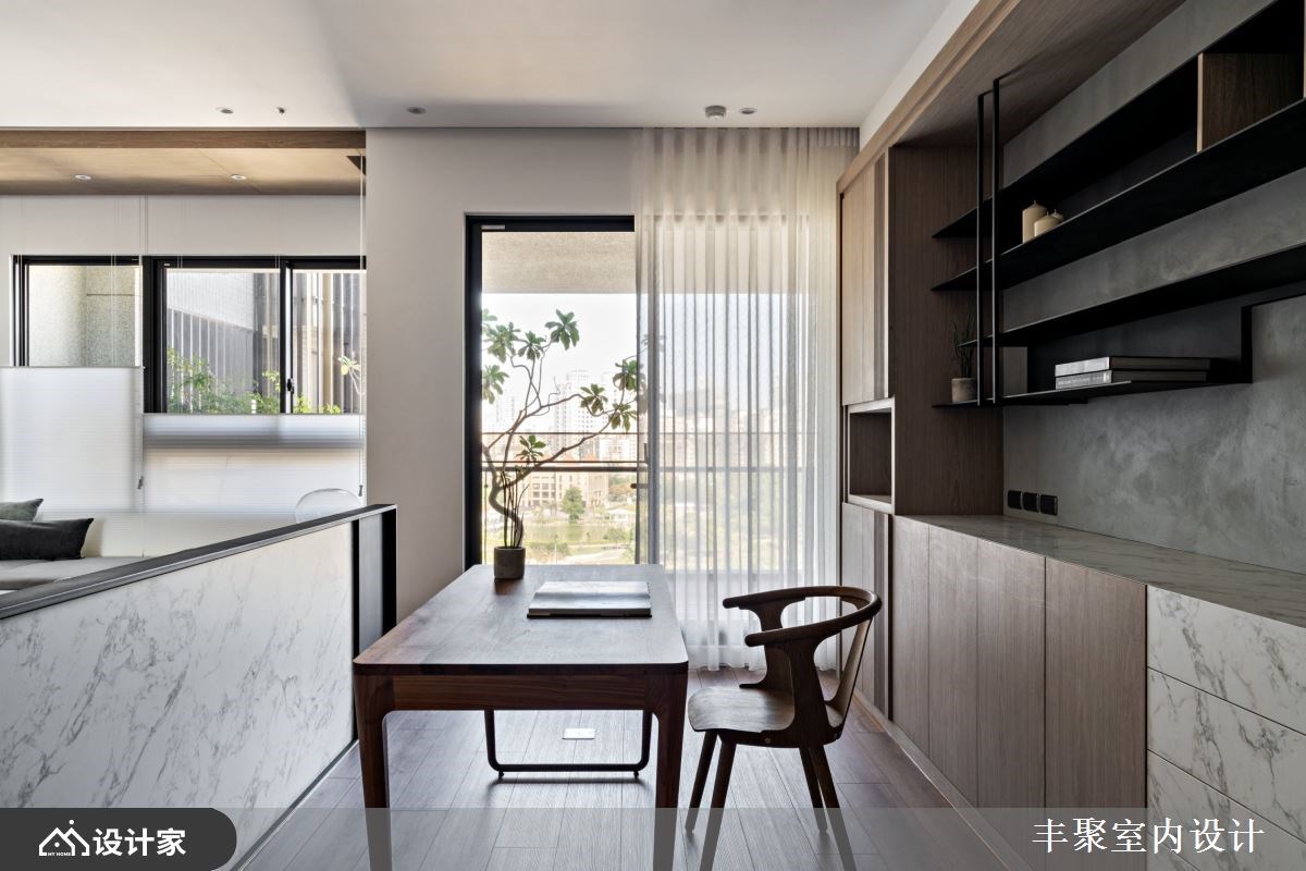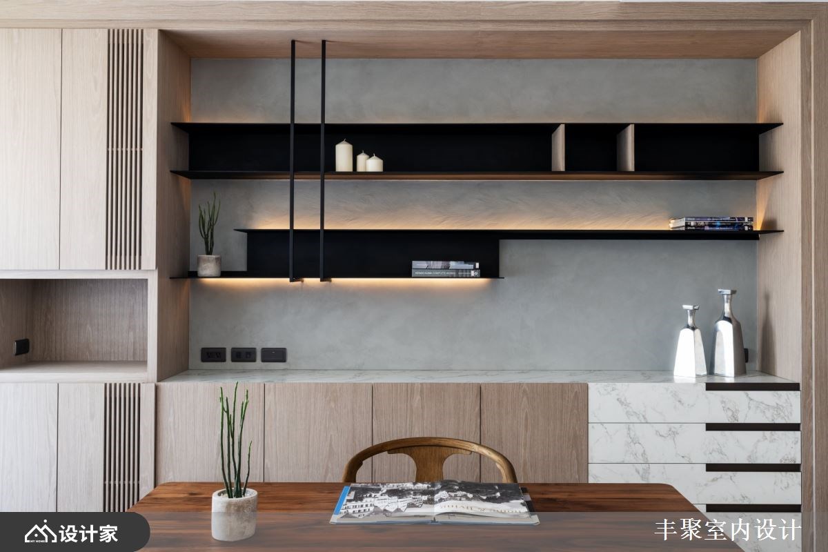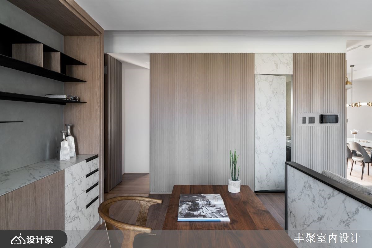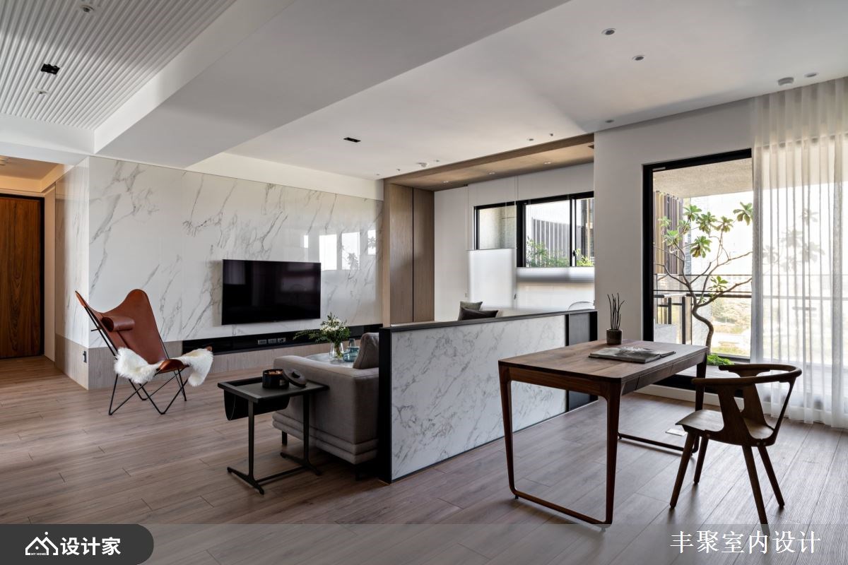 年轻夫妻对新家的期许不只在于风格与收纳,门对门、穿堂煞还有梁压床等风水禁忌也十分在意。158平方米新成屋里,设计师没有大幅度变动格局,而是在客厅砌一座矮墙就化解了所有令人担心的问题风水! 【微調格局 創造三贏】 设计师微调新成屋格局,拆除厨房电器柜旁边的隔断增加厨房深度,让厨房区域有空间安置一座中岛,扩容料理空间;位于另一侧的玄关与厨房共用墙面深度,把屋主期待的大容量鞋柜、穿鞋椅以及一日一柜都整合在玄关区域,简单变动墙面深度就形成客厅、厨房与玄关的三赢局面。 长型客厅中,设计师在空间里以雪白银狐进口薄板砖砌一座矮墙,在公共空间轻松划分出开放式书房,也让沙发有了靠背形塑家的靠山。身为设计核心的矮墙在材质上呼应电视主墙,长宽皆高出桌面的设计正好能替书桌桌面带来完整隐私。同样地手法,在书房增建一道轻隔断墙提升藏书本收纳量,更用书柜深度化解了房间门对阳台门的风水疑虑,但却能恣意享受前阳台的阳光洒落。 小编的最爱 设计师微调格局就优化空间、化解新成屋内的种种风水疑虑外,风格形塑上透过精致的进口薄板砖搭配温润木格栅。一家三口不论是待在客厅沙发还是阳光飘窗,于外能欣赏窗外公园绿景,对内则看到温润木格栅与雪白银狐砖建构出屋内的美丽端景。