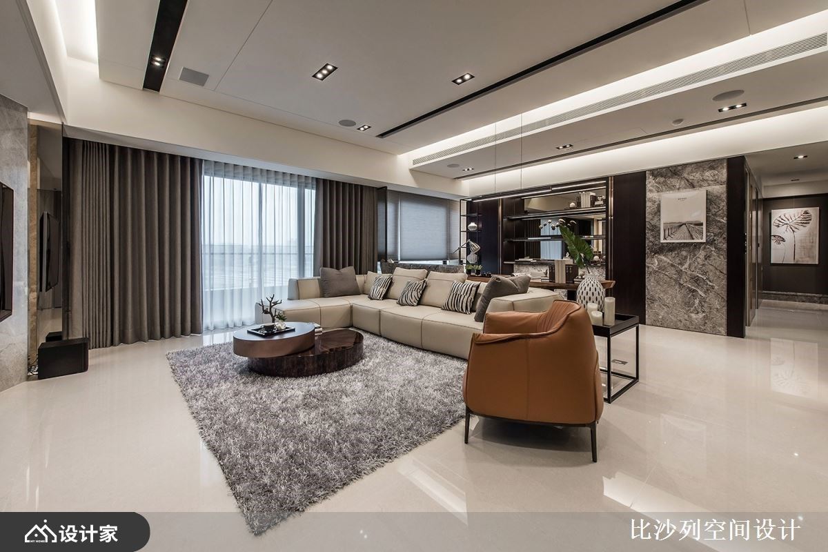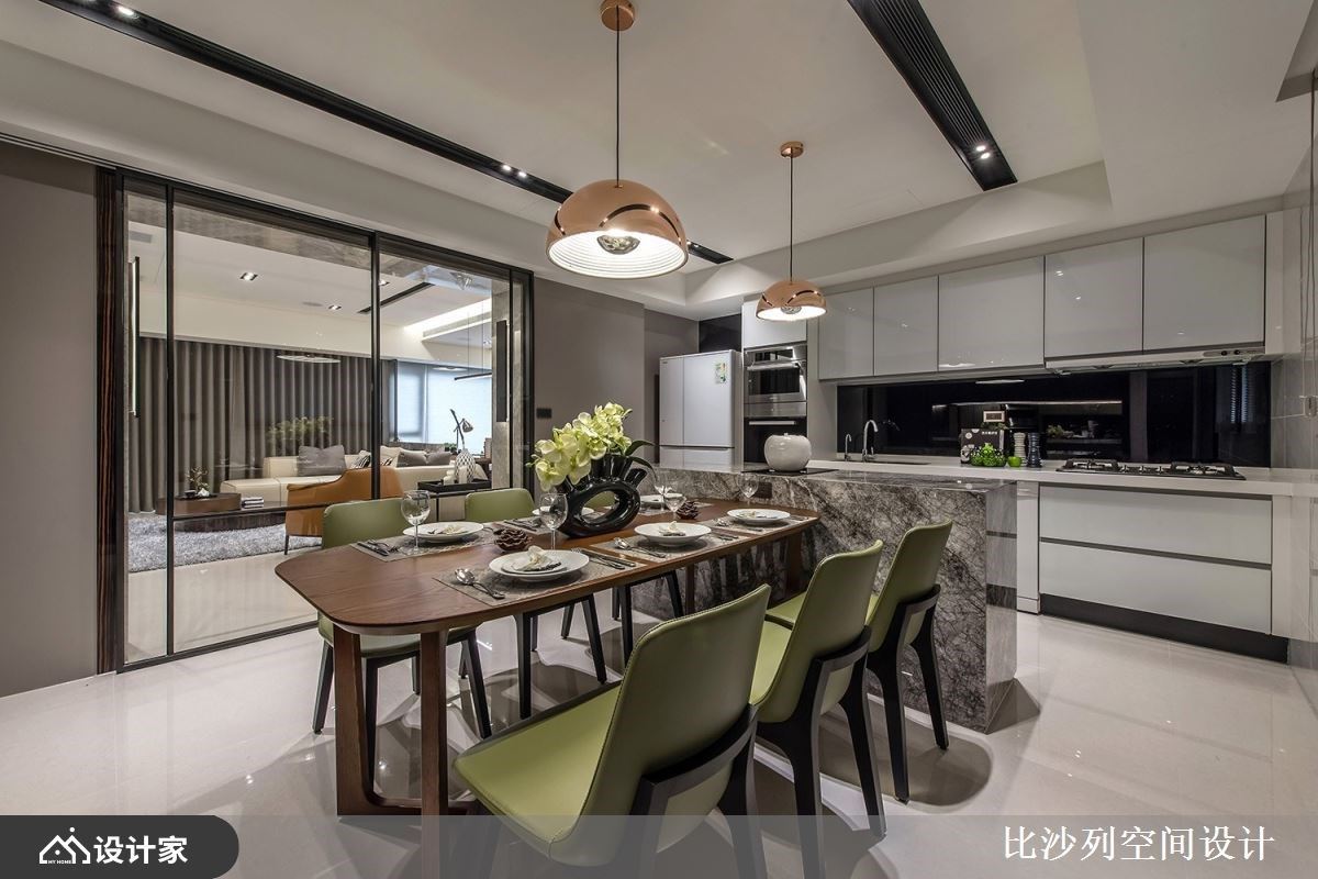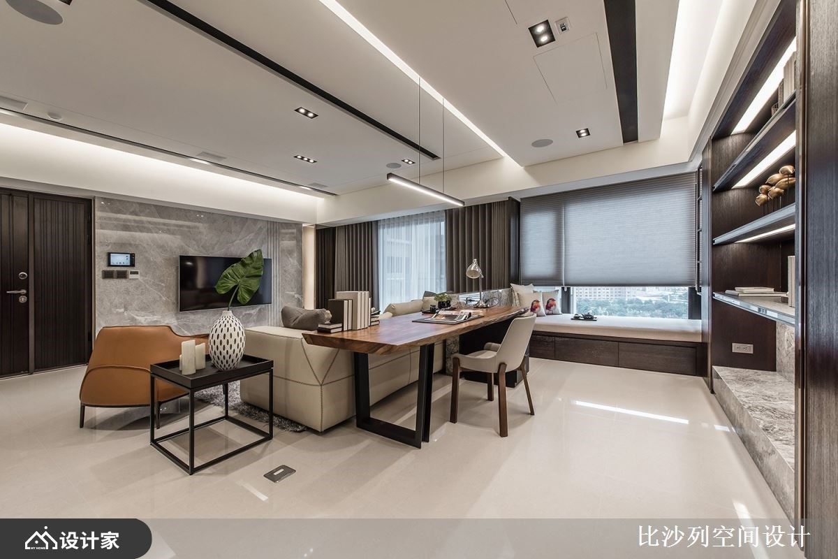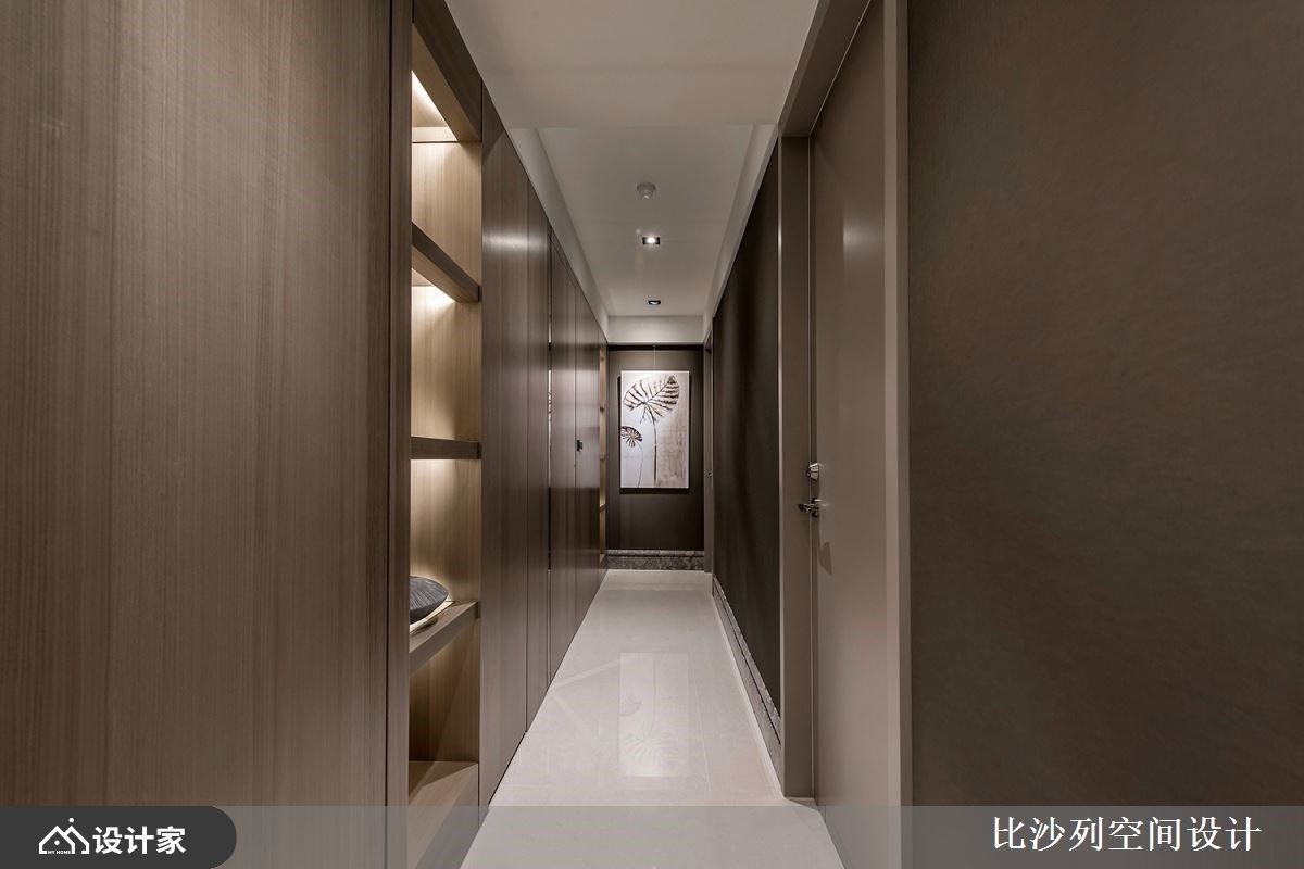 浅素色大理石电视墙以淡雅的肌理表现,让公领域挹注温润与雅致气息;L型沙发与灰色地毯、茶几,陈列出互动的核心领域;利用沙发划分领域界线,后方摆设原木质感书桌,创造开放书房区,临窗处增添卧榻机能,当阅读倦了,可切换乘坐方式,在卧榻区休憩片刻或是眺望窗外美景;而后方透过对称的深色木纹安排,中央利用木纹层板创造美学展示区,与廊道墙面相互呼应,而搭佐透亮的镜面材质妆点,随着光线反射,创造出透亮的精品质感,也放大空间的视觉效果。客厅旁利用玻璃拉门界定出餐厨领域,石材中岛与实木餐桌椅T字形摆设,建立流畅的日常动线,与宽敞的用餐环境,天花板悬挂圆形金属吊灯安排,擦亮视觉新意。 小编的最爱 廊道上串连私领域空间,以深色木纹为基底,伴随嵌灯照明,酝酿柔和的空间气息,加上尽头摆设一幅荷叶的艺术画作,增添一抹东方人文诗意。