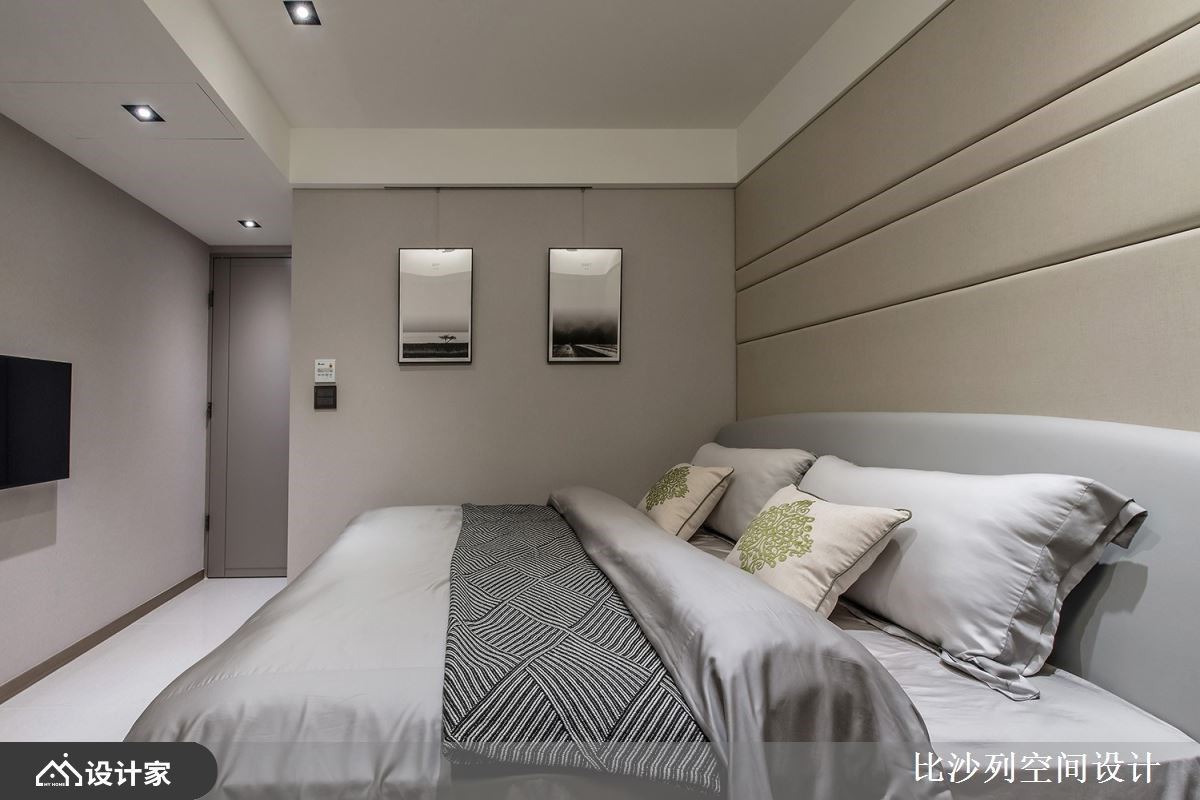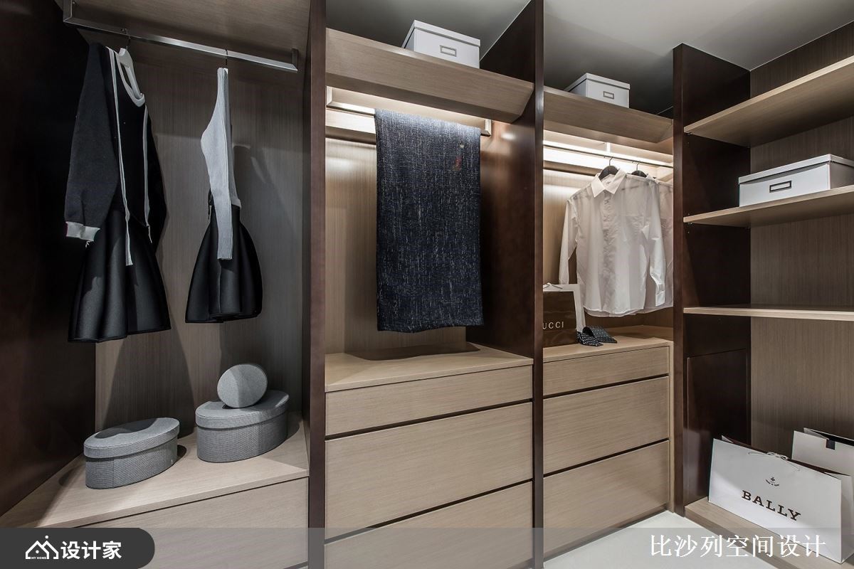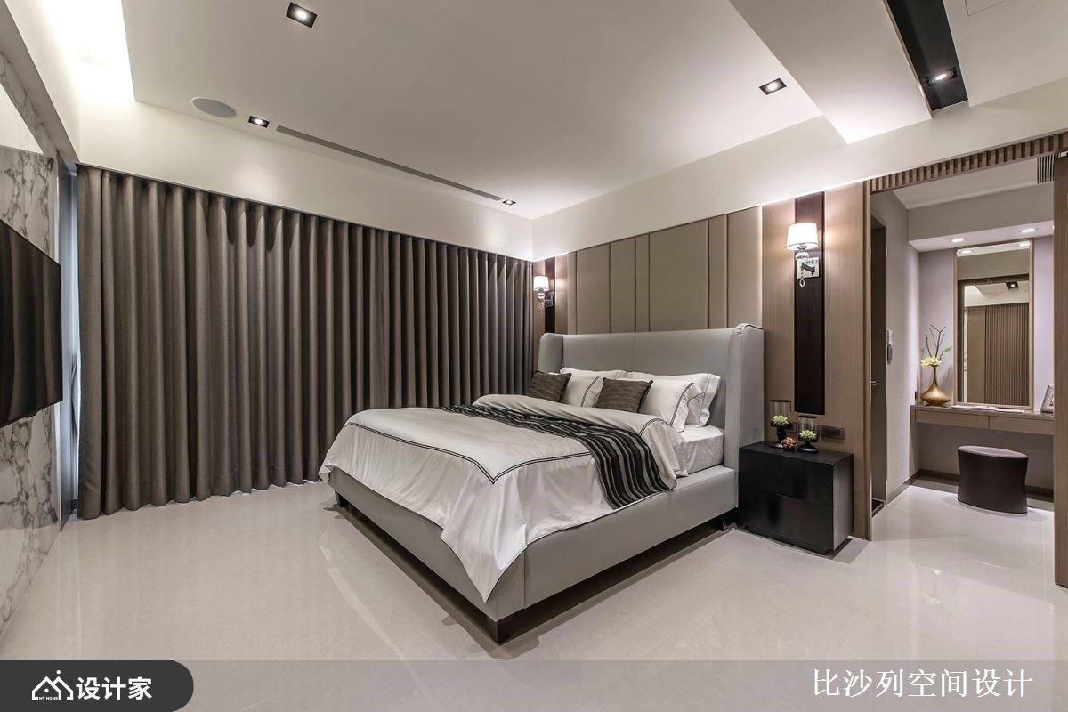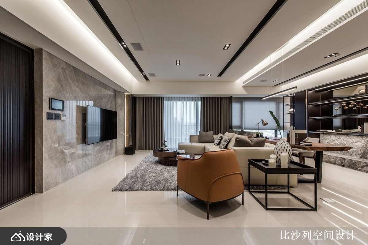 浅素色大理石电视墙以淡雅的肌理表现,让公领域挹注温润与雅致气息;L型沙发与灰色地毯、茶几,陈列出互动的核心领域;利用沙发划分领域界线,后方摆设原木质感书桌,创造开放书房区,临窗处增添卧榻机能,当阅读倦了,可切换乘坐方式,在卧榻区休憩片刻或是眺望窗外美景;而后方透过对称的深色木纹安排,中央利用木纹层板创造美学展示区,与廊道墙面相互呼应,而搭佐透亮的镜面材质妆点,随着光线反射,创造出透亮的精品质感,也放大空间的视觉效果。客厅旁利用玻璃拉门界定出餐厨领域,石材中岛与实木餐桌椅T字形摆设,建立流畅的日常动线,与宽敞的用餐环境,天花板悬挂圆形金属吊灯安排,擦亮视觉新意。 小编的最爱 廊道上串连私领域空间,以深色木纹为基底,伴随嵌灯照明,酝酿柔和的空间气息,加上尽头摆设一幅荷叶的艺术画作,增添一抹东方人文诗意。