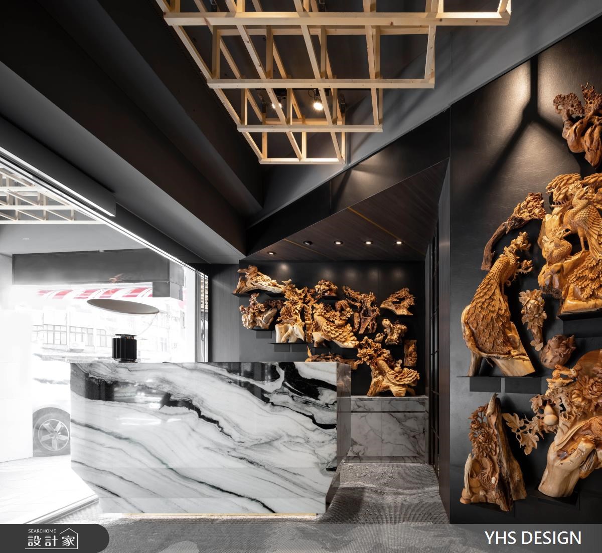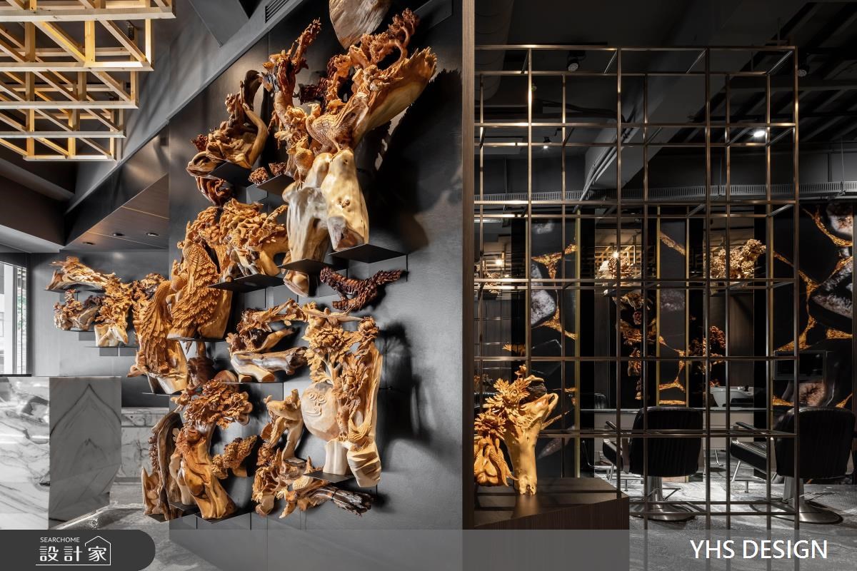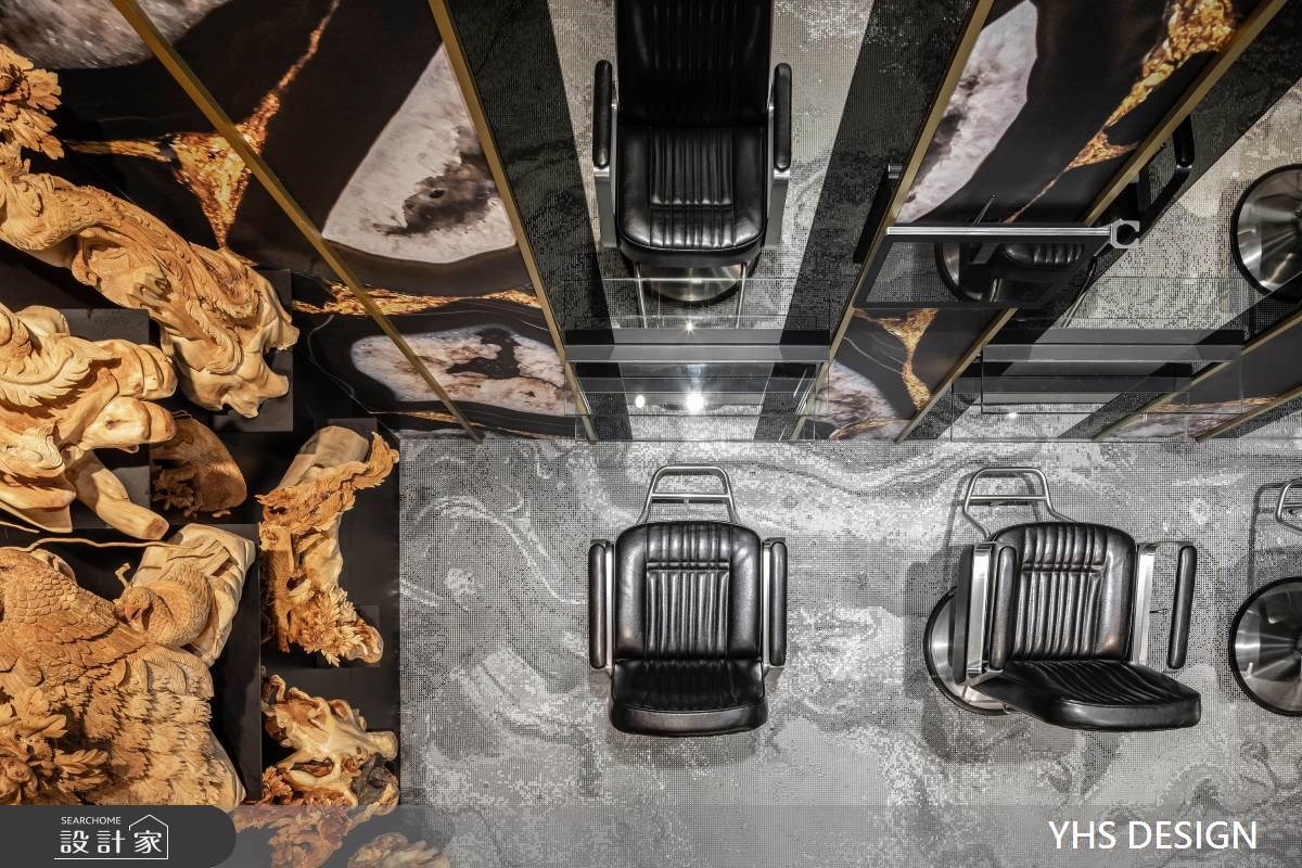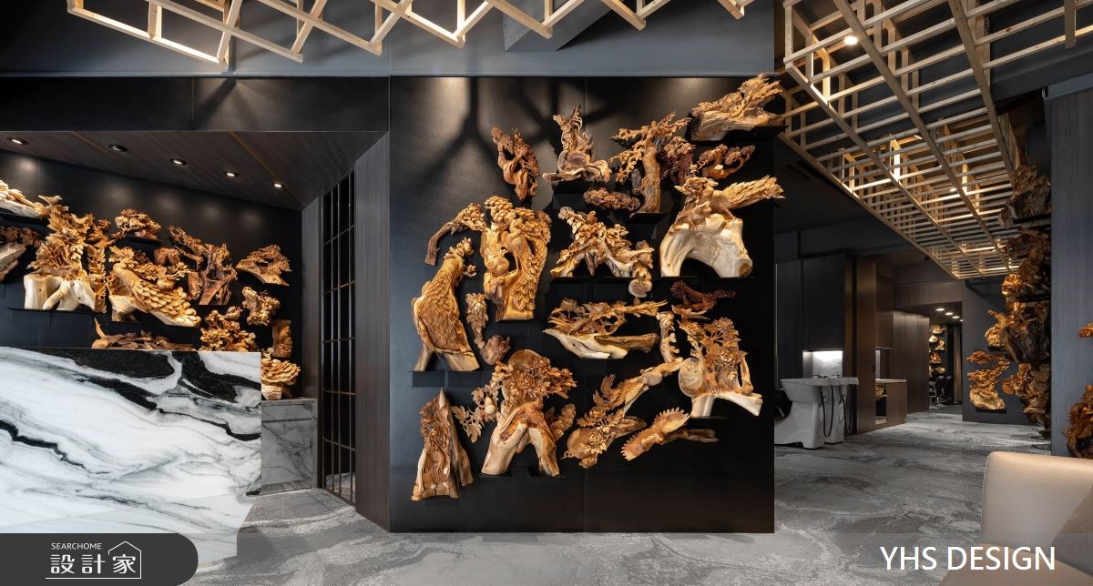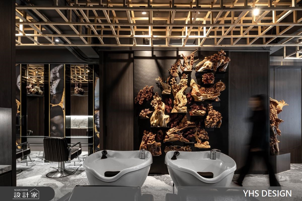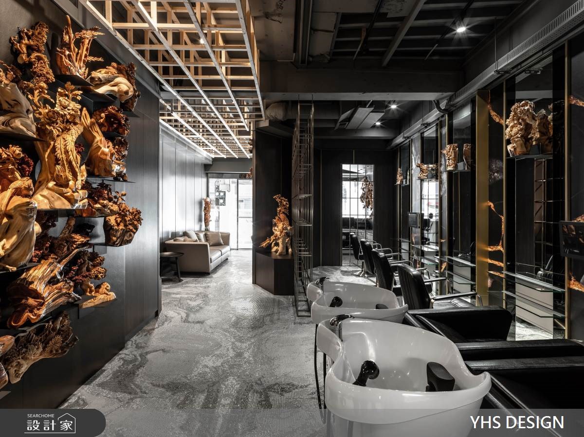 女性在发廊空间待的时间很长,剪发、护发、染发、烫发等等项目常常占据周末的大半天,面对一成不变的发廊空间是否常坐到腰酸背痛,只能翻翻杂志滑滑手机度过漫长的美发时光。YHS DESIGN将木雕艺术结合商业空间常见的明镜、铁件,打造出如艺廊一般的美发空间,让前来整理发型的顾客,在弄完造型步出发廊后也像是看了一个艺术展览。 【艺术气息入发廊】 柜台大理石如泼墨山水气势滂礴,黑色铁件与涂料建构的发廊空间利用木雕艺术装饰墙面,木雕艺术由大厅一直延续到走廊,形塑艺廊般的优雅气息。天花板上,利用日式木矩阵列画作天空的艺术品,替空间带来暖意,隔断运用铁件打造相同的矩阵,用材质表现艺术性。空间内大面积的明镜做了颜色处理让反射出的画面温和而隽永,在发廊空间里,不只整理了发丝也像是看了场艺术展览一样感到身心充实。 小编的最爱 颠覆一般设计发廊的手法,将木雕艺术作为发廊空间的设计主题,用艺廊策展思维做整体规划,从动线、材质、装饰面着手,发廊常见的设备也变成像是艺术作品一样陈列在空间中,搭配灯光布局,形塑出有别于商业空间带来的繁杂与喧闹,让顾客与发型师都能在沉静的空间享受这段美发时光。