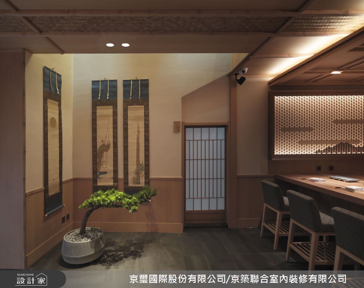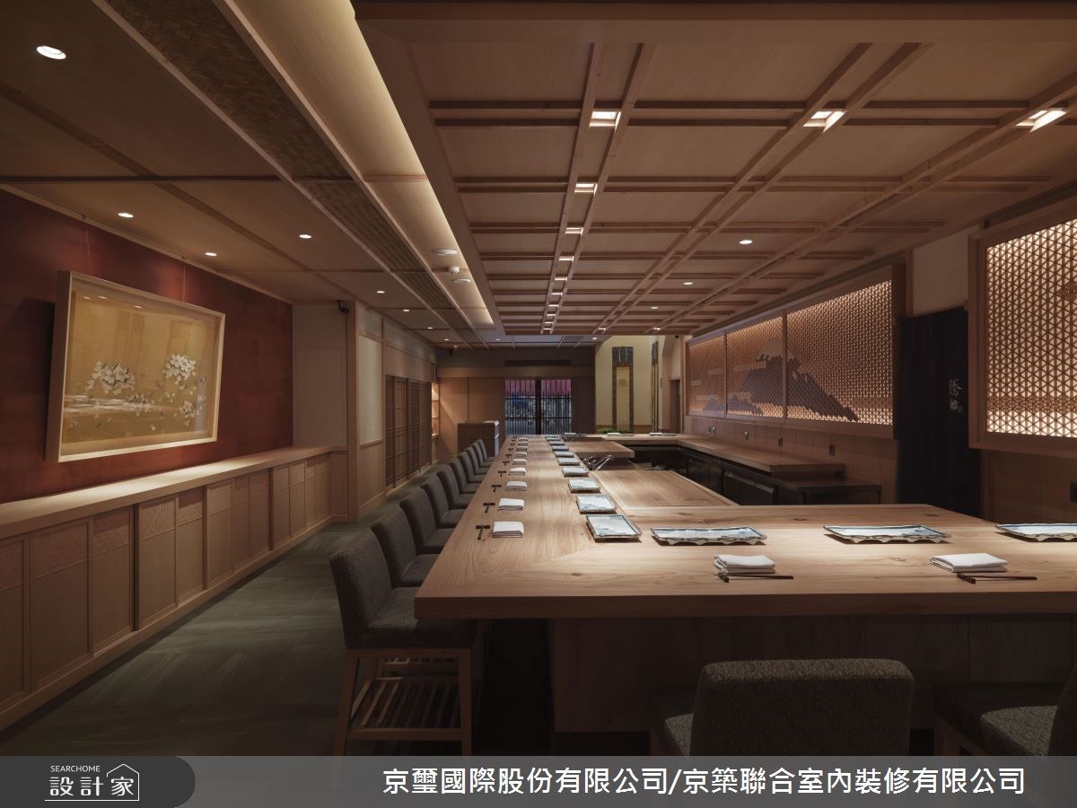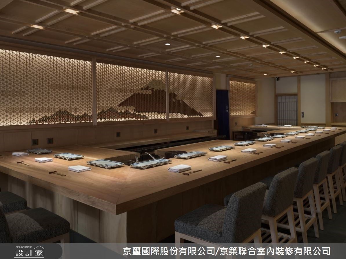 傍晚时分,天色渐渐暗了下来,台北街头这处 83 平米日式料亭入口,由「绵平织」暖红帘幕、「京都云龙面板」灯箱交织出温暖而低调的光氛,衬托着一旁木质门扇,迎来浓厚的传统和风料亭氛围,彷佛带着过路行人或前来享受美食的饕客,置身一回日本江户时代,体验韵味十足的怀旧风情。 推开木格栅门扇,满版的富士山艺术图象映入眼帘,为顾客献上第一道视觉飨宴。坐等美味佳肴时,细究这幅手工艺品,其精细的制作手法可追溯至日本飞鸟时代,由桧木与杉木等木片组合而成的几何图腾,完整勾勒富士山头雪白积雪样貌与云雾缭绕的自然风景,将艺术之美结合精致料理,带给饕客惊喜的日式用餐享受。ㄇ 字型的板前规划,打开现有坪数的视觉空间,让推开门的那刻起,即能将这幅富士山景画尽收眼底;比照传统日式屋檐打造的木结构天花板衬托着大幅艺术作品,则揉合了艺术与室内设计,奠定沉稳而壮阔的餐厅气氛。此外,开放式厨房理念,也拉近了顾客与料理长的距离,能轻松随兴地谈天,也能近距离欣赏师傅们的料理手艺。 小编的最爱 廊道上,手染蓝色丝拉夫布的垂幔、和纸墙上摆挂的浮世绘画作,蔓延着浓厚的日式风情,各领域彼此相互呼应,由外而内串起完整的江户时代景致。