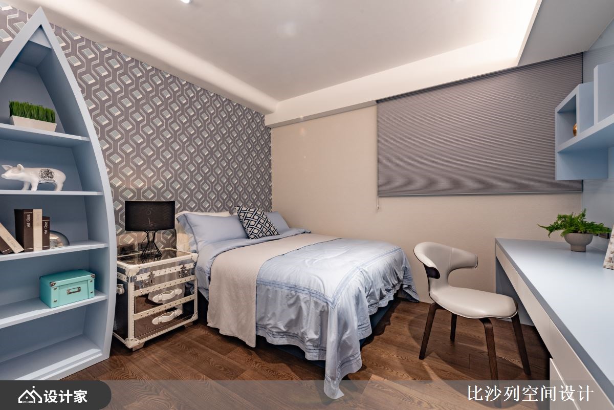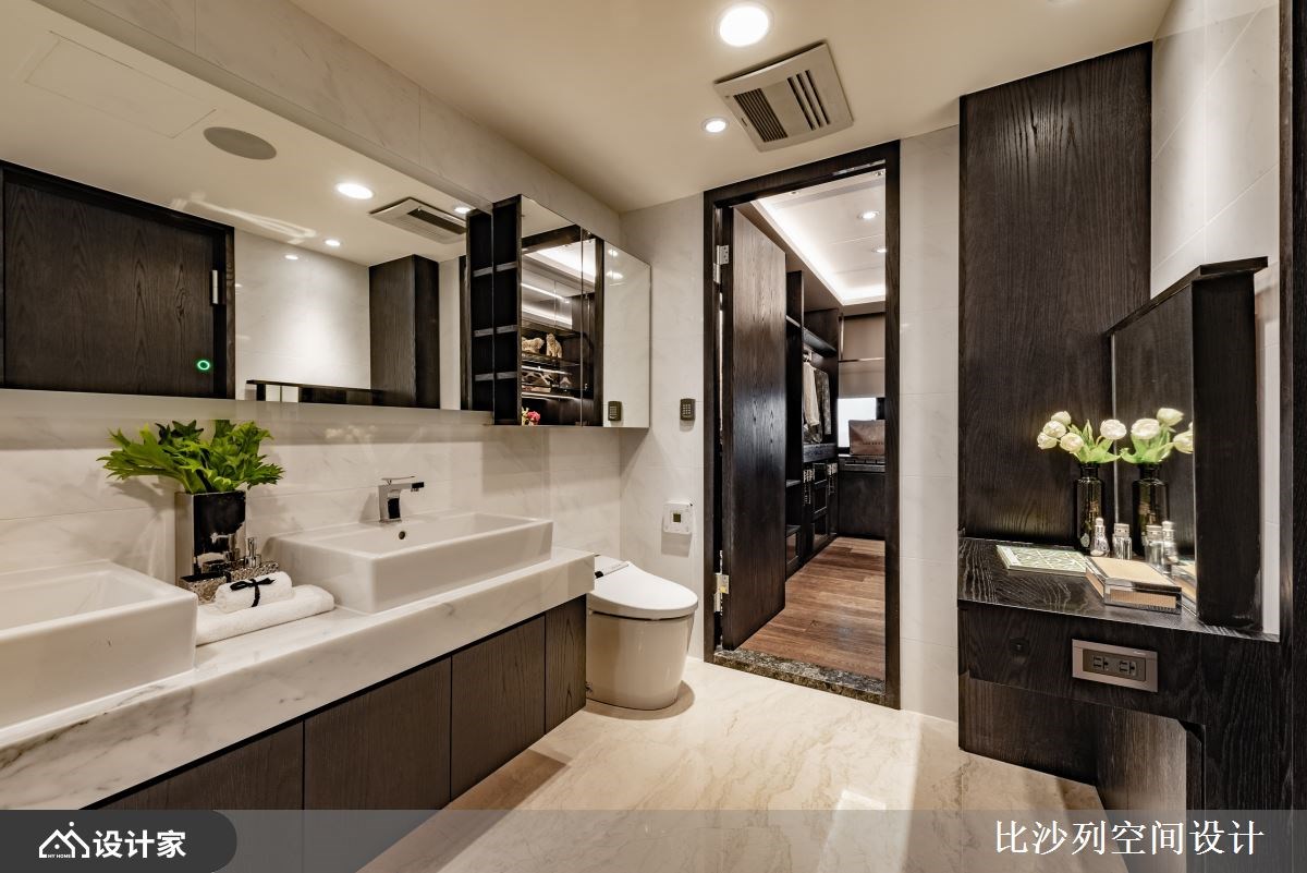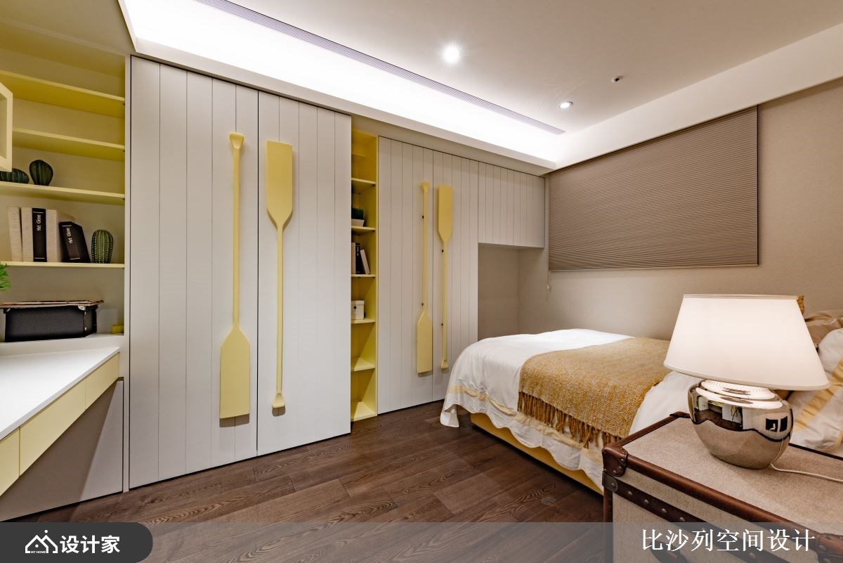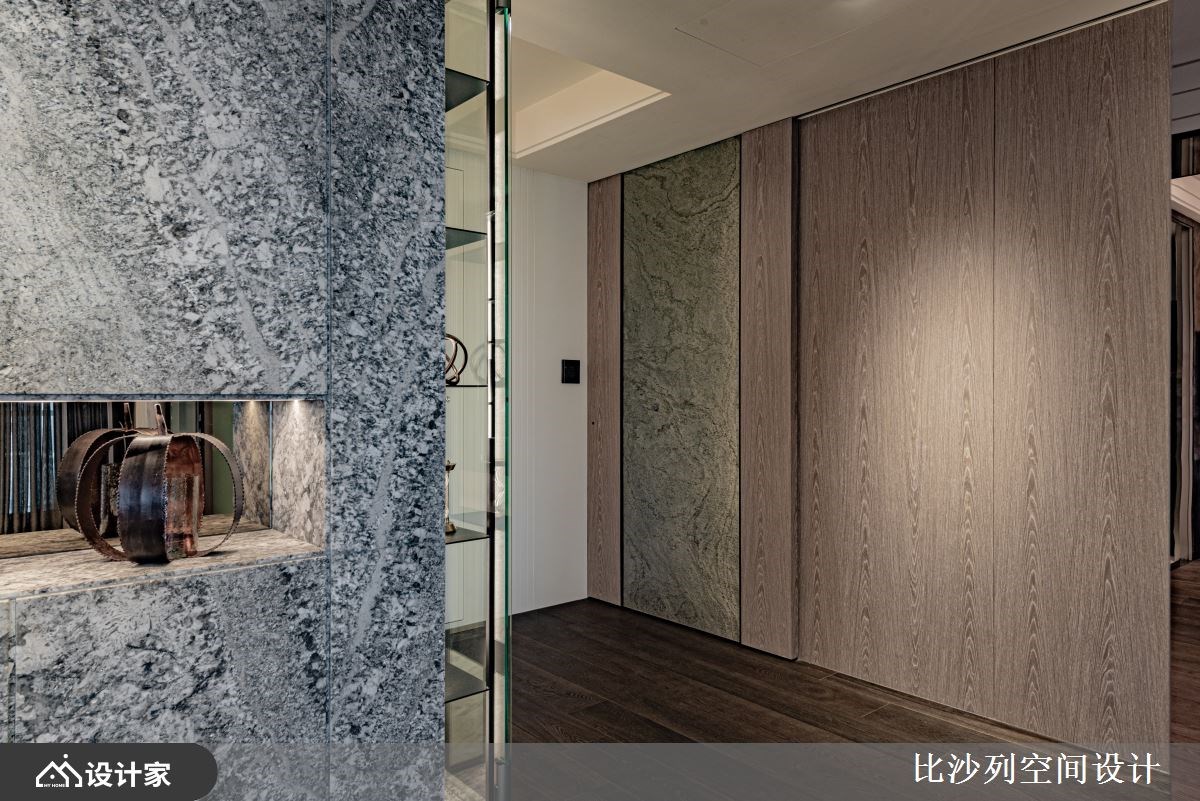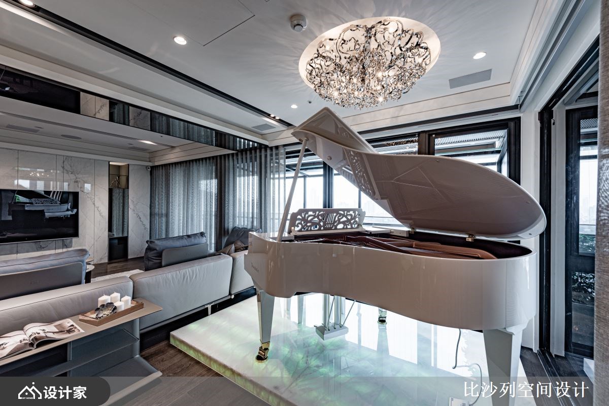 保持隐私和空间开阔的平衡,一直都是豪宅设计中最重要的一环,而这间198平米奢华风大宅,透过一道道推拉门宛如层峦迭嶂般,勾勒出清晰的公私领域轮廓,并且采取异建材的多元混搭,建构出一家四口迎宾自住都舒适的高楼层景观宅。 【大理石地面,刻划姓名与家纹】 走进玄关,各式各样的石材、镀钛以及茶镜,形成一整排的收纳柜与入门端景,拓展出大气磅礡的第一印象,而雕刻白大理石的地面刻划业主的英文姓名缩写与水稻图腾,象征与众不同的家纹设计。公共空间则采取开放式规划,引导明朗的日光和露台绿意入室,搭配天花板的大片茶镜及丰富照明,让空间在沉稳的视觉里,跳脱出光彩夺目的生活诗篇。 客厅电视墙的大理石材为空间挹注透亮的焦点,墙后则是收纳量充裕的书房区域,并藉由透明玻璃门作为动线入口,巧妙减轻了量体的沉重感。接着餐厅摆放白色大理石定制餐桌,奢华的立体灯饰点亮一家人的用餐时光,而一旁隐藏厨房门片的仿石纹特殊漆墙面,与玄关隔间墙的石材花纹神似,带来高雅质感的延伸效果。另外,设计师还特别打造三角钢琴的白玉髓舞台,魔幻灯光随着音乐起舞变化,在家就能拥有Lounge Bar的时尚氛围。 小编的最爱 主卧延续公领域的不凡气韵,皮革纹雕刻板的床头墙、灯笼造型吊灯、收纳精品的玻璃柜,再加上一气呵成的卫浴及更衣间,尽显男女主人高尚的审美品味。两间次卧则融入海洋船舶意象,蓝色的扁舟造型展示柜承载着环游世界的梦想,黄色的船桨造型把手则像是晨曦映照着海面与船身,波光粼粼的平静使人安稳入睡。