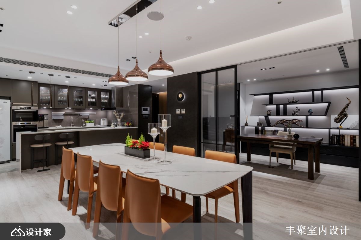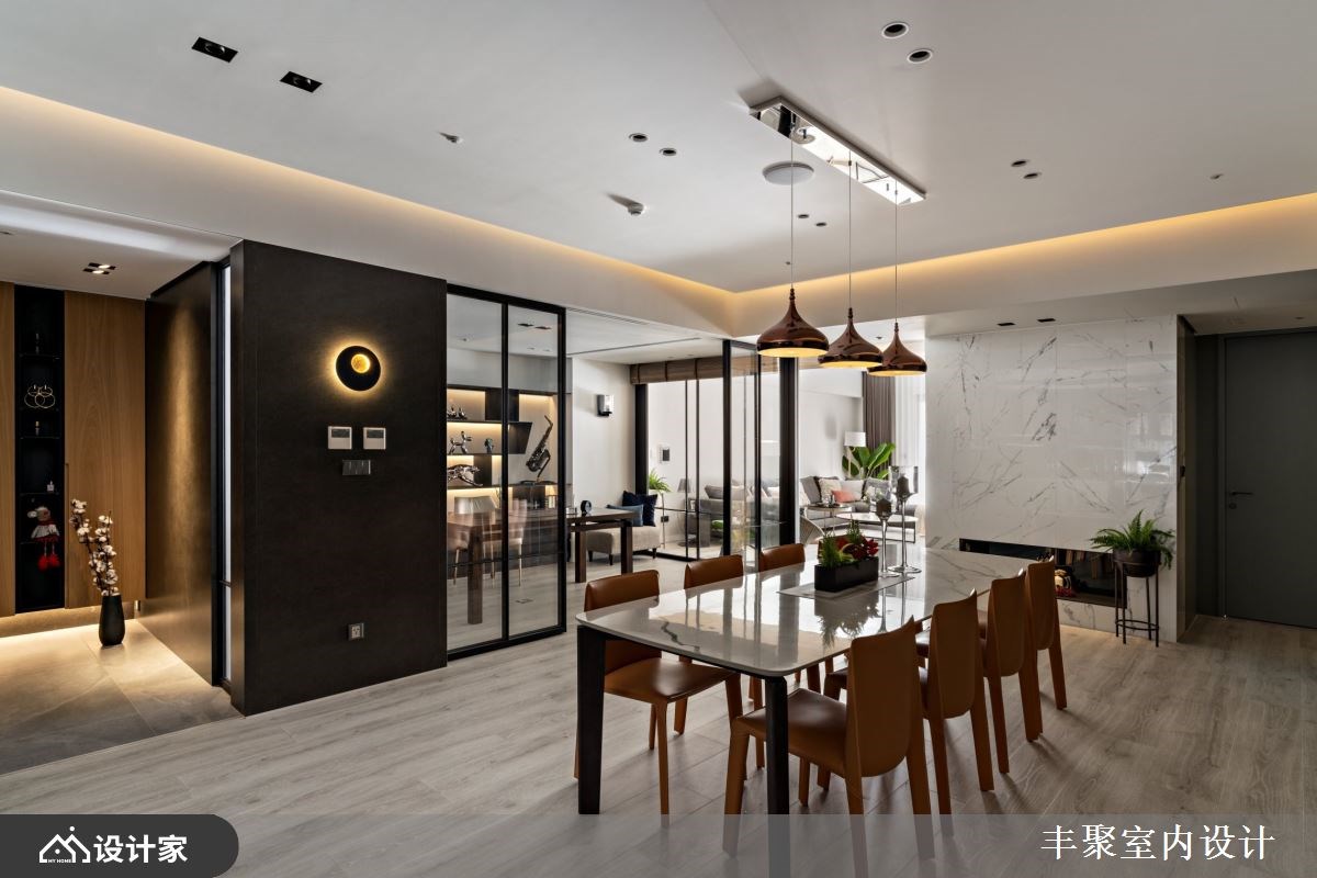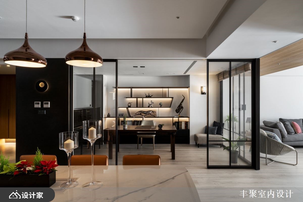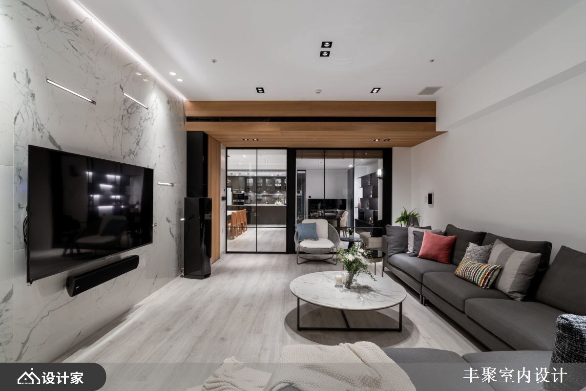 小编带你看好宅 从毛胚屋开始进行缜密的全室规划,67 平方米的豪宅里以流畅的动线与良好采光作为放松生活的基本框架,由开放式中岛厨房为放松舞台向外发散,辅以精致的建材与低调现代的设计细节,替下班后的放松生活带来为完美的即兴演出。 【用现代设计打造蓝调生活】 妥善的空间布局让宽敞的客厅依然能够照耀到自然光线,为保持心理需求的隐私性与视觉体验的通透感,借由轻隔间当作场域之间的分界。开放式厅区中由木皮包覆的大梁收整了吊隐式冷气出风口与维修孔,并顺应造型设计将电器柜与储藏空间结合,化繁复为简约,凸显宽敞空间带给屋主们的轻松与惬意。 建材上从磁砖、花砖到开关面板都挑选进口商品,让建材的质感衬托现代设计,也让身为建筑师的男屋主可以与同业好友在厅区相互交流设计灵感。五居室在门片内部加装隔音材料与隔音压条的双重加强,并辅以灯光增加视听情调,卸下豪宅过度奢华的不安感,不论在自己的居室或客餐厅都能享受蓝调设计的张力。 小编的最爱 把室内设计当作爵士来编曲,黑白灰的沉稳基调下利用木纹与金属设计当作生活节奏的切分音,中岛厨房嵌灯照明植入丰富的变化,四间居室也通过材质比例的分配营造专属的独奏片段,在独具个性的设计下感受到全室风格的和谐,让家人的互动自然生成。