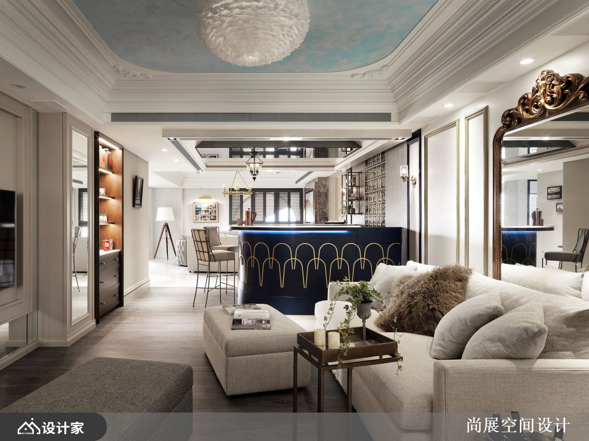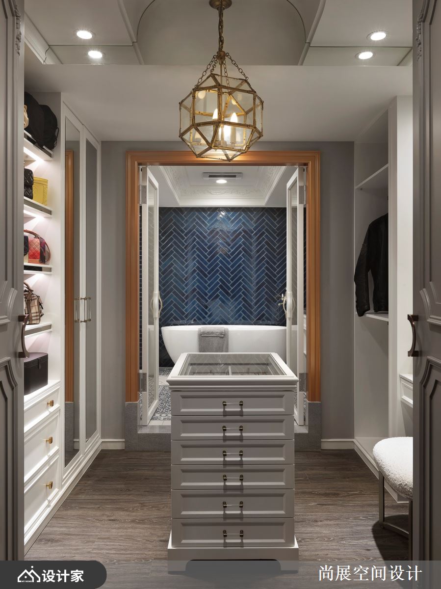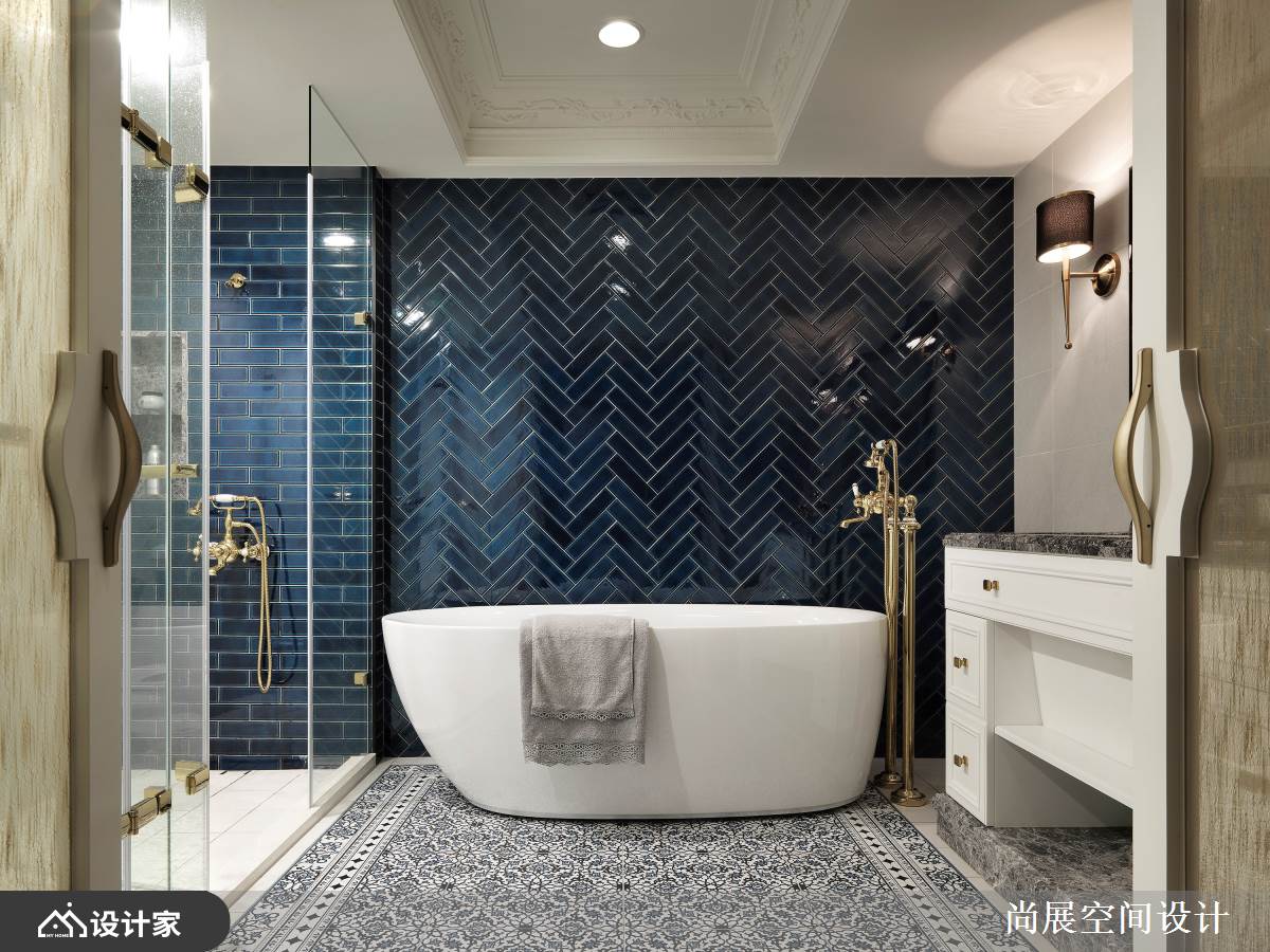 小编带你看好宅 此间新古典大户型,对应着轻熟龄女子的品味格调,处处体现精致卓越的美感,全面使用顶级建材、名品家具来烘托尊爵品味,透过灰色系的协调,将多样化材料串连成一致优雅的步调,再加以藏青蓝跳色、金色凝聚奢华感,让华丽感更加立体,快跟着小编一起来看看吧! 设计师发挥「异材质」、「色彩心理氛围」的高超掌握度,在无墙面的格局之下,分隔每个专属开放空间,打理出招待交谊区域的层次感,并采取美式新古典的方式呈现,为了呼应女业主的高雅气质,带入时尚的金色色调,让耀眼的金在卫浴设备、镜子、灯具、线条滚边等细节处现身,展现低奢氛围;而主卧室的双开门与天花板上的繁复雕花,则体现了公主的细致典雅,并妥善安排按摩椅的位置与款式,与整体无为和相融,呈现风格与视野的和谐。 小编的最爱 卫生间空间也展现女主人的魅力,透过浪漫花砖、纹理深邃的大理石与深蓝V型砖,描绘出女主人的纤细、大器与利落!