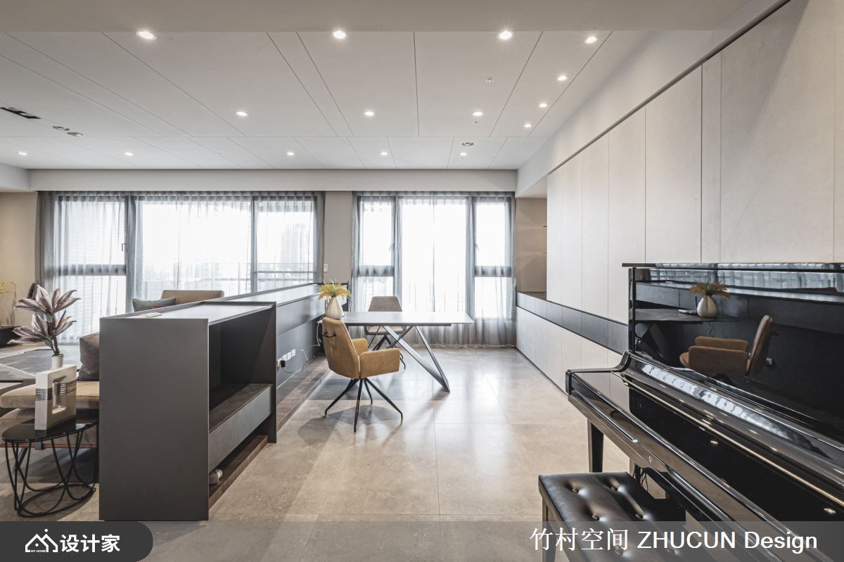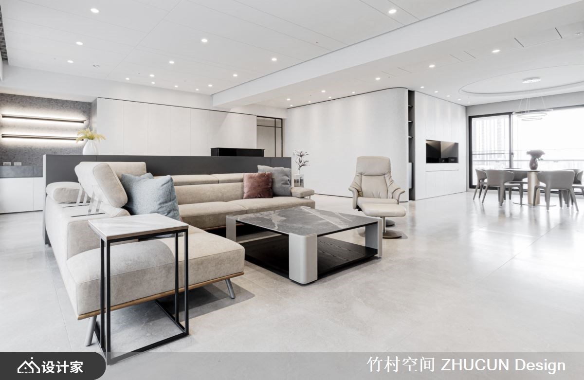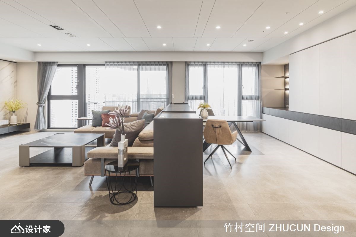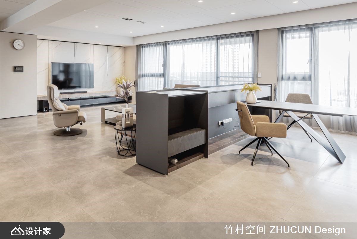 172 平米新成屋空间宽敞、採光极为充裕,设计师以黑、白、灰三种色彩元素,铺陈出简约风的时髦与舒适。公领域运用开放的格局安排,不清楚划出领域范围,彼此共享空间,发挥大坪数住宅与採光优势,放大生活机能与空间尺度。 玄关木质地坪揭开温润的居家生活气氛,并透过材质的转换变换各领域氛围。採光充裕的公共空间予以落地窗,衬托大坪数场域,并不刻意划分明显的领域范围,亲友聚会能共享客厅、餐厅、书房的延伸区域。书房与客厅之间,透过一座矮牆作为简单的隔屏,沙发背牆厚实有依靠,面向书桌则设计为抽屉式收纳,争取收纳空间,并选择金属钢板材料,营造轻薄无负担的视觉感。 小编的最爱 餐厅领域为避免收纳高柜产生屋主介意的锐利角度,设计师饰以圆弧状呼应天花板与圆形餐桌;并妥善发挥双面採光的屋况优势,让客厅、餐厅使用者能坐收不同的生活风景。
