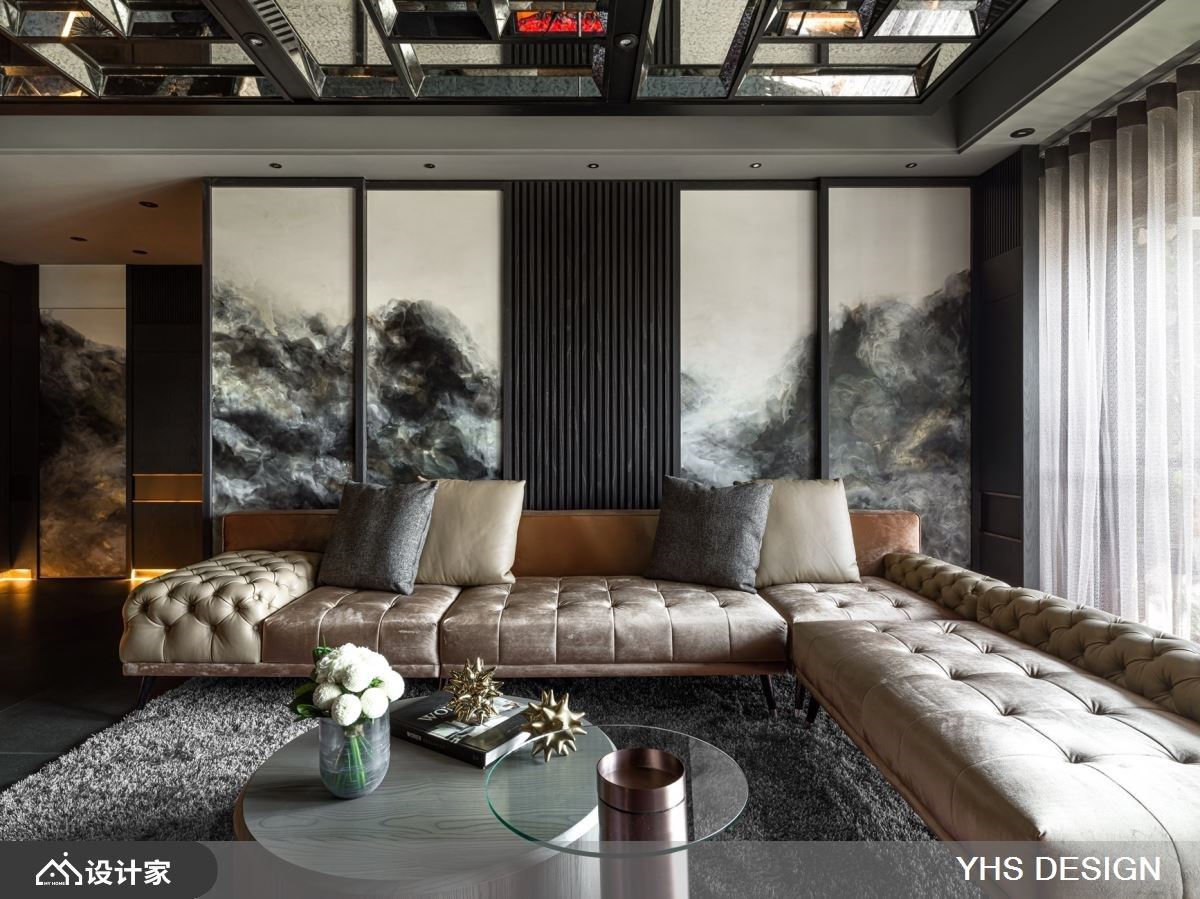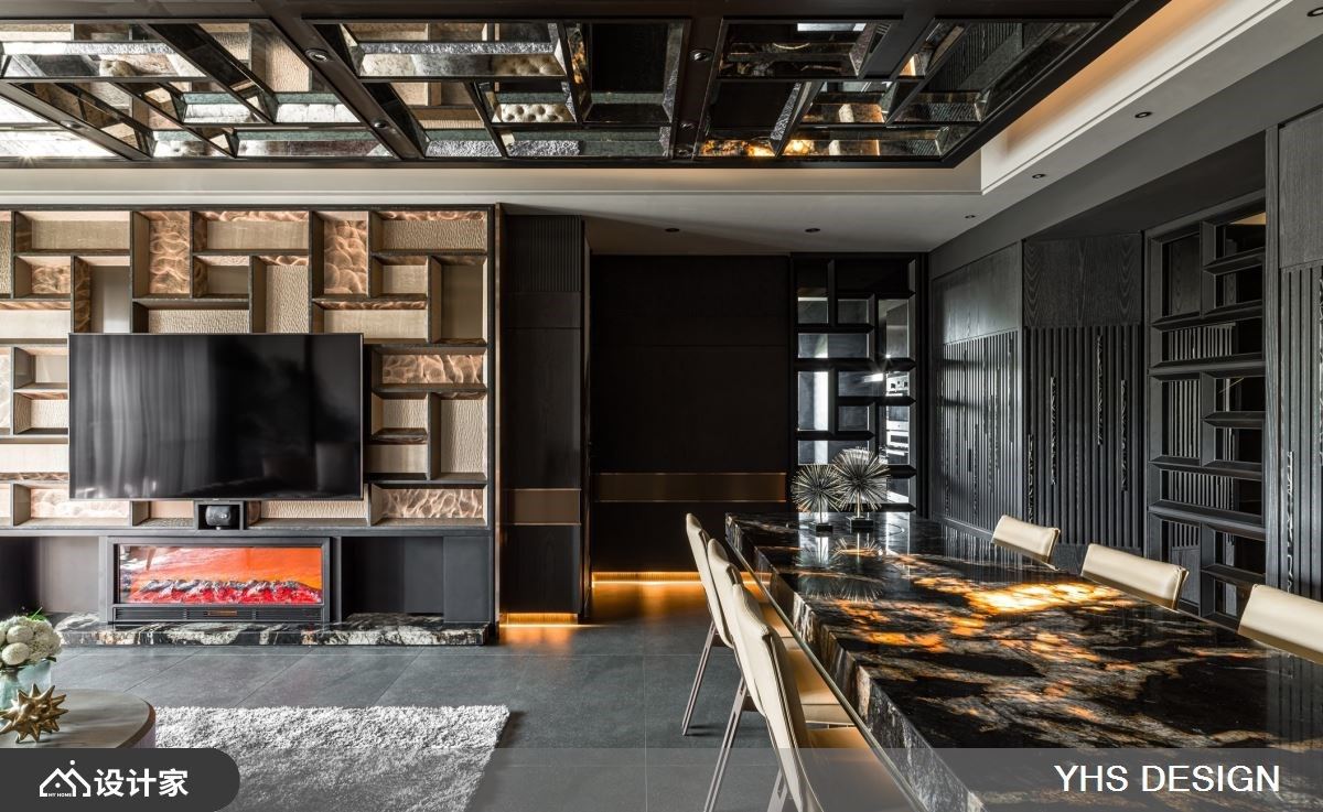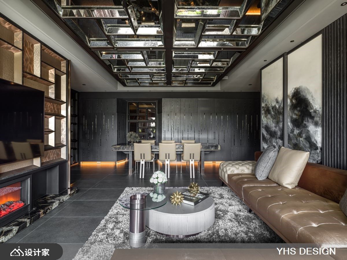 一走进客、餐厅领域,天顶上的镜像视觉、电视牆线条视觉丰富的镀钛金属与精緻光氛营造,揭示豪宅设计的极致奢华;大面落地窗带来充沛的日光,窗外不被空间限制的奔放大型枯木造景,与沙發后方的泼墨牆辉映成趣,大量自然元素不停涌入生活,让绚丽的建材、浮夸的造型与居家空间取得平衡。