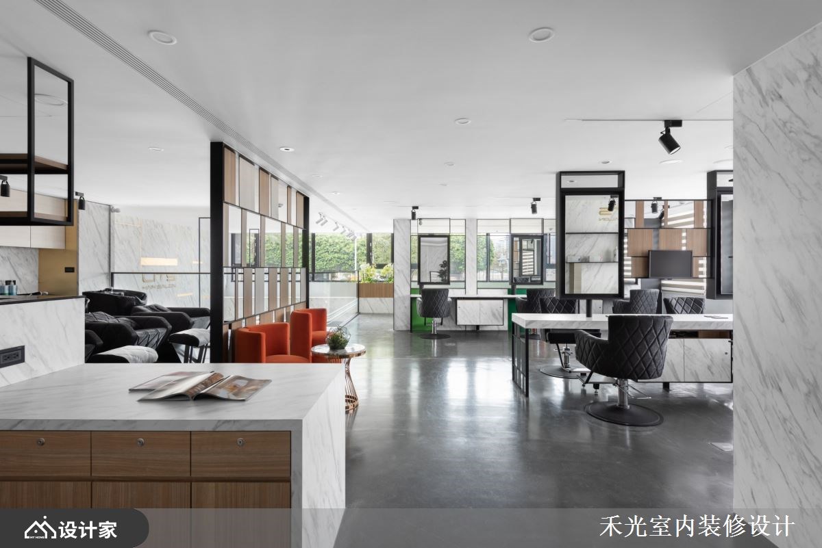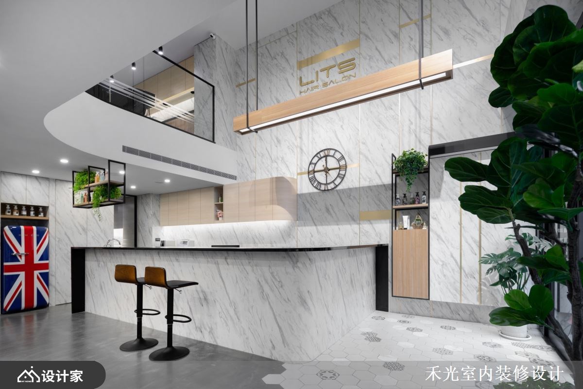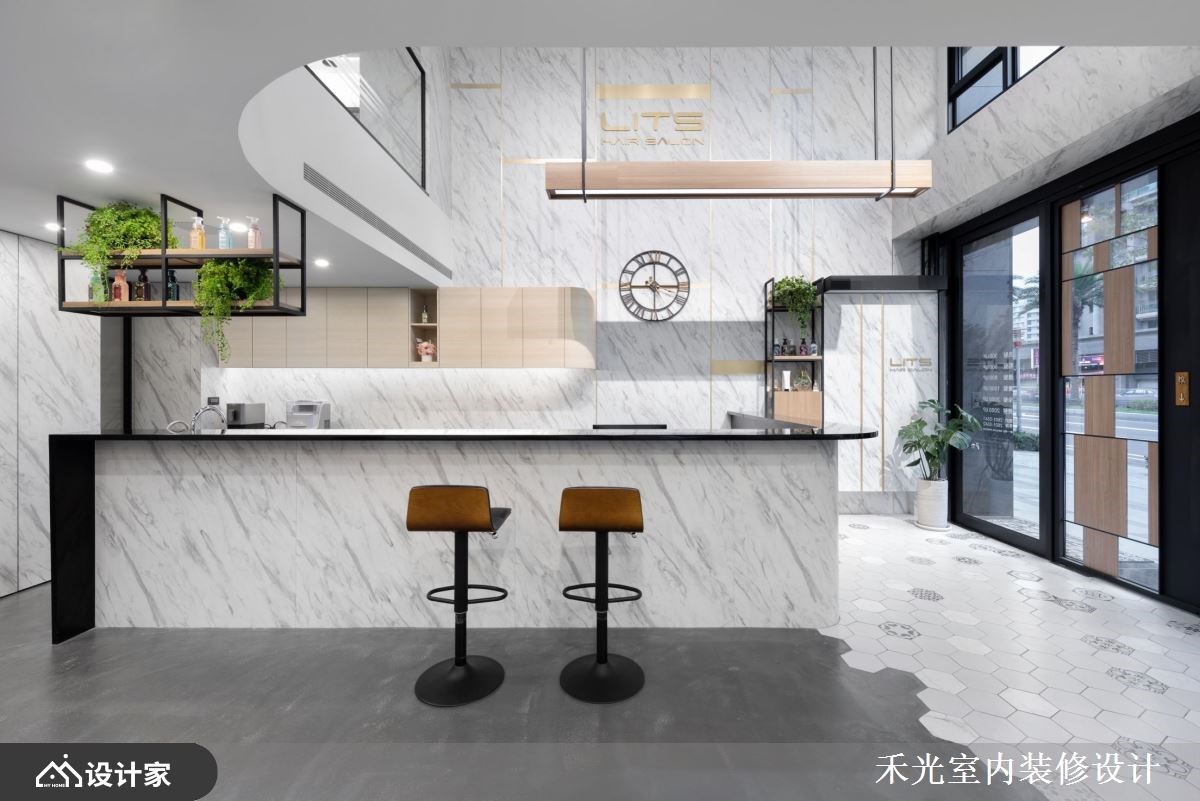 推开玻璃大门后明亮透白的视觉感受搭配着跃层挑高设计,有别于一般灯光昏黄、色调暗黑的商业空间,将神清气爽的空间氛围传递给上门的客人。发廊大厅与柜台大量运用异材质拼接,从白色六角砖拼贴延伸与速泥抛光地坪交织;石纹美耐板由一楼立面向上延展至二楼空间,轻柔的灰白石纹板间镶嵌了精致的黄铜元素,并将居家空间的餐厨吧台概念融入发廊柜台设计内,并将绿意透过植物布置带入室内空间,让人卸下杂乱的心情,期待着准备迎接新发型。 【材质混搭形塑靓白现代发廊】 80平方米大的跃层发型空间中蕴藏许多细节,雷射切割铁件的锐利下,透过流线型沙发与、发型椅以及二楼切面的弧形设计做出刚中带柔的空间设计。在材质运用上,理发区的座位区域用铁件烤漆、石纹及木纹美耐板替现代俐落风格定调;沙发椅凳和其他软件挑选上借由绒布搭配地毯做出柔美调性,平衡理发空间里镜面带来的距离感。开放式空间里,利用铁件搭配木纹美耐板规划出发廊必备的洗头区,错落的排列设计让视线维持通透同时照顾到顾客躺着洗头时需要的隐私性。 小编的最爱 跃层挑高宽敞的空间感搭配现代科技材质展现俐落前卫的空间氛围,但设计团队巧妙地运用材质转换丰富空间表情,并在亮白色基调下悄悄透过单椅、植物软件设计将橘色、绿色等鲜艳色系带入空间中,搭配落地玻璃引入的良好采光下,让顾客能在现代风格的设计发廊里能找到安心与亲切感。
