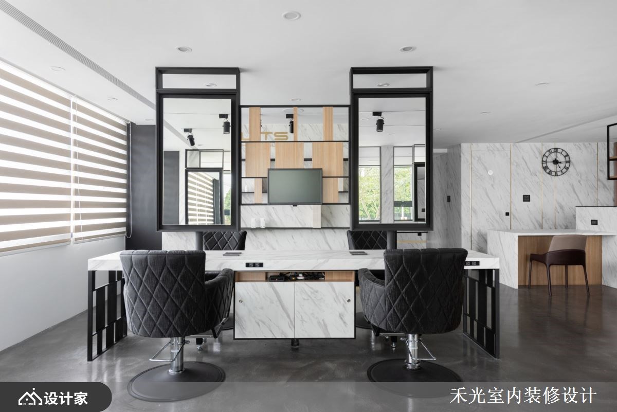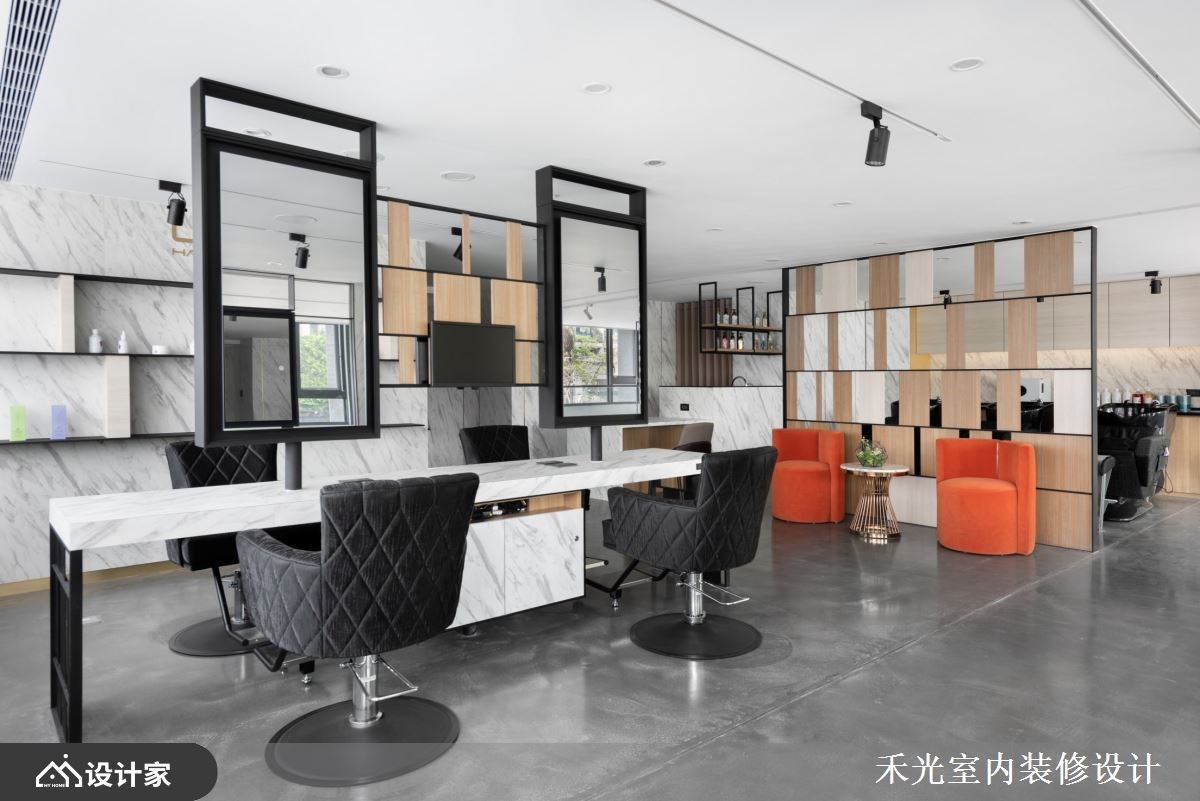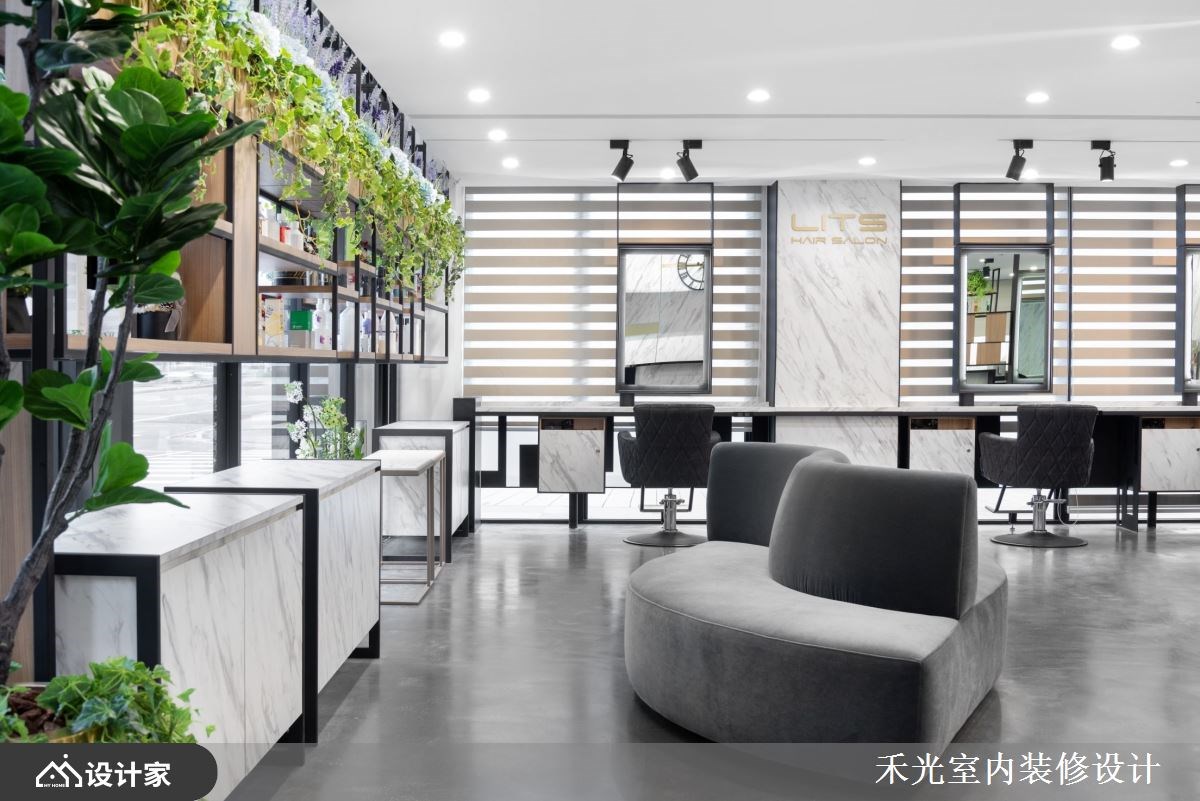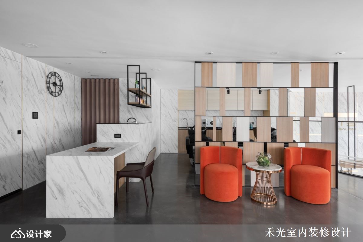 推开玻璃大门后明亮透白的视觉感受搭配着跃层挑高设计,有别于一般灯光昏黄、色调暗黑的商业空间,将神清气爽的空间氛围传递给上门的客人。发廊大厅与柜台大量运用异材质拼接,从白色六角砖拼贴延伸与速泥抛光地坪交织;石纹美耐板由一楼立面向上延展至二楼空间,轻柔的灰白石纹板间镶嵌了精致的黄铜元素,并将居家空间的餐厨吧台概念融入发廊柜台设计内,并将绿意透过植物布置带入室内空间,让人卸下杂乱的心情,期待着准备迎接新发型。 【材质混搭形塑靓白现代发廊】 80平方米大的跃层发型空间中蕴藏许多细节,雷射切割铁件的锐利下,透过流线型沙发与、发型椅以及二楼切面的弧形设计做出刚中带柔的空间设计。在材质运用上,理发区的座位区域用铁件烤漆、石纹及木纹美耐板替现代俐落风格定调;沙发椅凳和其他软件挑选上借由绒布搭配地毯做出柔美调性,平衡理发空间里镜面带来的距离感。开放式空间里,利用铁件搭配木纹美耐板规划出发廊必备的洗头区,错落的排列设计让视线维持通透同时照顾到顾客躺着洗头时需要的隐私性。 小编的最爱 跃层挑高宽敞的空间感搭配现代科技材质展现俐落前卫的空间氛围,但设计团队巧妙地运用材质转换丰富空间表情,并在亮白色基调下悄悄透过单椅、植物软件设计将橘色、绿色等鲜艳色系带入空间中,搭配落地玻璃引入的良好采光下,让顾客能在现代风格的设计发廊里能找到安心与亲切感。