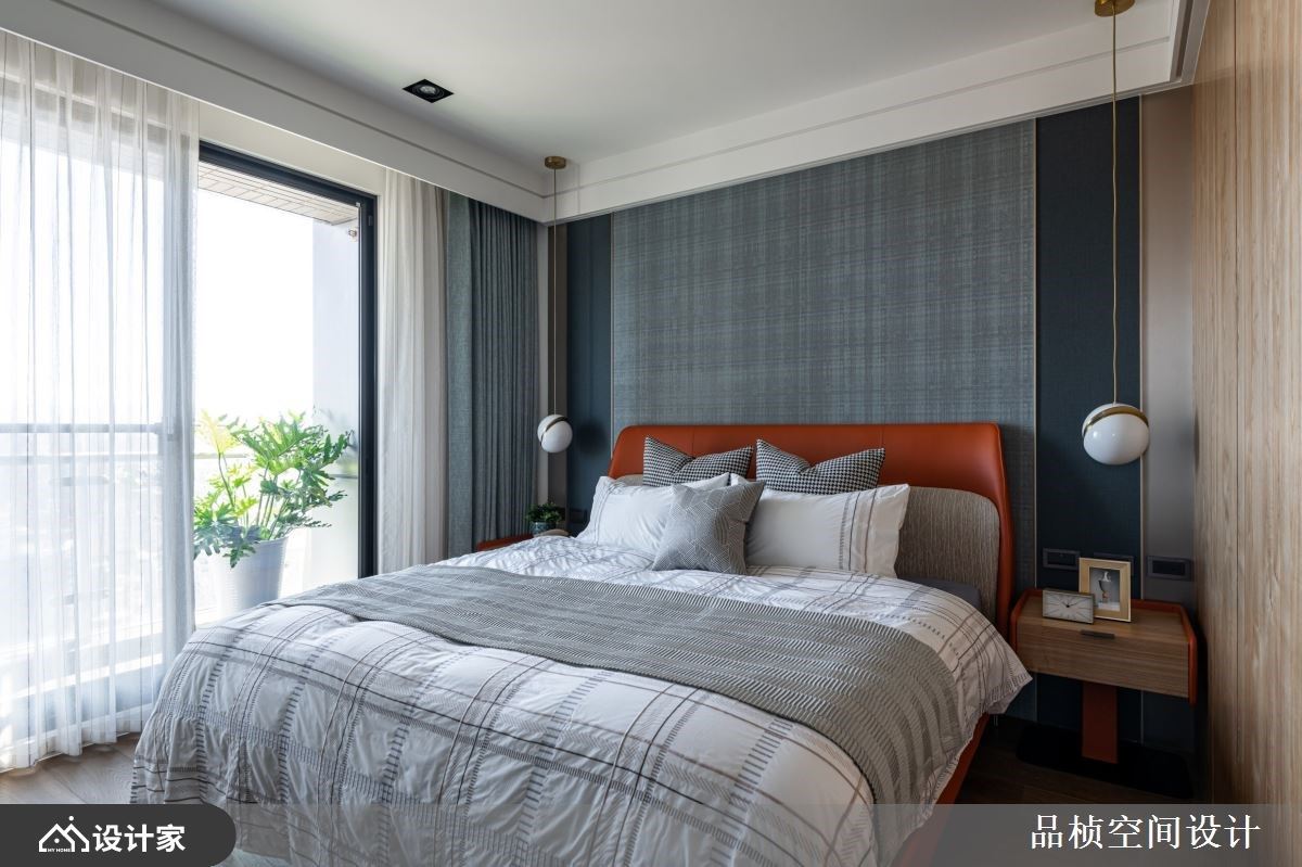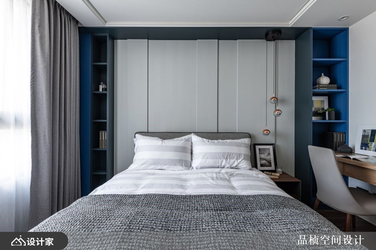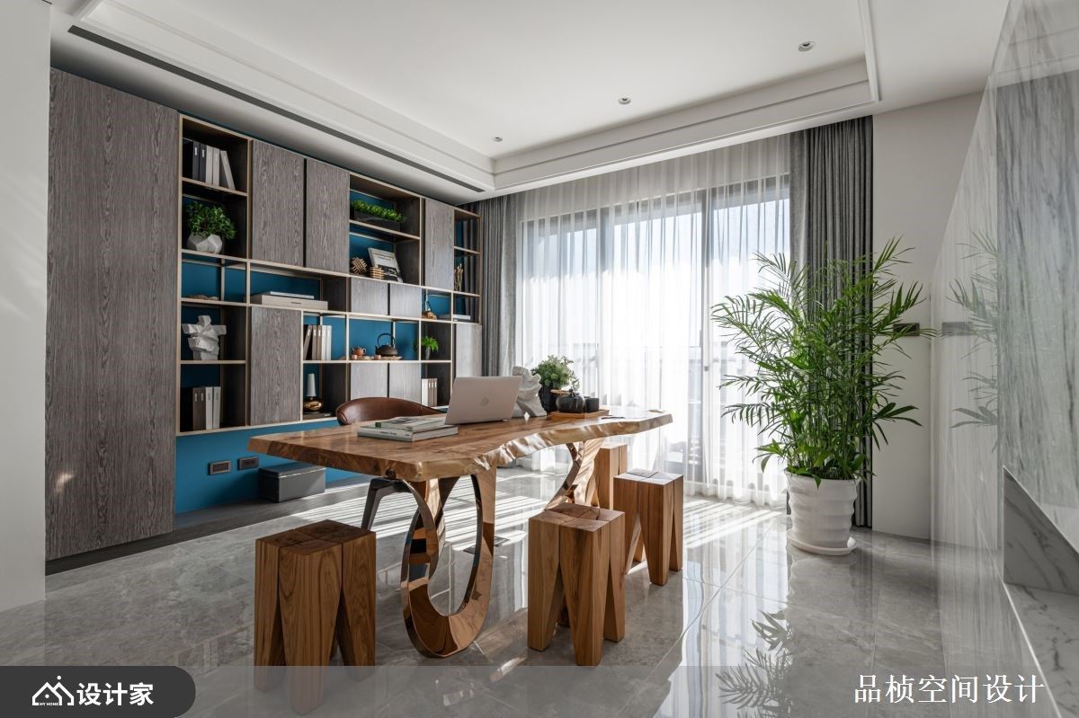 屋主拥有非凡品味,平时喜爱插花、品茶等雅致风趣,加上拥有衣服等生活物件庞大的收纳需求。设计师透过异材质的堆栈,刻划出精致且大器的雅居,并特别规划空间陈列屋主创作的花艺美学,感染自然人文气息;也透过大量灵活变化的柜体设计,满足日常收纳同时兼具美感层次。 石材电视墙界定客厅与书房,半高的墙面让公领域保有通透与对话,沙发背墙以高低木纹、茶镜错落拼接而成,茶镜两侧搭佐LED灯,形塑具层次、光影的美学立面;延续L型沙发摆设,梁下窗边则打造飘窗,增添休闲慵懒气息;餐厅与客厅之间透过凹凸不规则的石材壁面为界,让画作、花艺、石材矮桌创造出端景墙,衔接背墙与入室后的展示收纳柜。书房领域以不修饰的自然原木桌,下方搭配金属弧型脚架,展现异材质混搭新意;后面书柜结合木纹门片,以及金属元素为架构的开放展示空间,随着茶器、书籍、植栽等陈列,形塑一面人文美学色彩的主题墙。 小编的最爱 延续公领域的特质,私领域透过内敛的灰、黑与木纹为基底,利用木纹、铁件的元素安排,营造出简约自然的现代风尚。