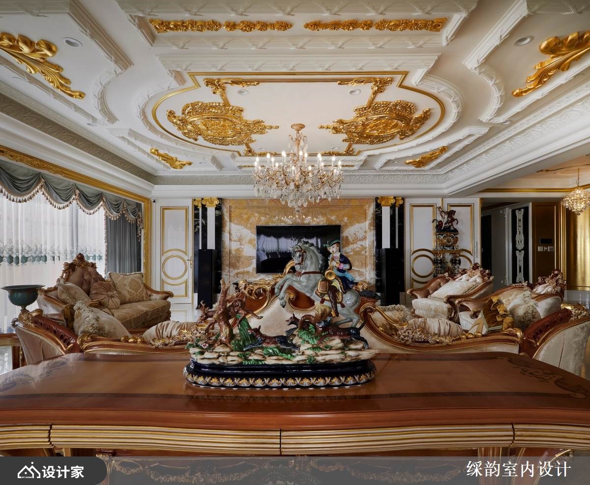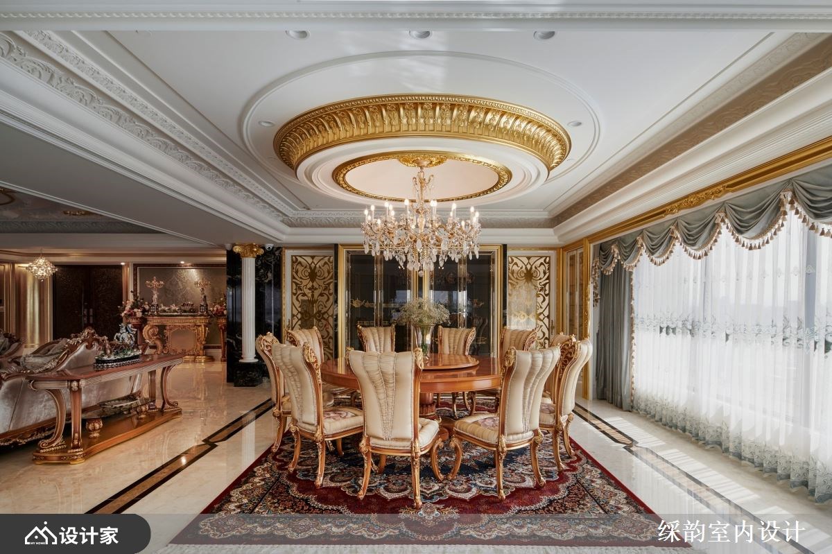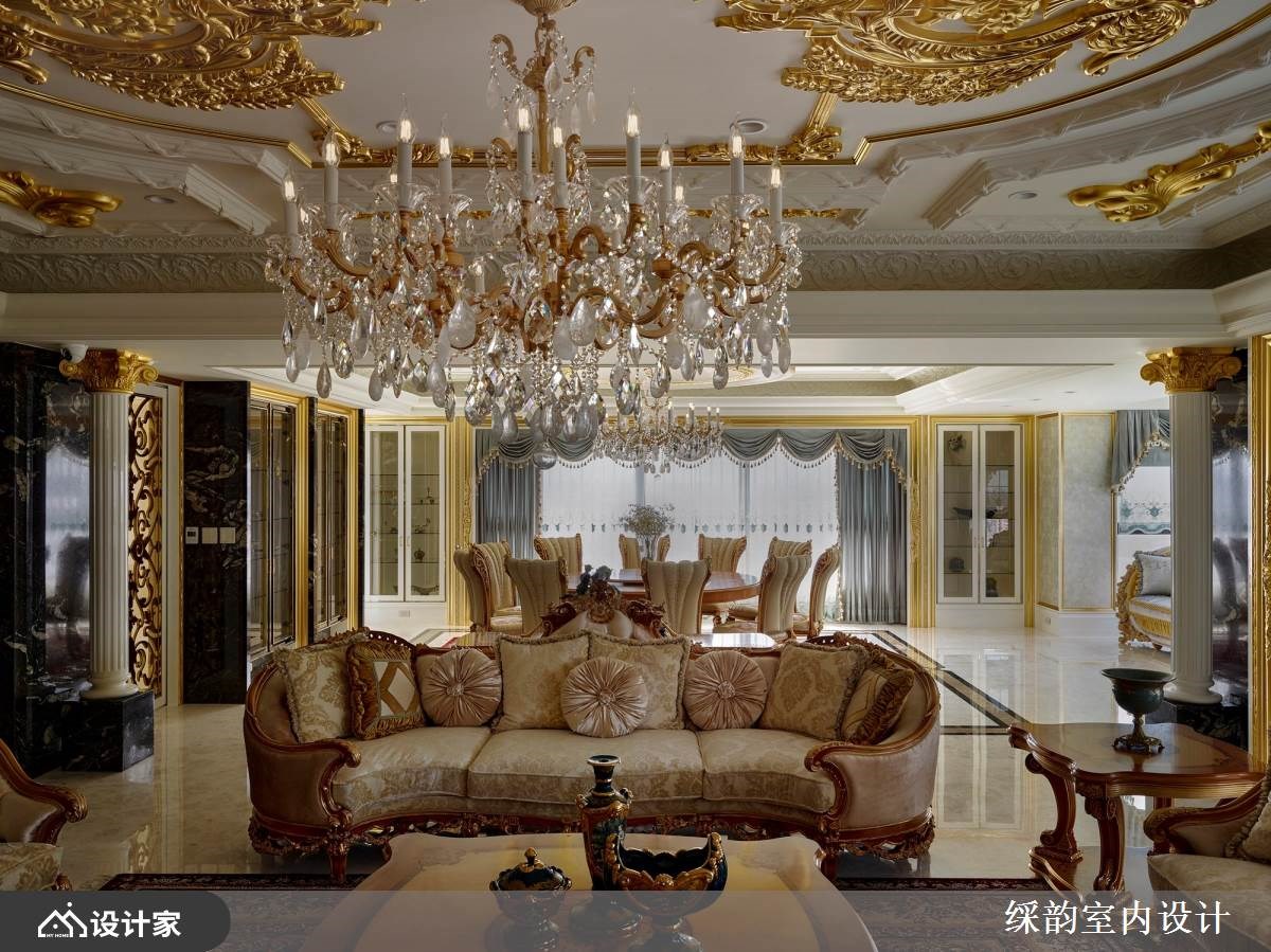 跨越世纪的设计巧思,䌽韵室内设计将 6600 平米大的毛胚屋精雕细琢后,仿佛将时代迁移到了中古世纪欧洲,重现欧式古典贵族的宫廷生活。玄关通往厅区的廊道如同凡尔赛宫的镜厅设计,透过动线布局引导视线落在端景的壁画艺术上,优雅中带着严肃贵气的氛围弥漫在廊道空间。经典罗马式爱奥尼克柱以对称组合镶嵌于客厅电视墙,衬着橘子玉大理石材凸显空间尊贵气质。 【欧式古典风华再现】 汲取 17 世纪巴洛克风格代表性的穹顶与艺术工艺,精致而轻巧纤细的雕花设计攀附于餐厅天花,华丽洛可可风格水晶灯悬吊在圆弧形轮廓,在欧式古典设计中流露中国传统团圆的寓意。配色上大量使用金箔增添浓烈的华丽风情,戏剧性光线配置刻画出空间里的强烈对比,展现超凡脱俗的豪宅气度。 针对三代同堂的生活需求,私领域连带起居室让私领域机能全面升级,打造专属阅读空间以及孩子们的游戏区。居室金色与米色交织贵族气质,墙面利用媲美丝绸质感的墙纸装饰,而令人惊艳的艺术床头雕饰在空间中华丽绽放,搭配欧式古典壁灯形塑浪漫优雅的宫廷风格。 小编的最爱 此案着重于室内装饰艺术的表现,有别于一般豪宅设计的用材与设计逻辑,䌽韵室内设计把空间当成立体艺术品在规划,繁复华丽的雕饰簇拥着空间,形塑超越真实感的梦幻氛围。在生活机能之下强调华贵的豪邸气魄,连同家具与艺术装饰都带着古典雕刻艺术,透过硬装到软装在现代空间围塑出欧式古典情怀。